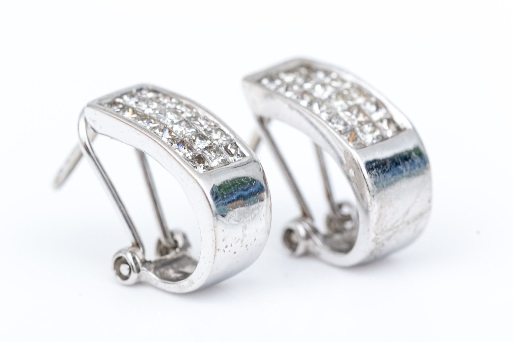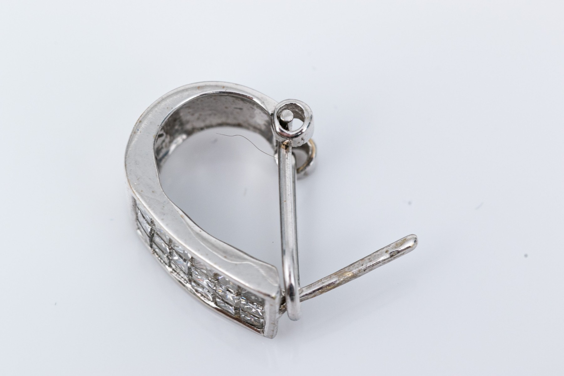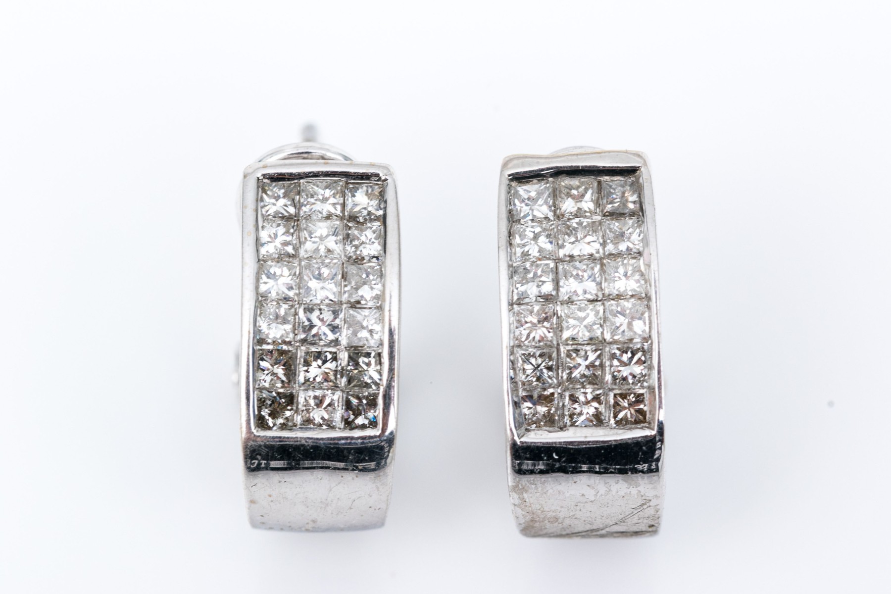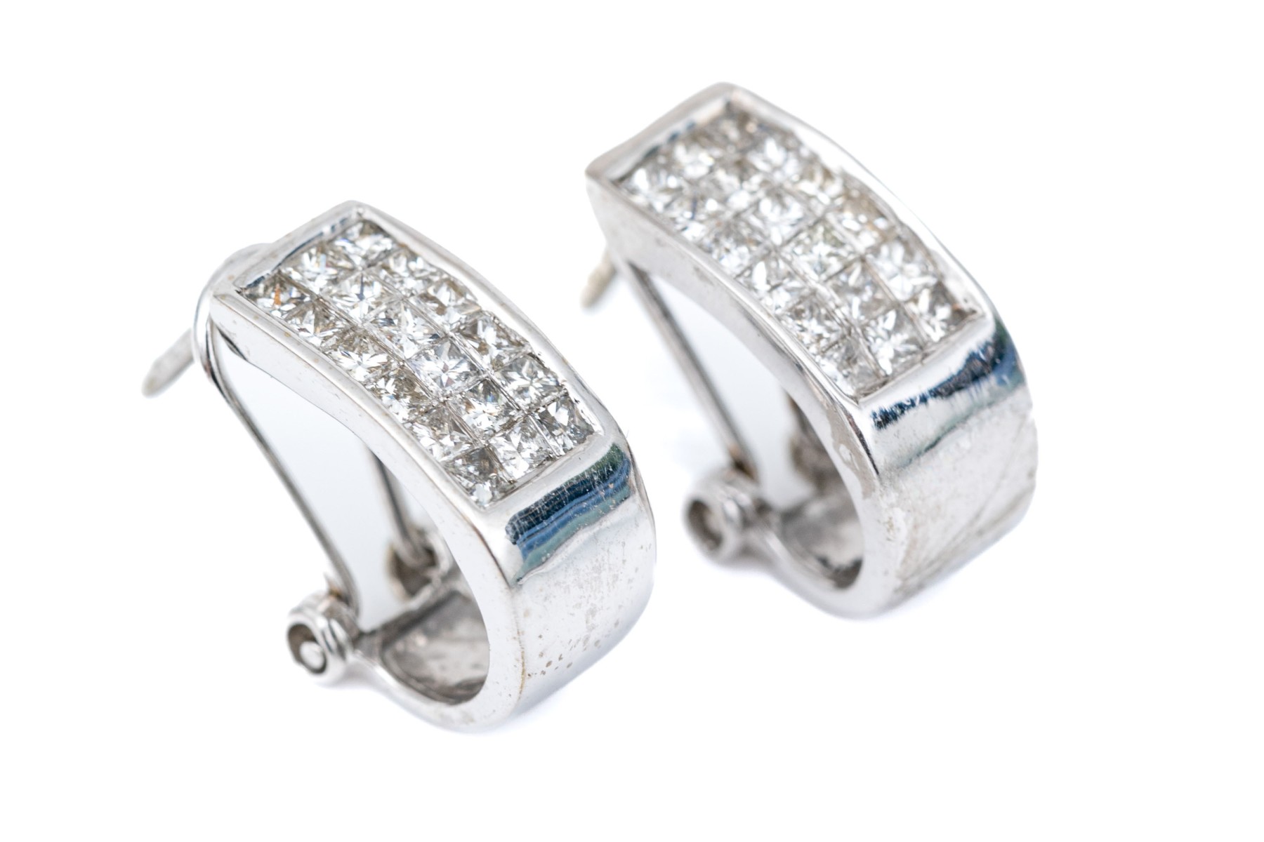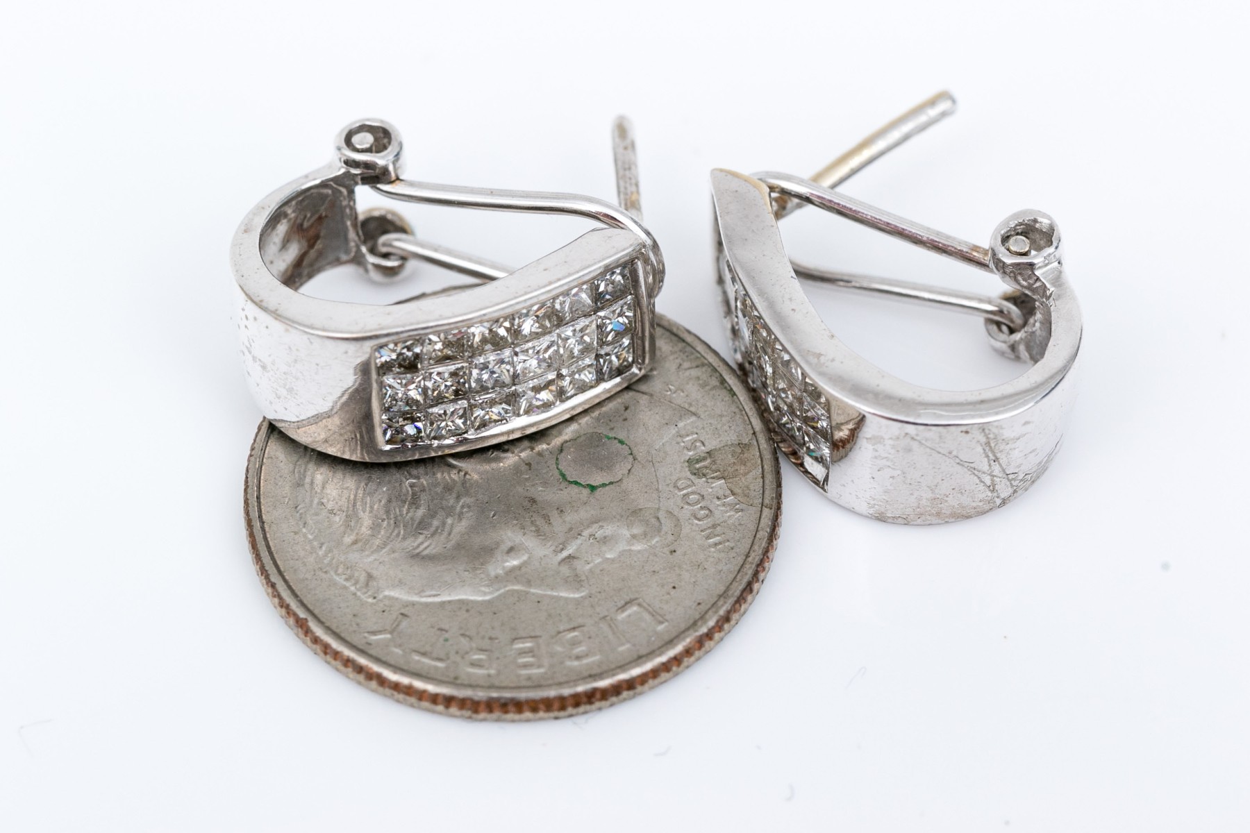 14k white gold contemporary princess cut moissanite "J" hoop huggie earrings, finished with posts and omega style backs