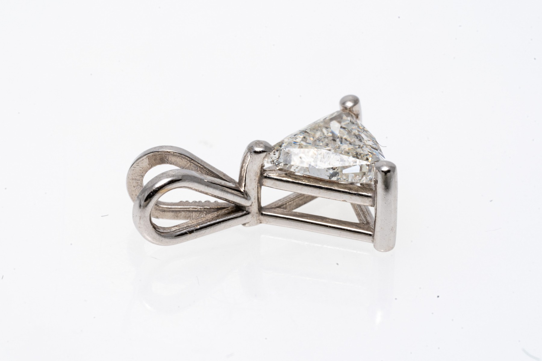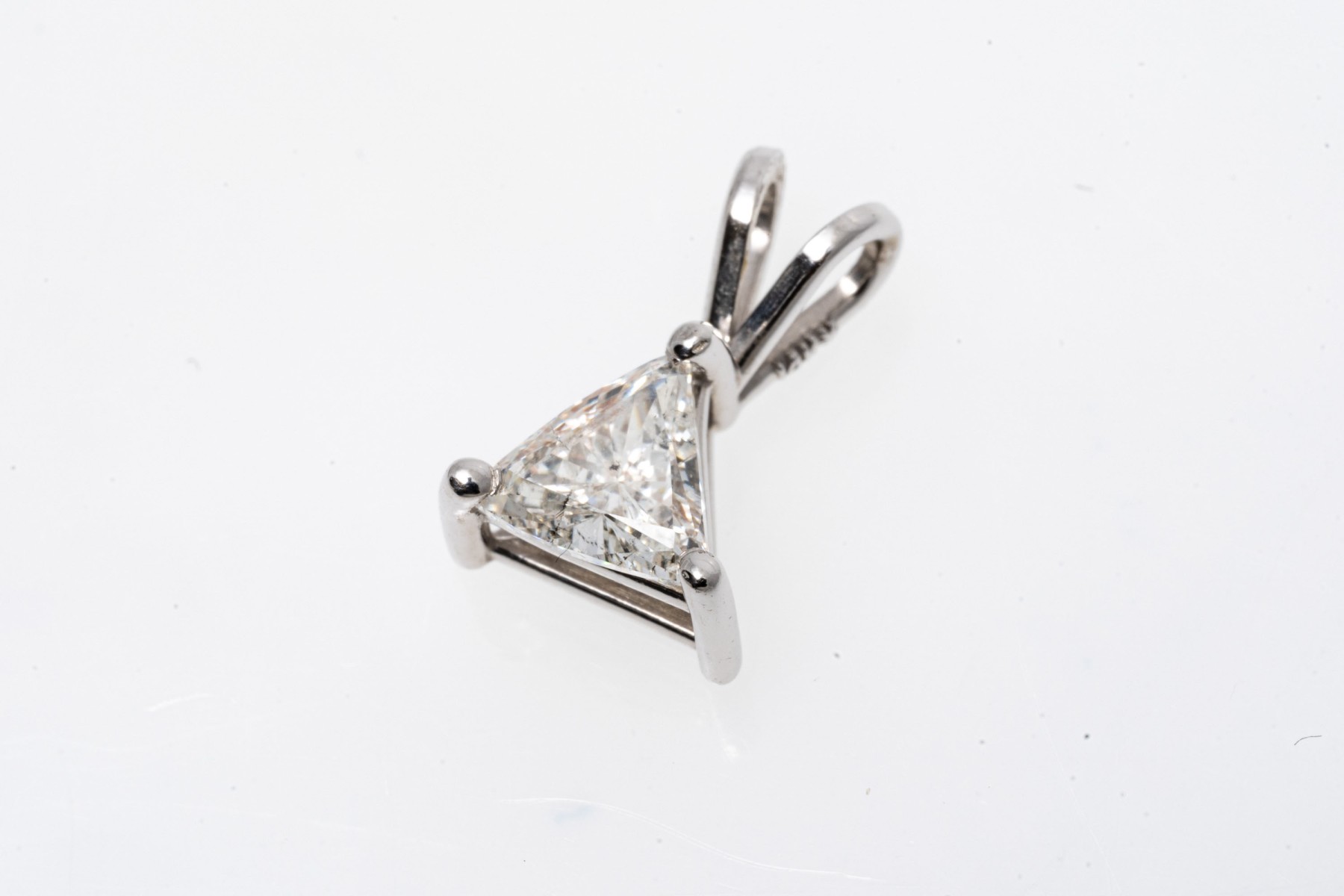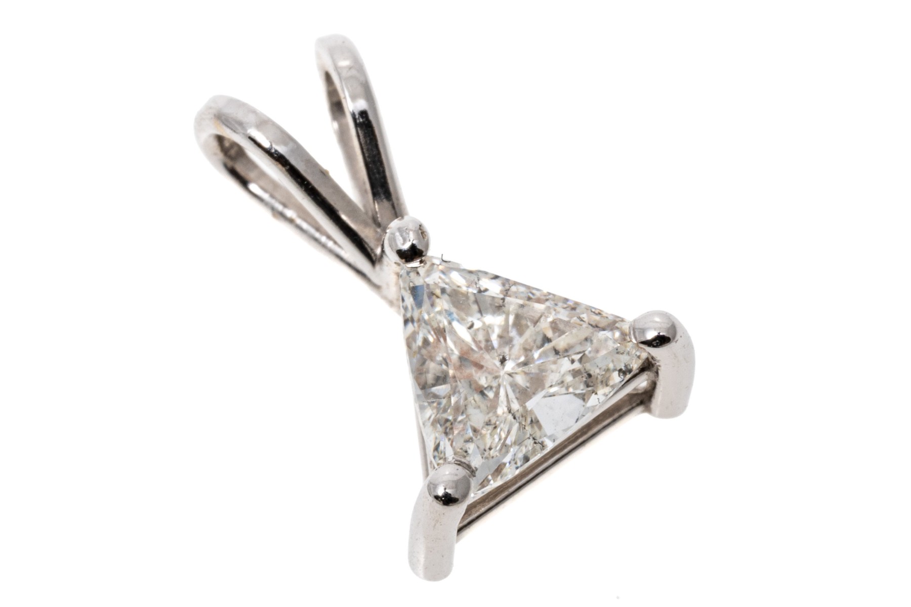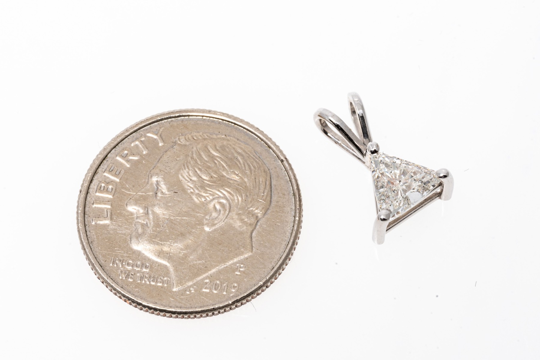 14k white gold contemporary trillion faceted diamond solitaire pendant, approximately 0.035 CTS, prong set and finished with a rabbit ear style bale