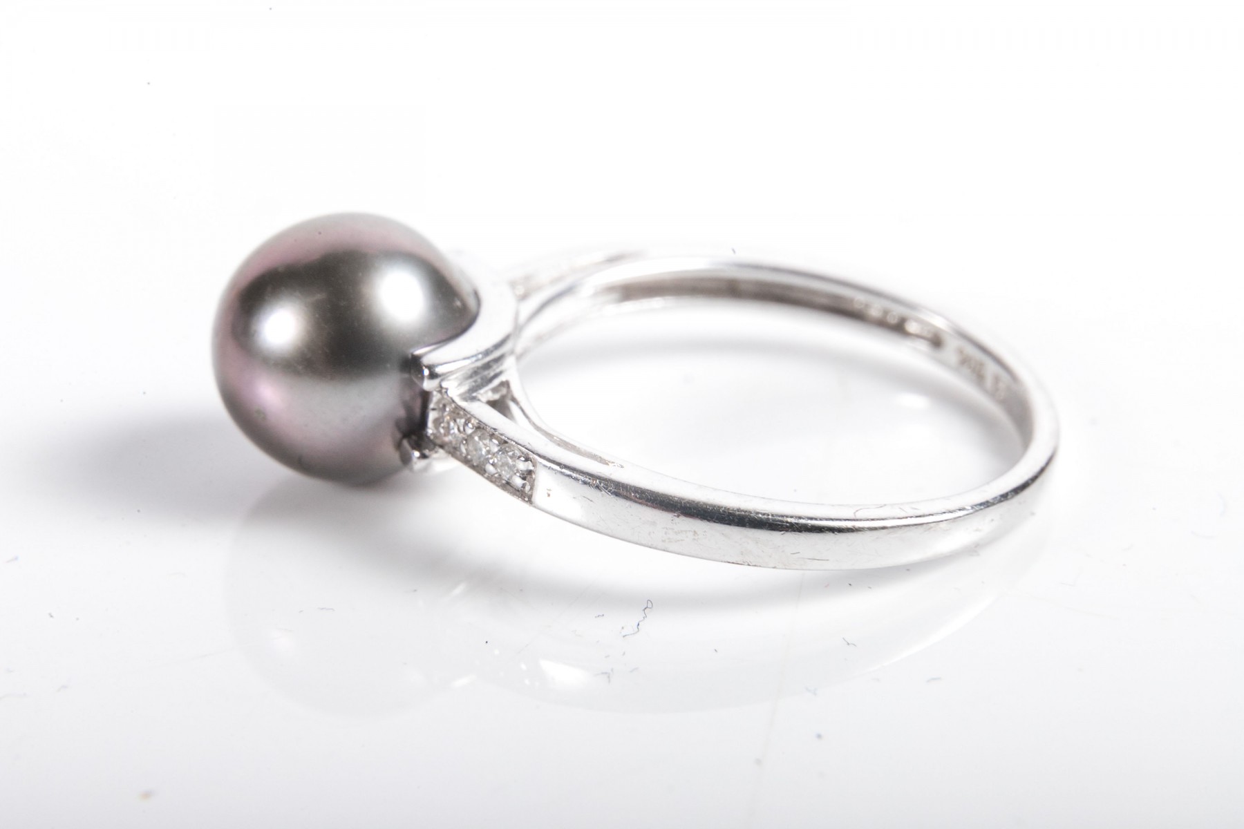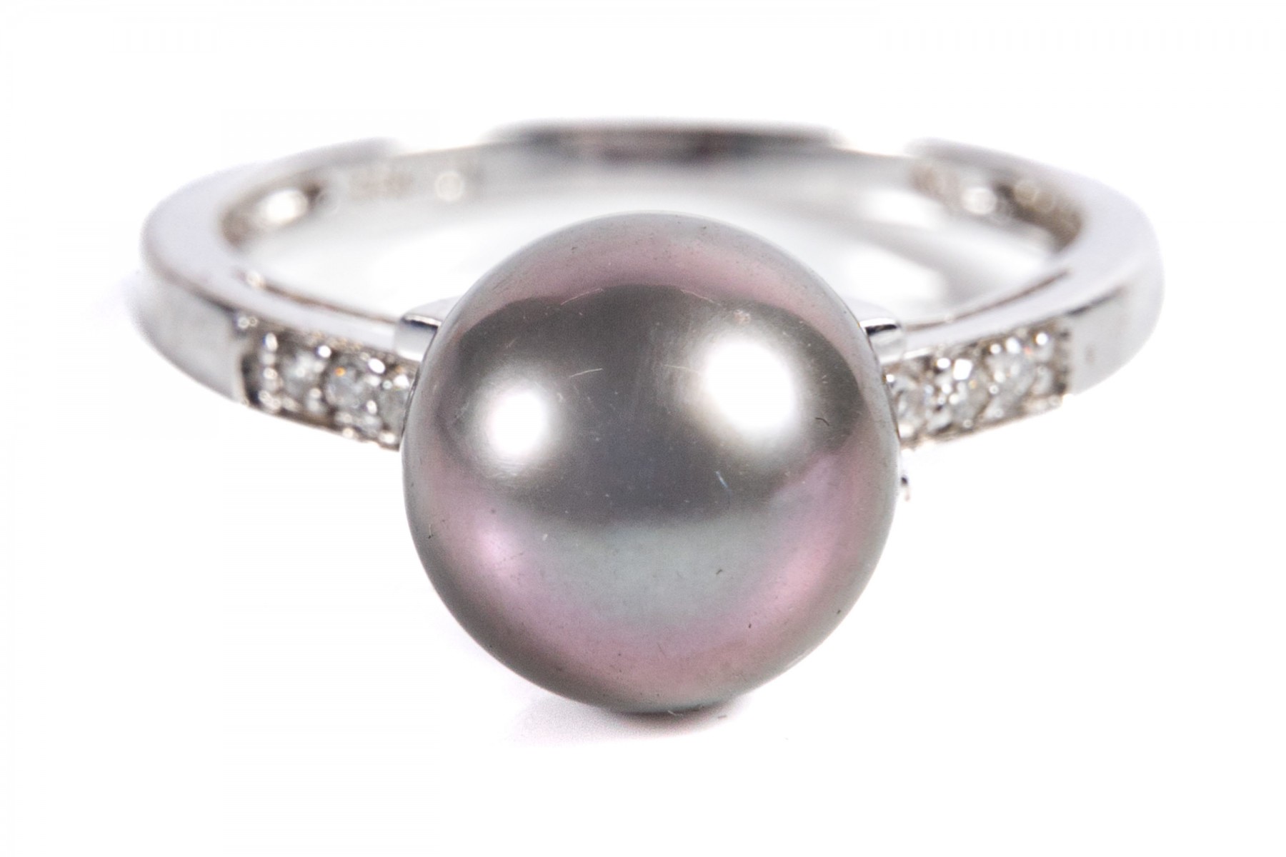 A gorgeous white gold ring displaying a steely black cultured pearl with iridescent hues of orange, green, and blue. The pearl sits on a sleek U-shaped undergallery, flanked by dazzling channels of diamonds on high shoulders.