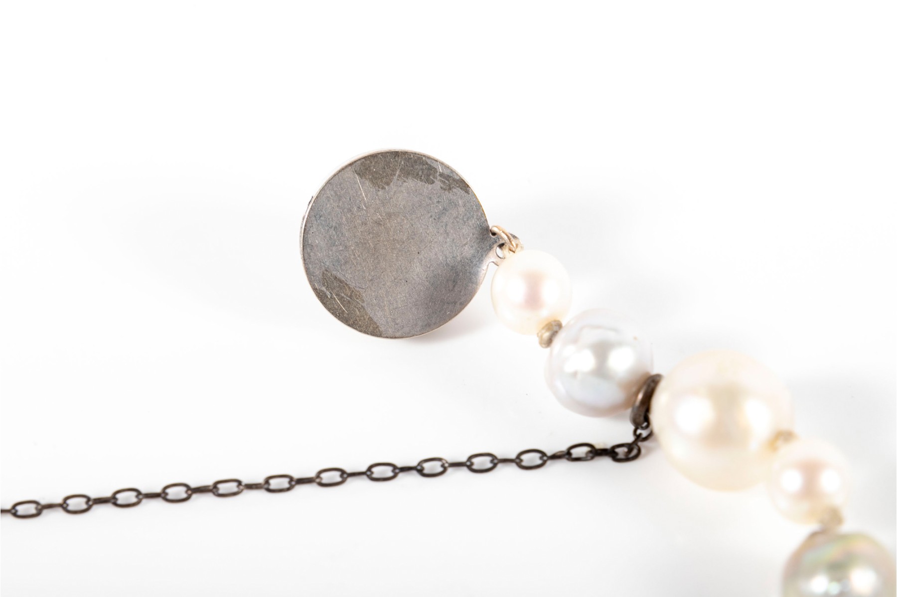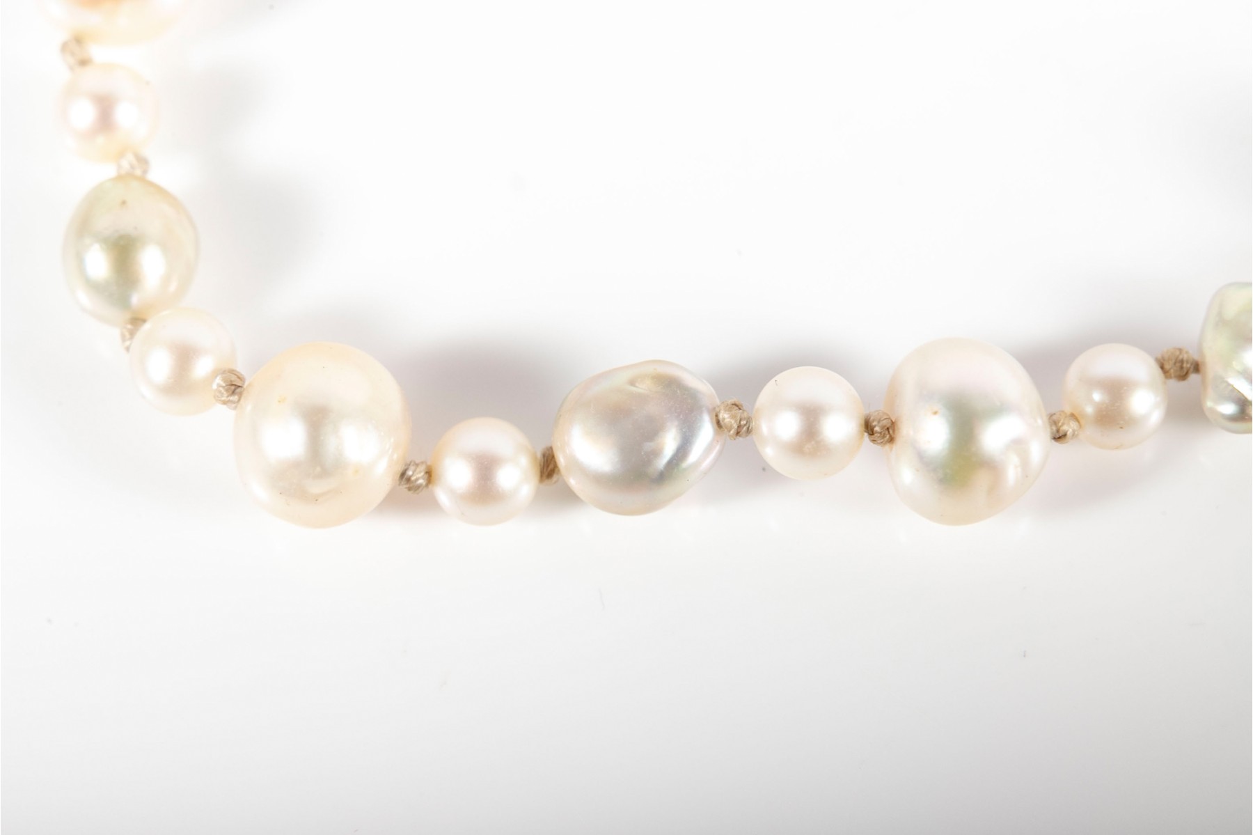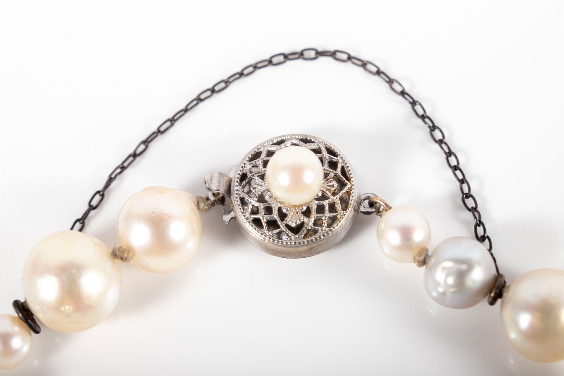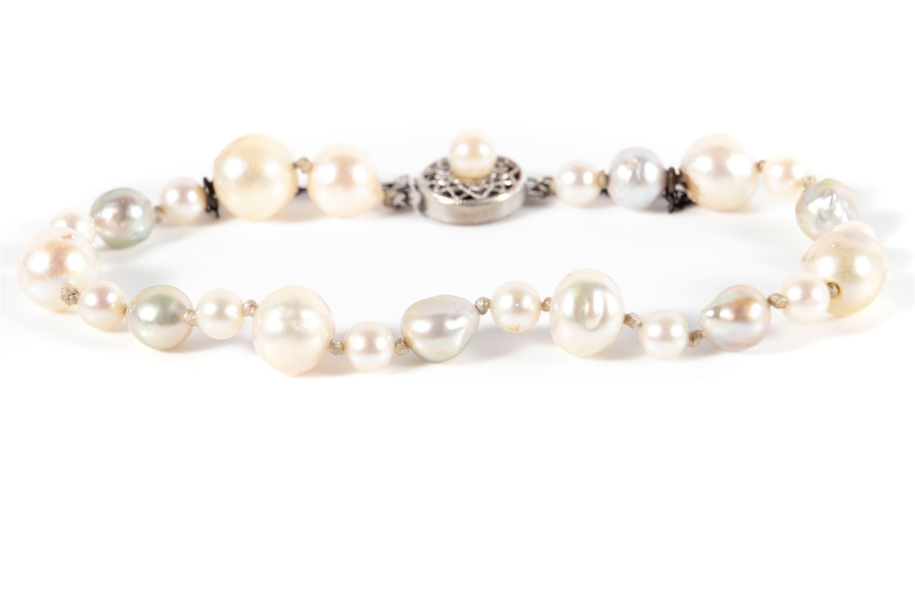A lovely, textural bracelet of cream, gray, and white cultured pearls in alternating shapes and sizes, reaching a white gold clasp.