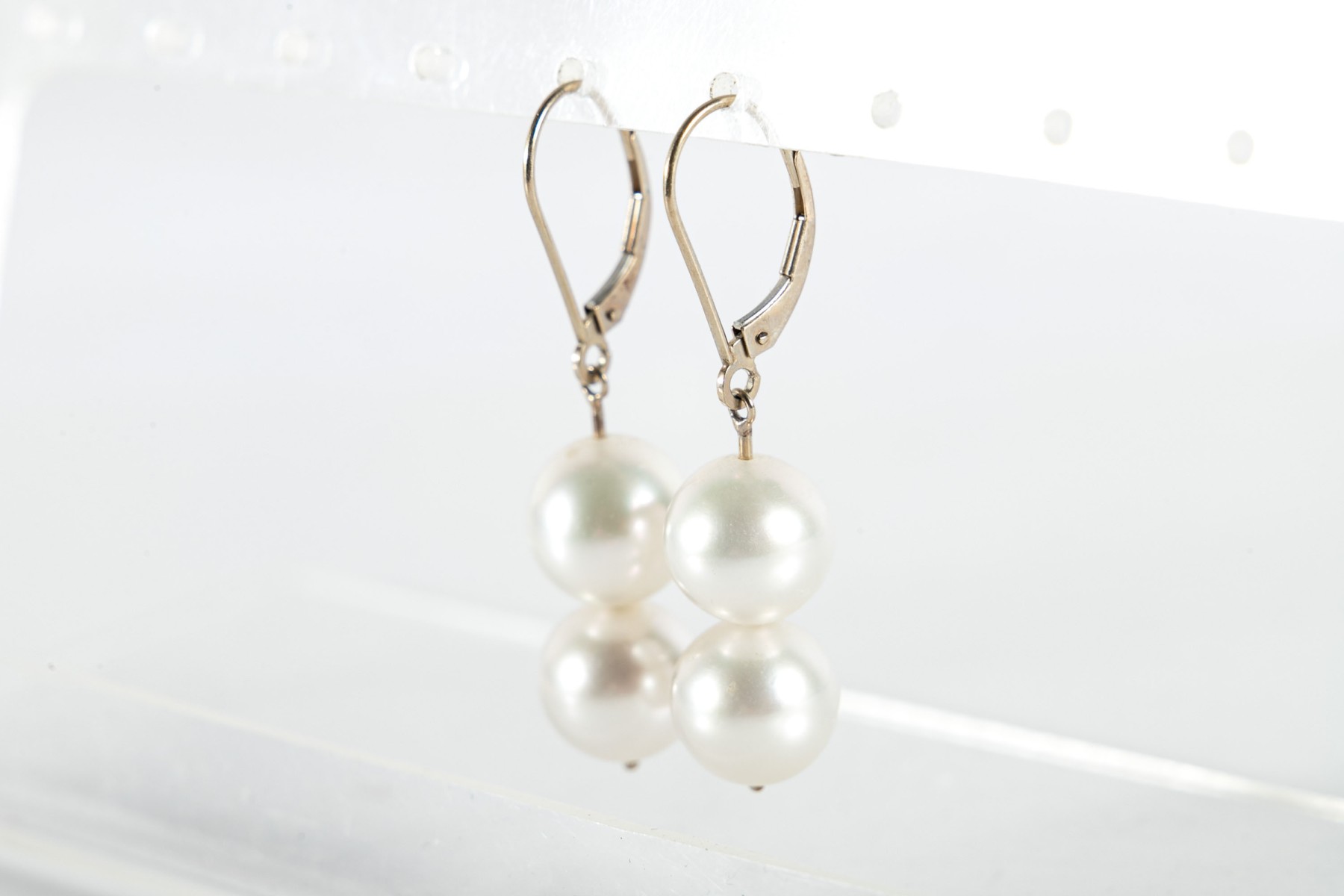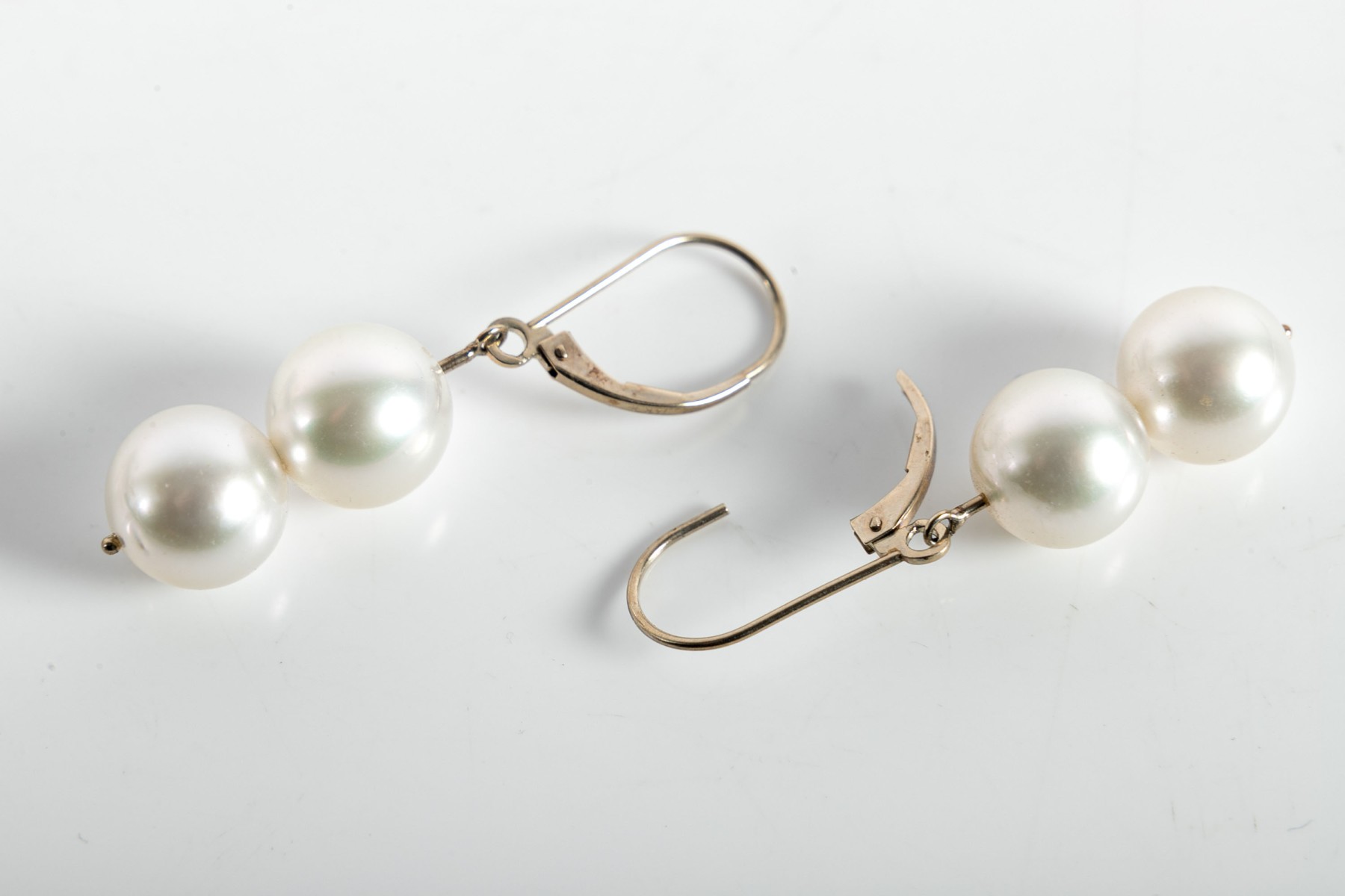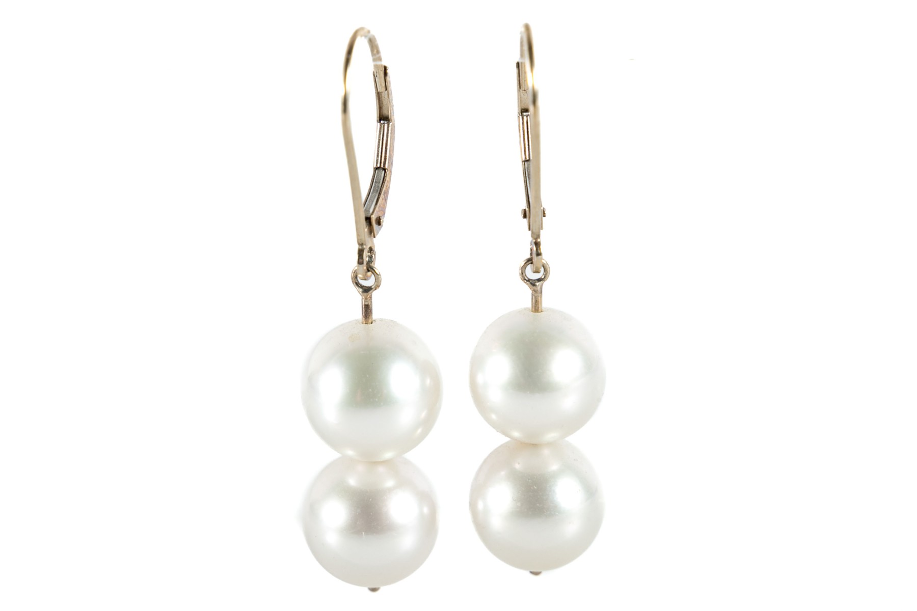 A delightful pair of white gold earrings each displaying two large cultured pearls in steely white with iridescent undertones of pink and blue.