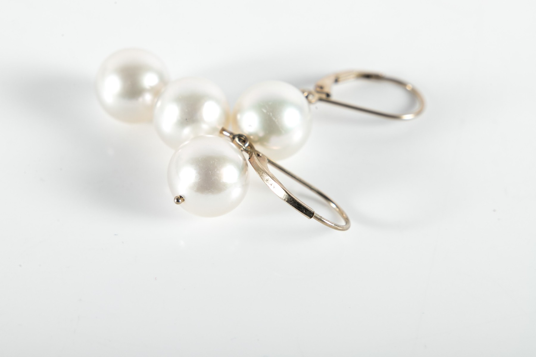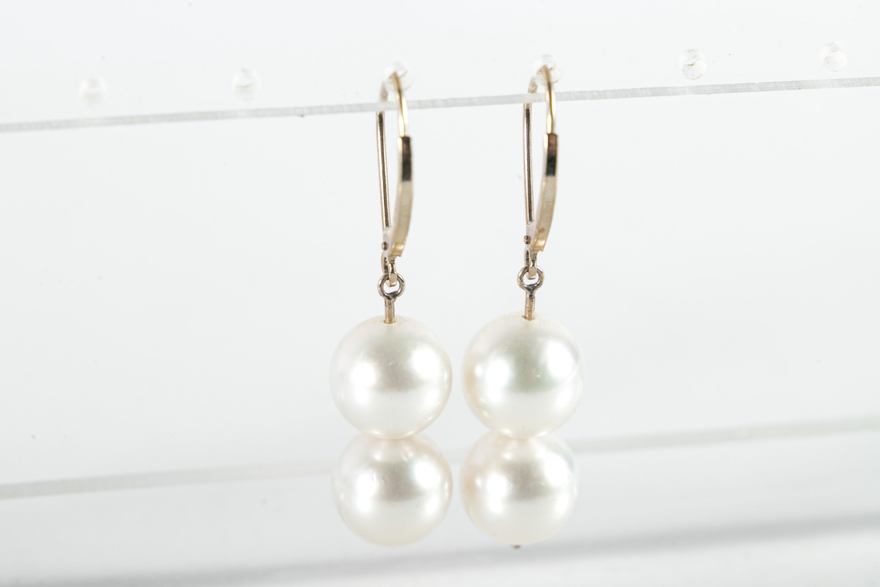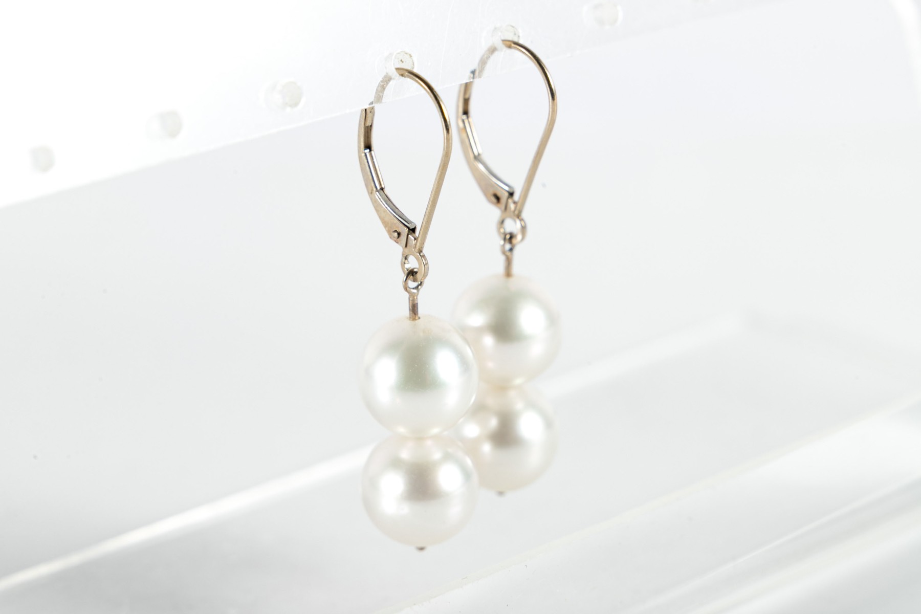 A delightful pair of white gold earrings each displaying two large cultured pearls in steely white with iridescent undertones of pink and blue.