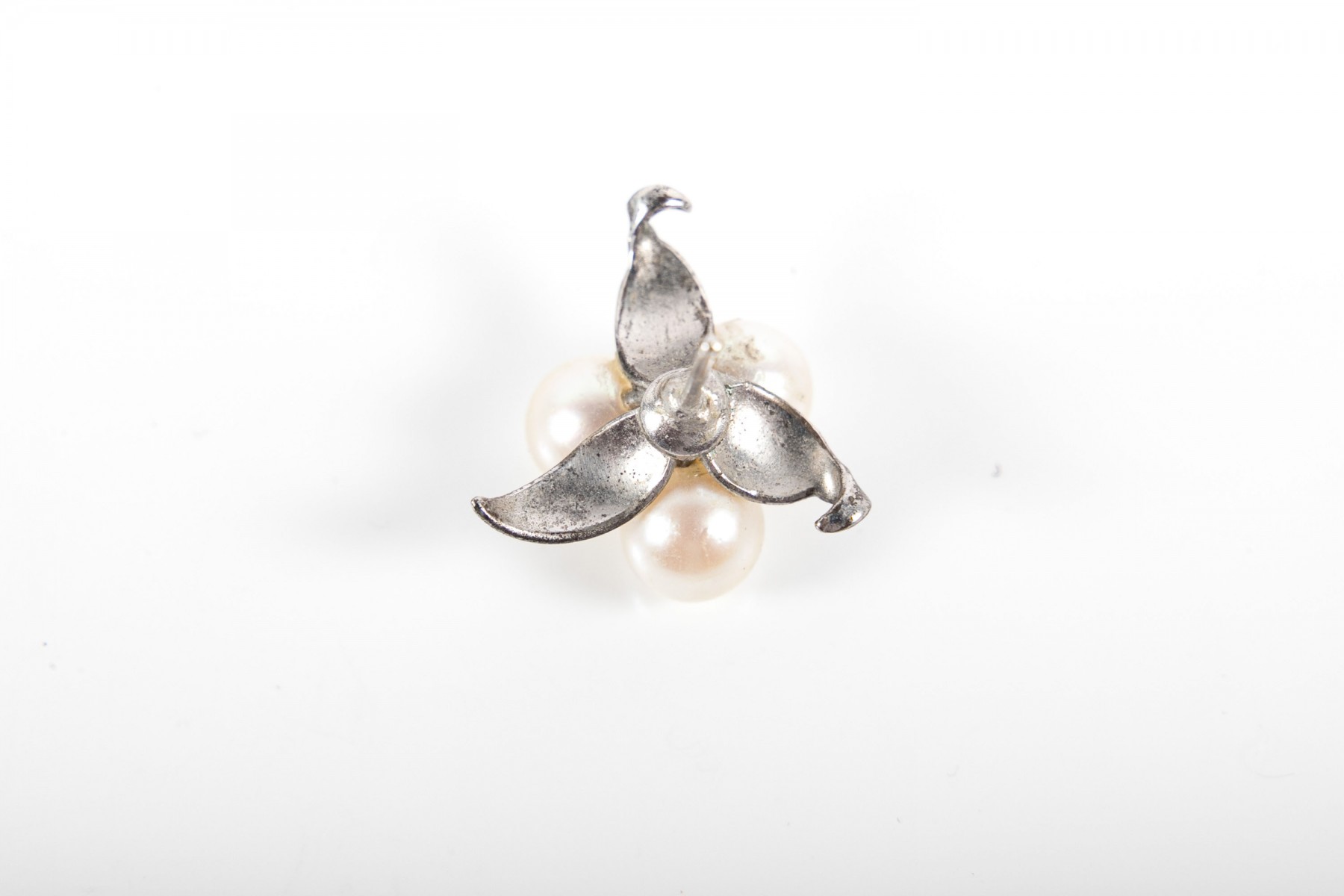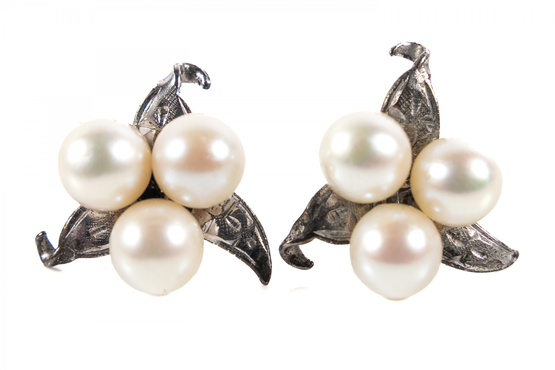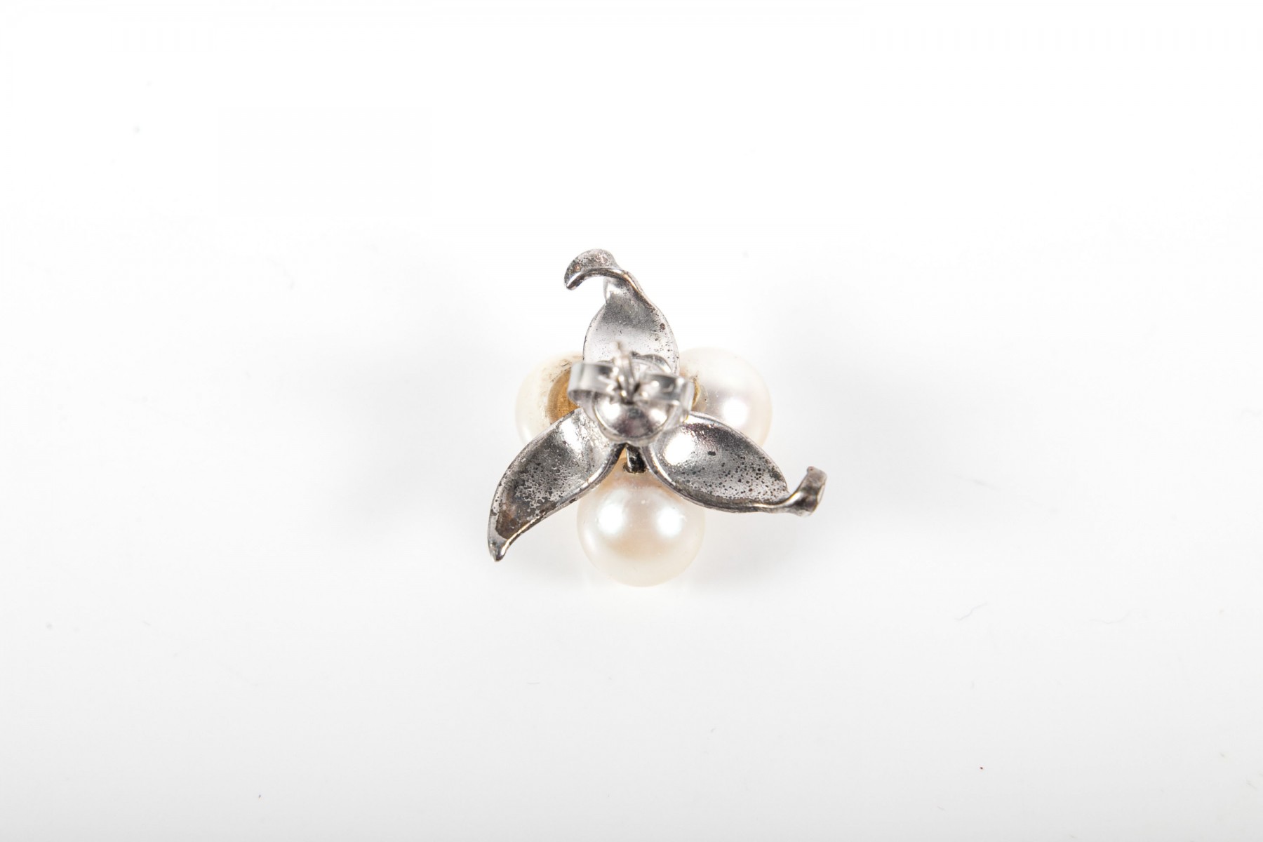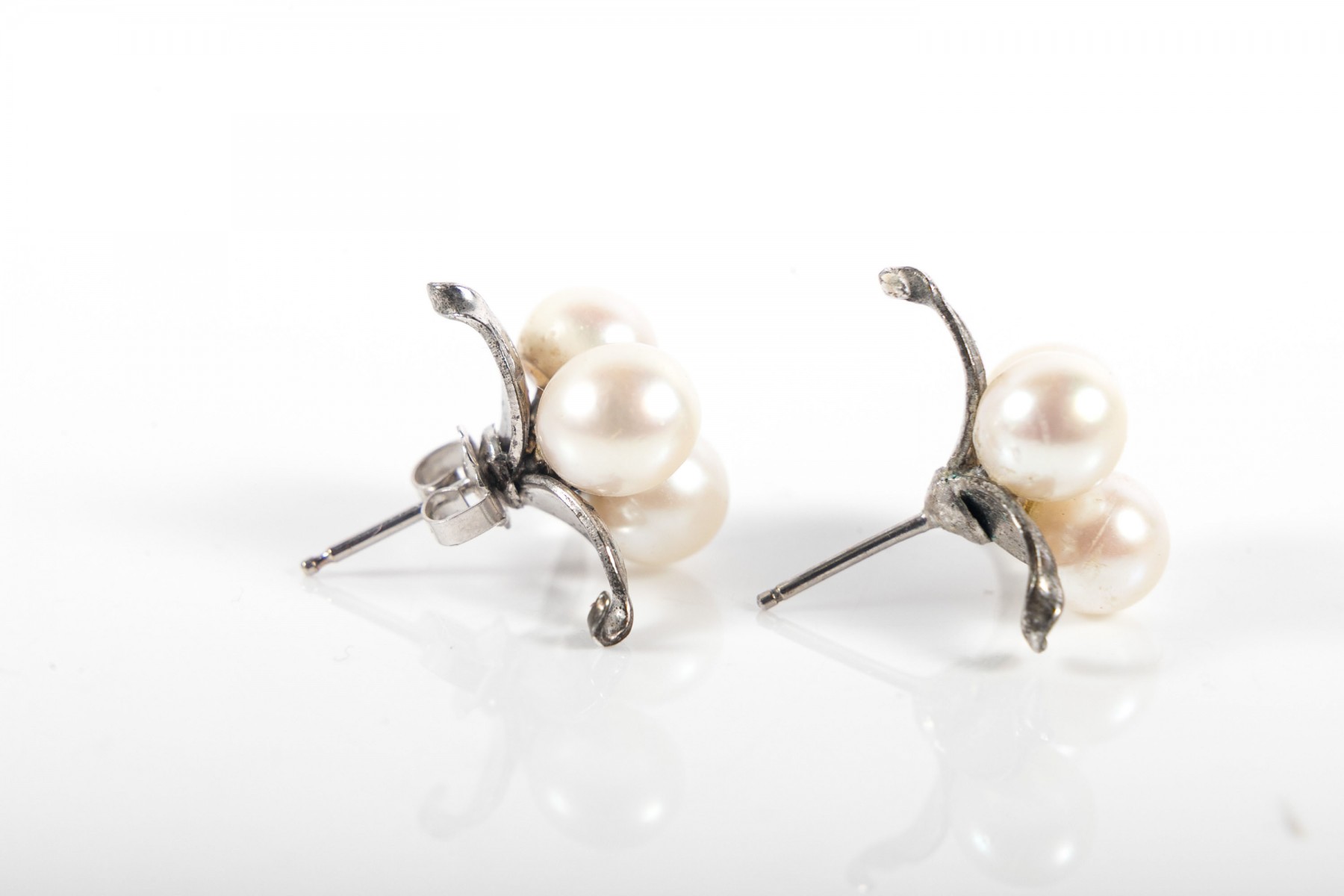 A beautiful pair of white gold studs displaying trios of cultured warm-white pearls with iridescent undertones of pink, green, orange, and gray. Winding leaf-shaped accents emerge from the pearls, creating wonderful floral or berry appearances.