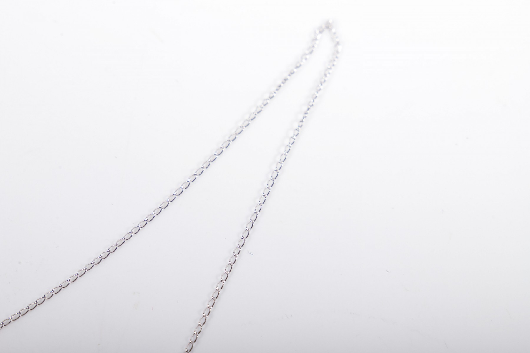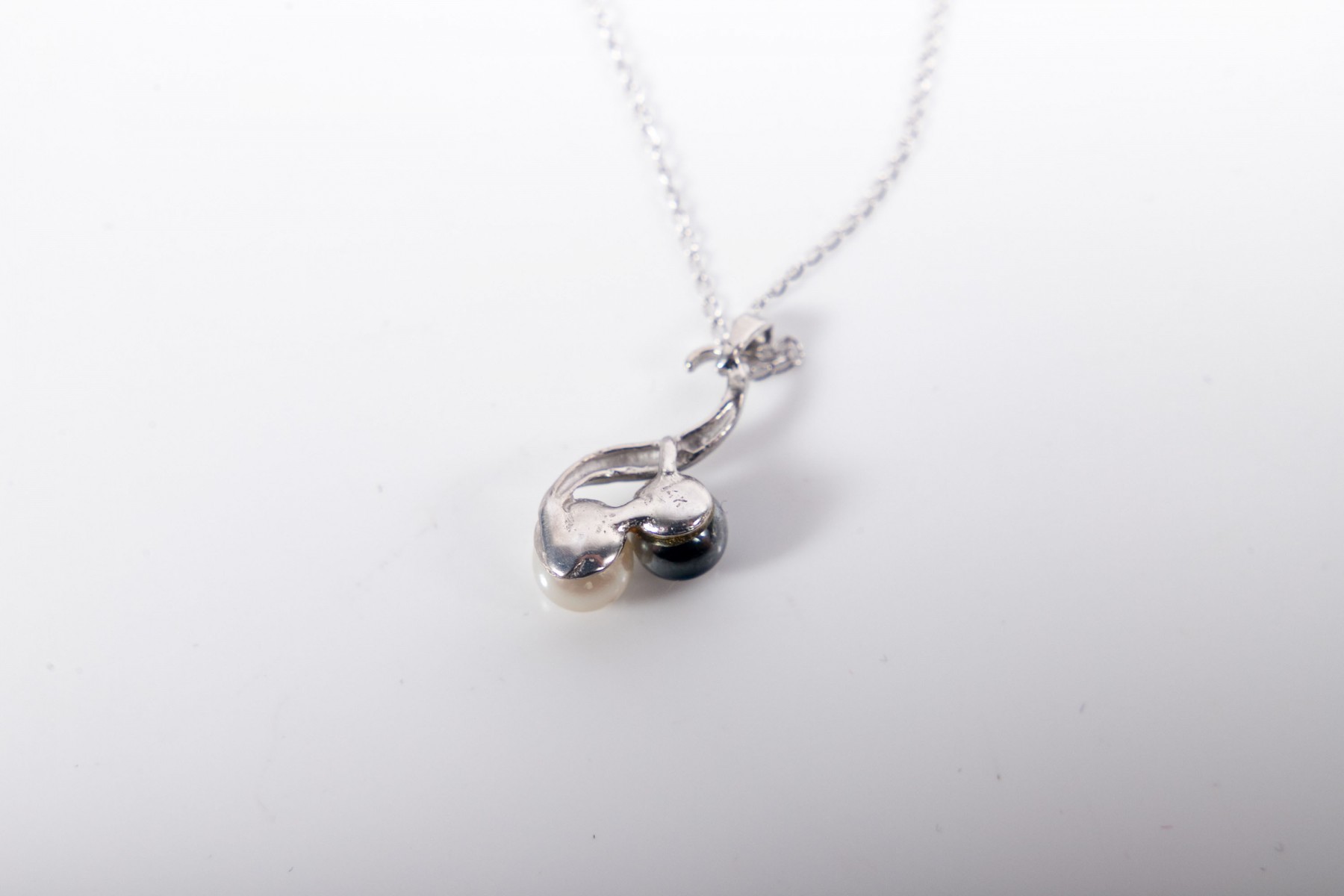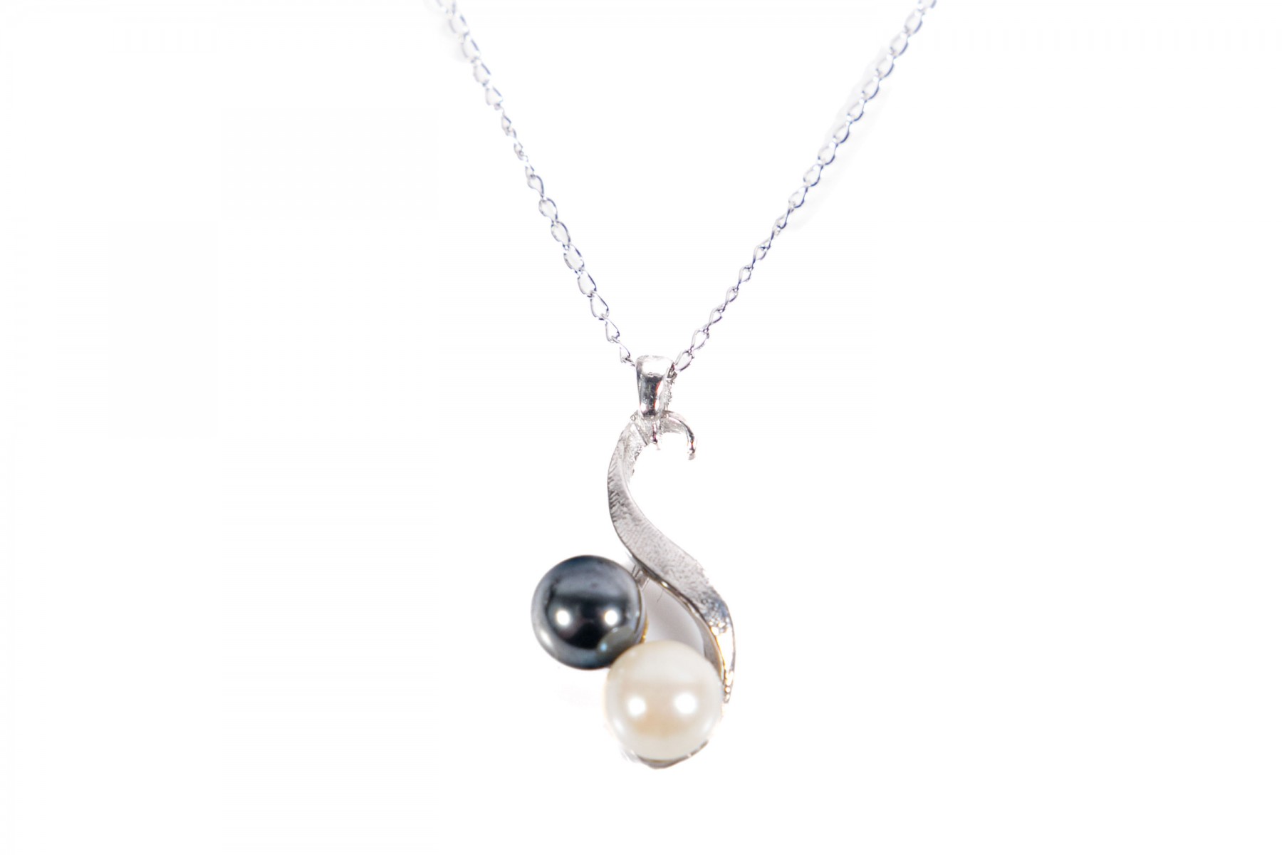 An elegant white gold necklace displaying a swooping pendant adorned with a white cultured pearl and a gunmetal-hued accent, possibly hematite, hanging from a fine curb chain.