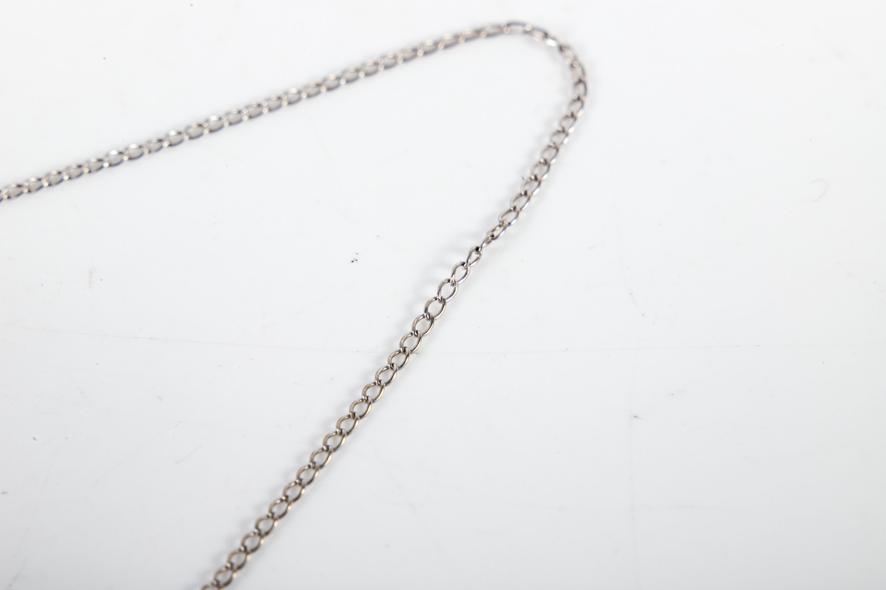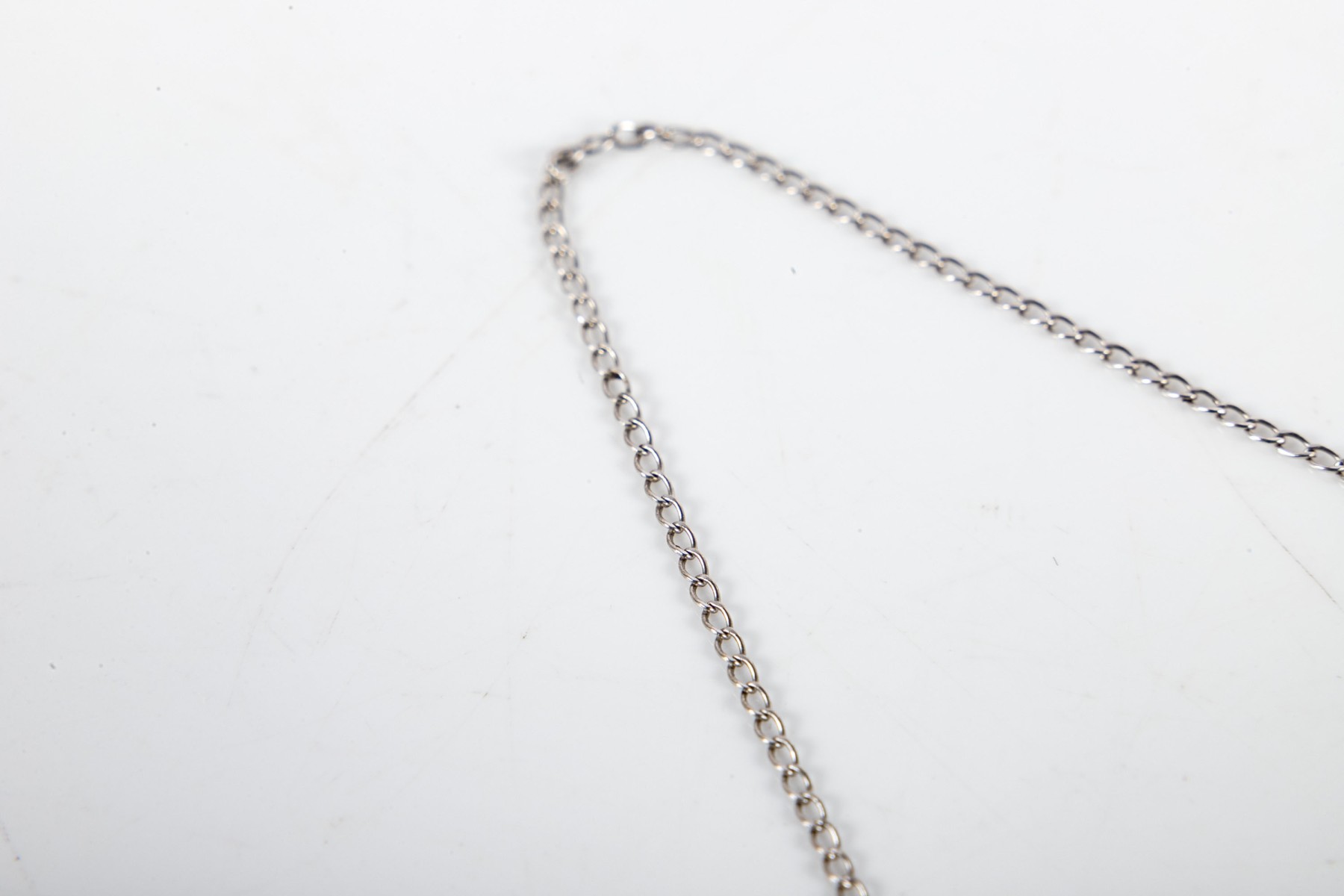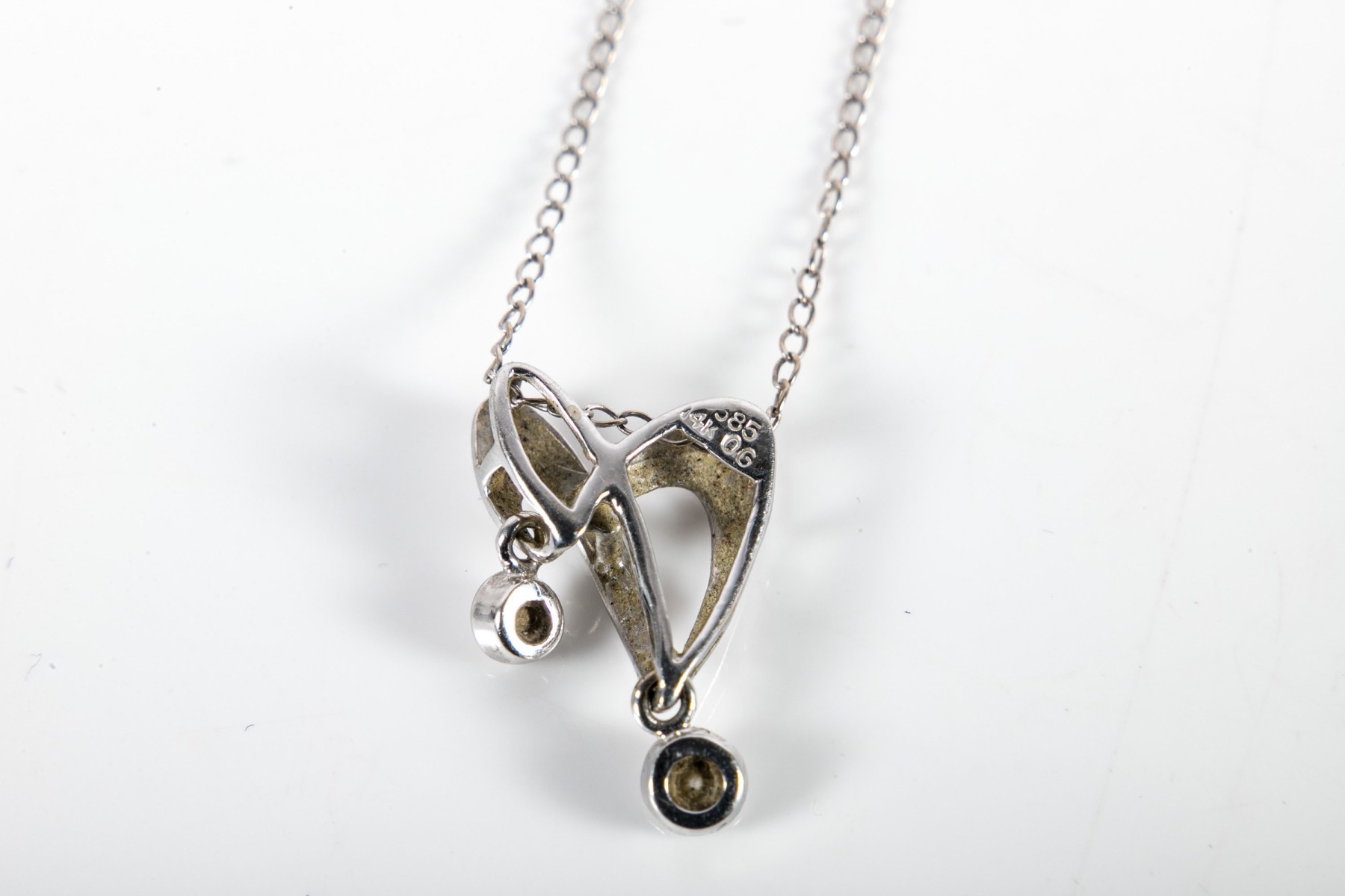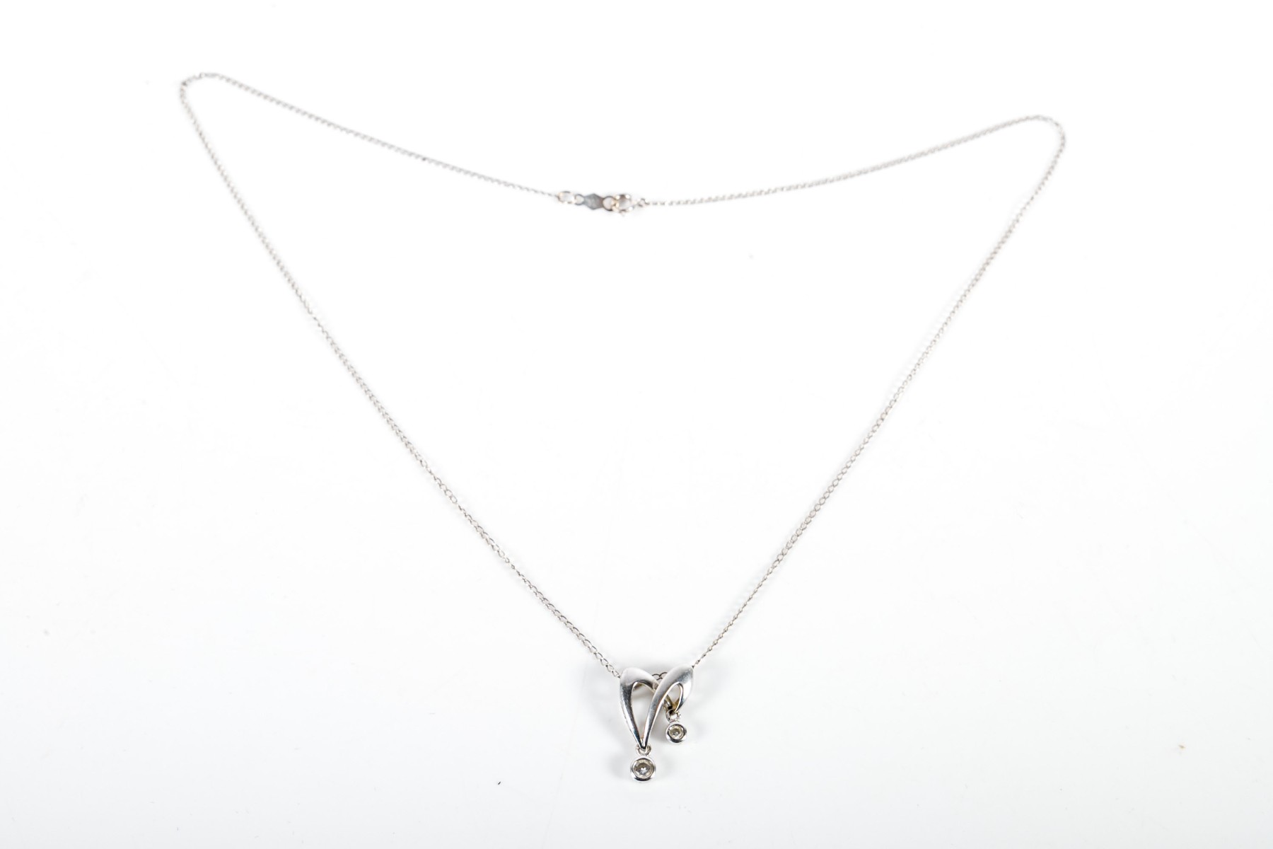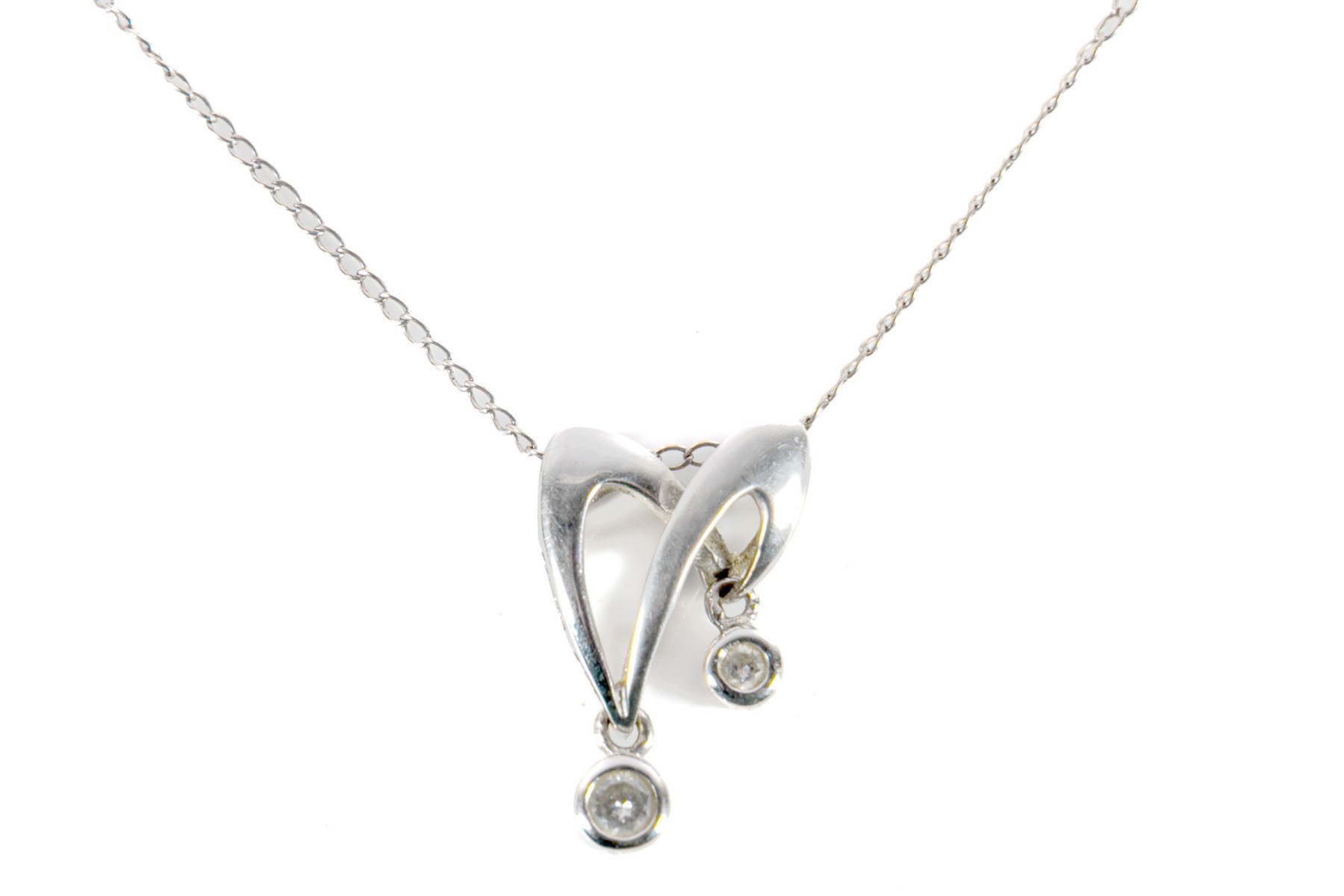 A beautiful white gold necklace displaying a pendant with an abstract heart shape accented with a dangling bezel-set diamond and a smaller dangling bezel-set white sapphire, hanging on a cable chain.