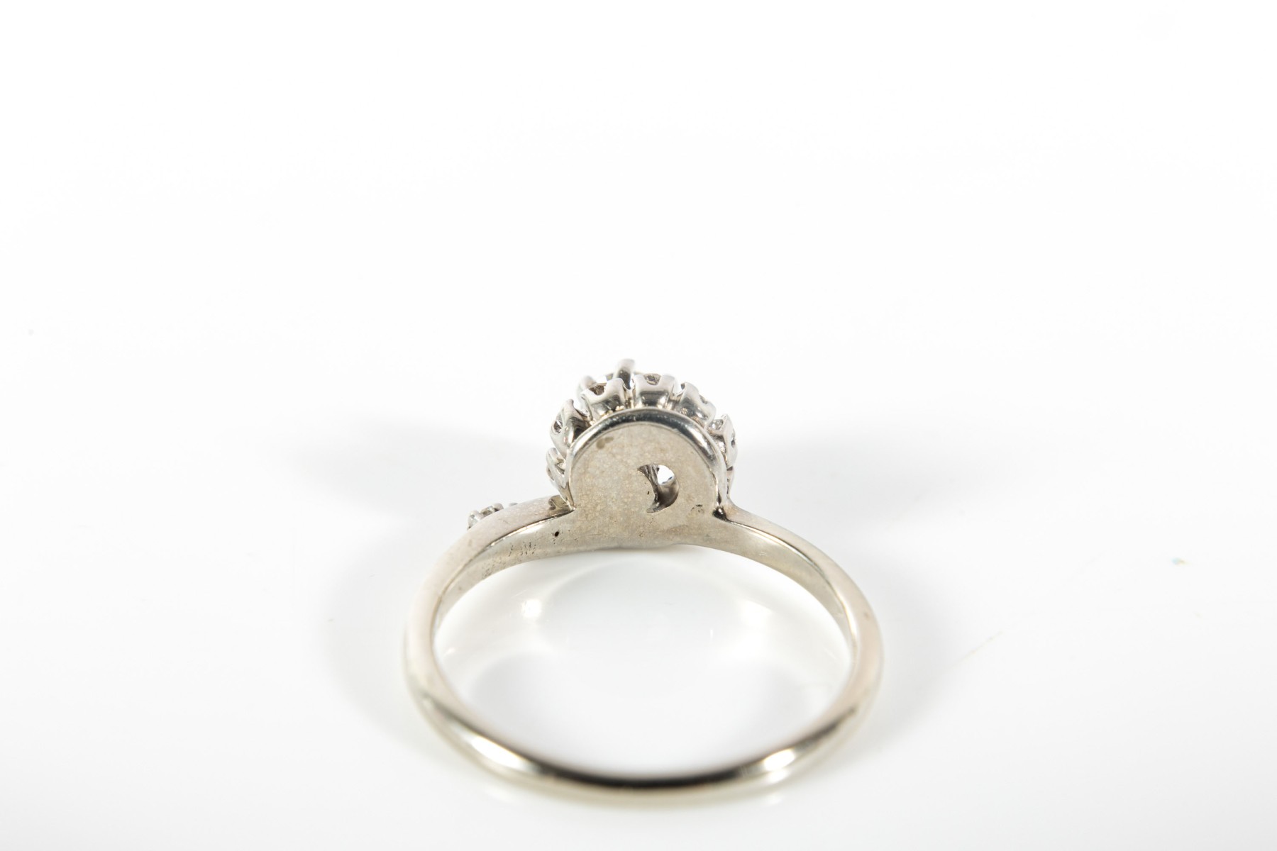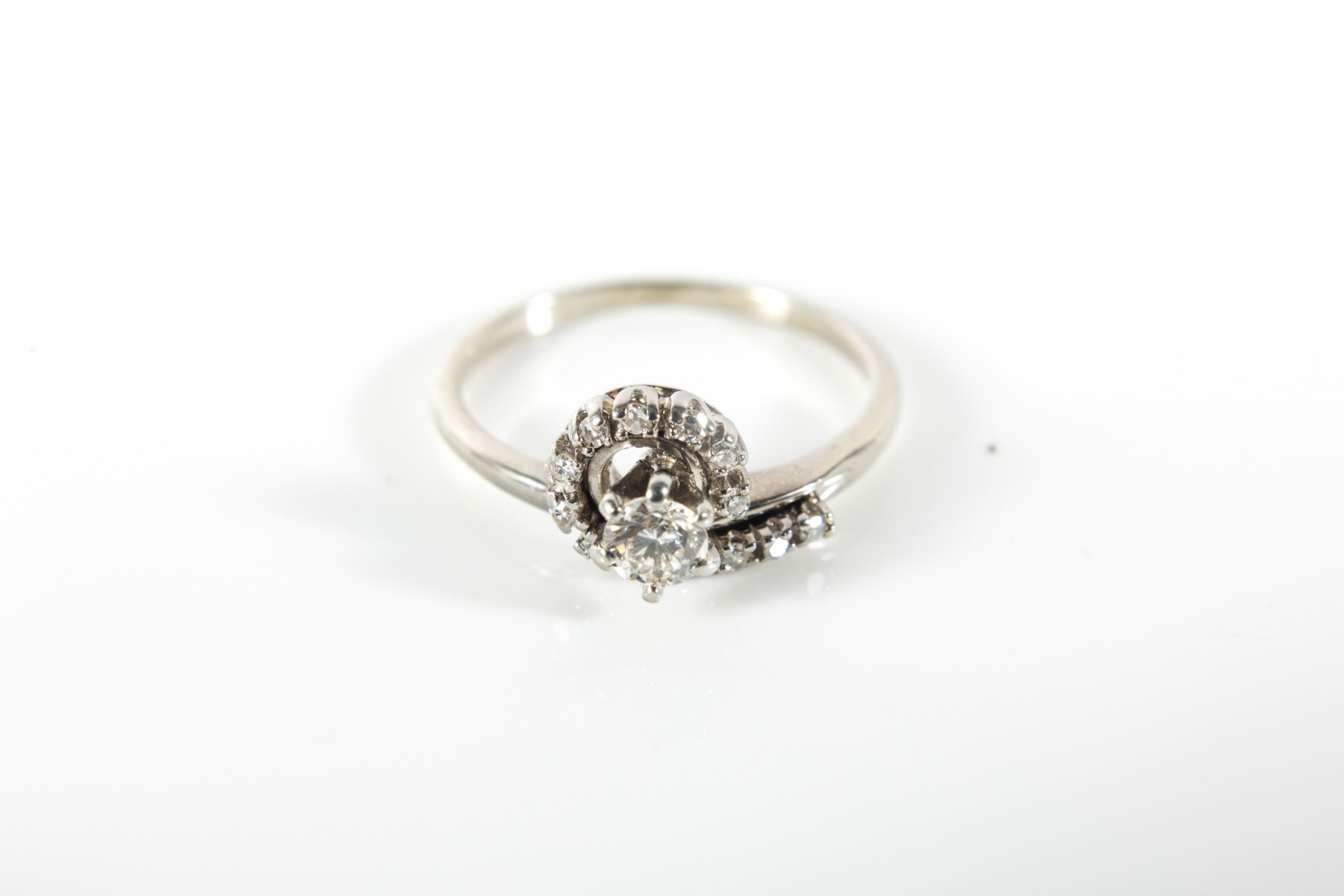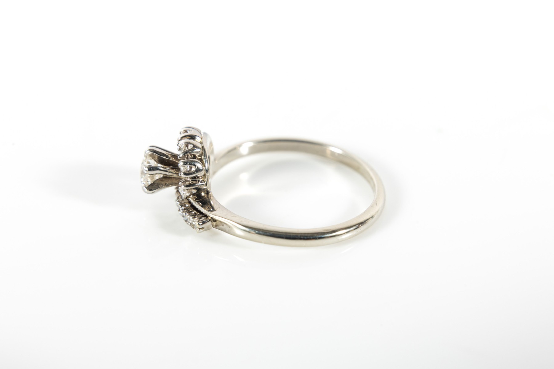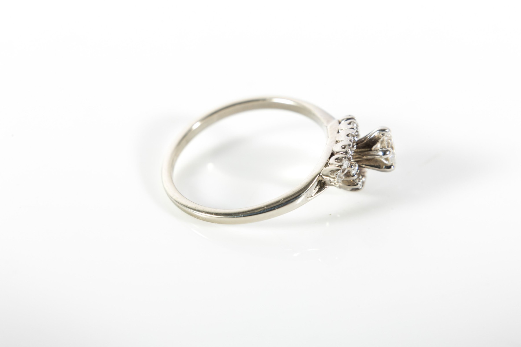 A beautiful marked 14K white gold ring centered with a full cut round diamond weighing approximately 0.25 CTS and with single cut round diamond accents weighing approximately 0.10 TCW