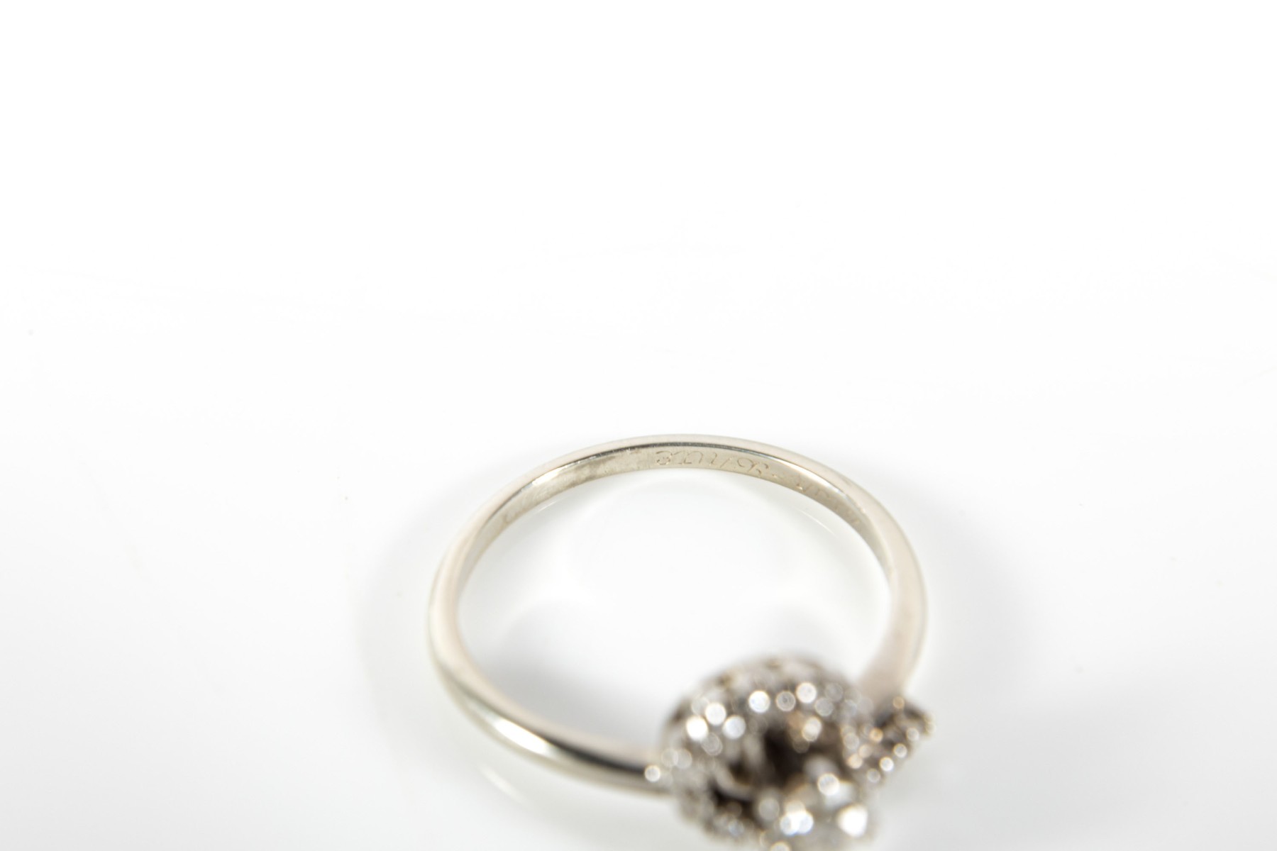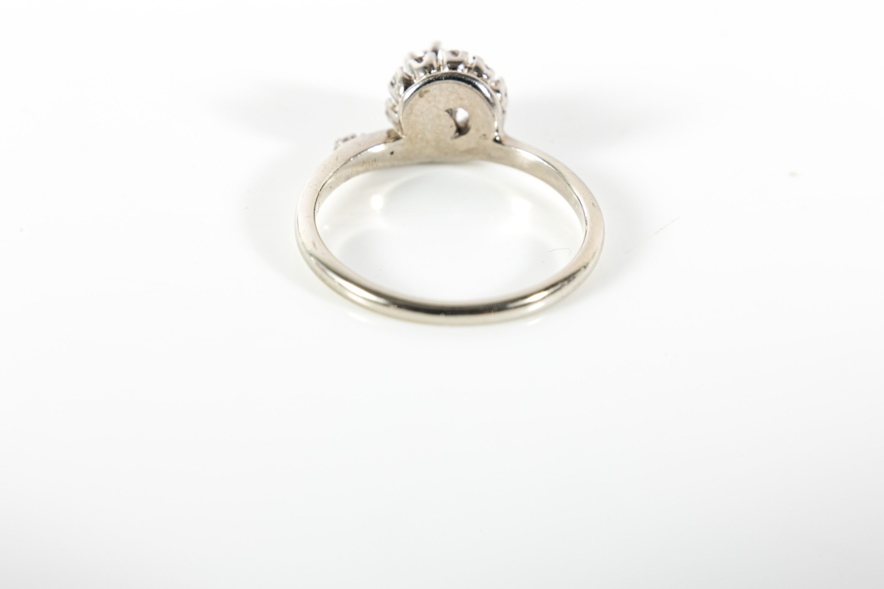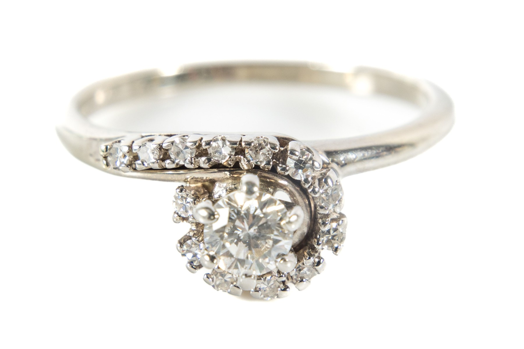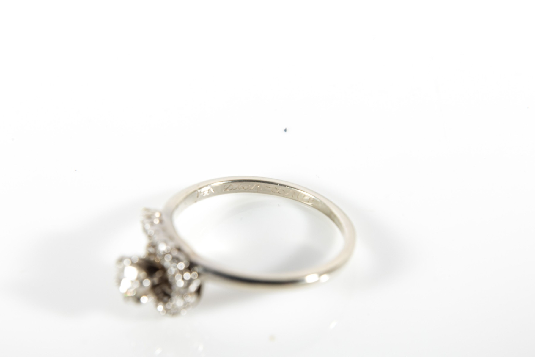 A beautiful marked 14K white gold ring centered with a full cut round diamond weighing approximately 0.25 CTS and with single cut round diamond accents weighing approximately 0.10 TCW