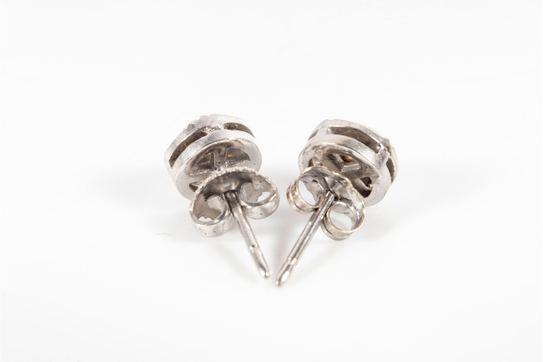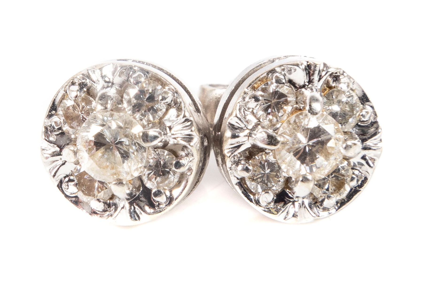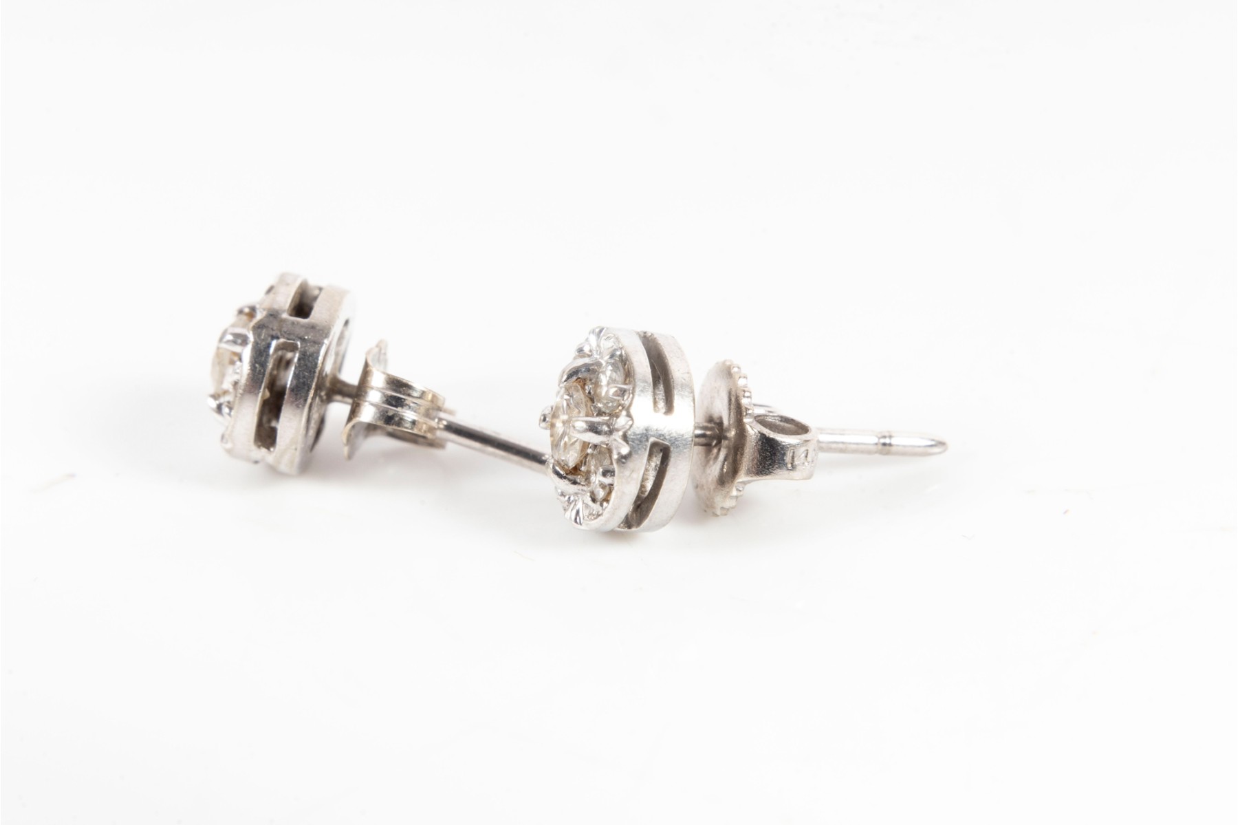A pair of dazzling white gold studs displaying larger round center diamonds surrounded by smaller diamonds.