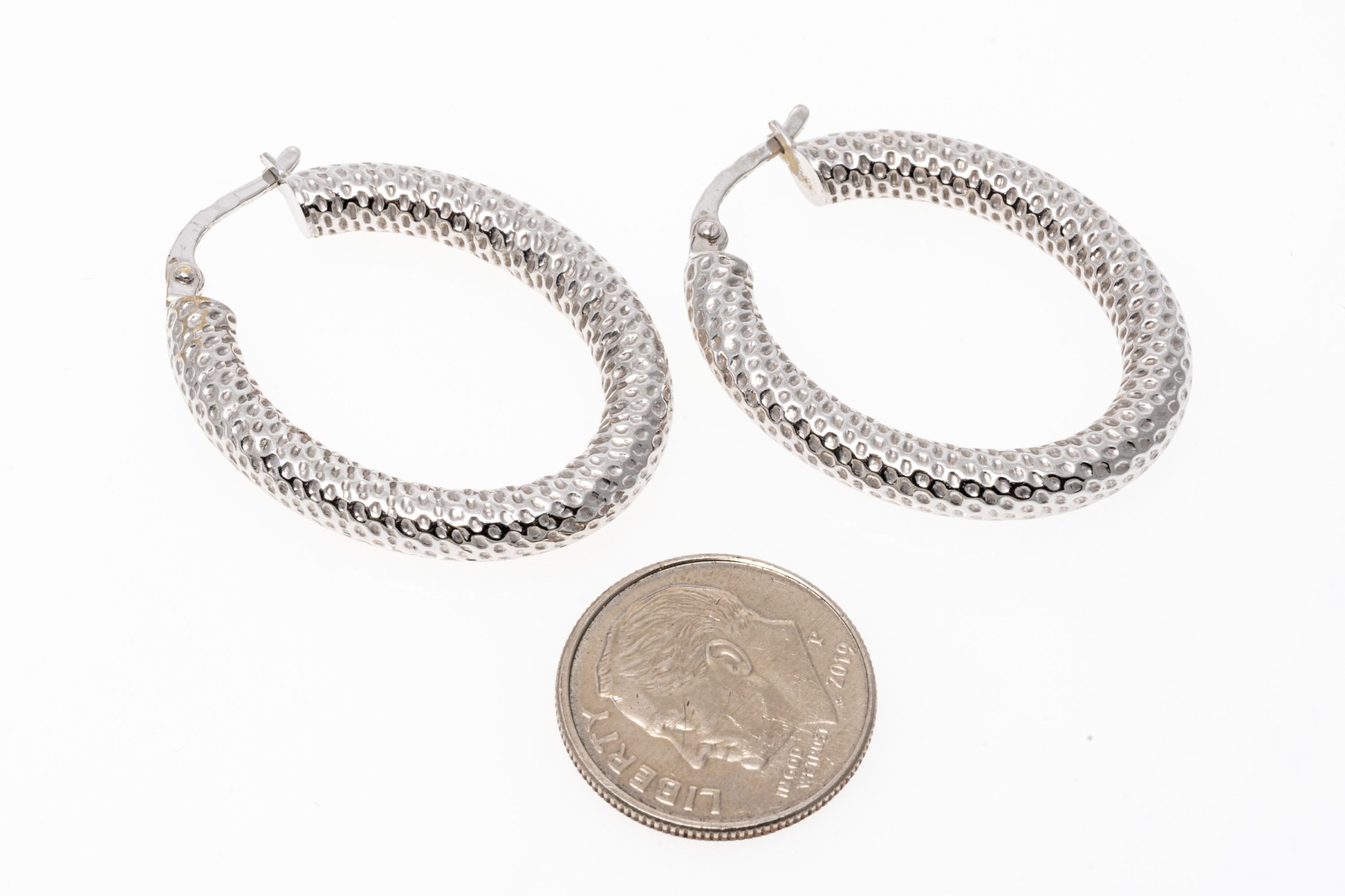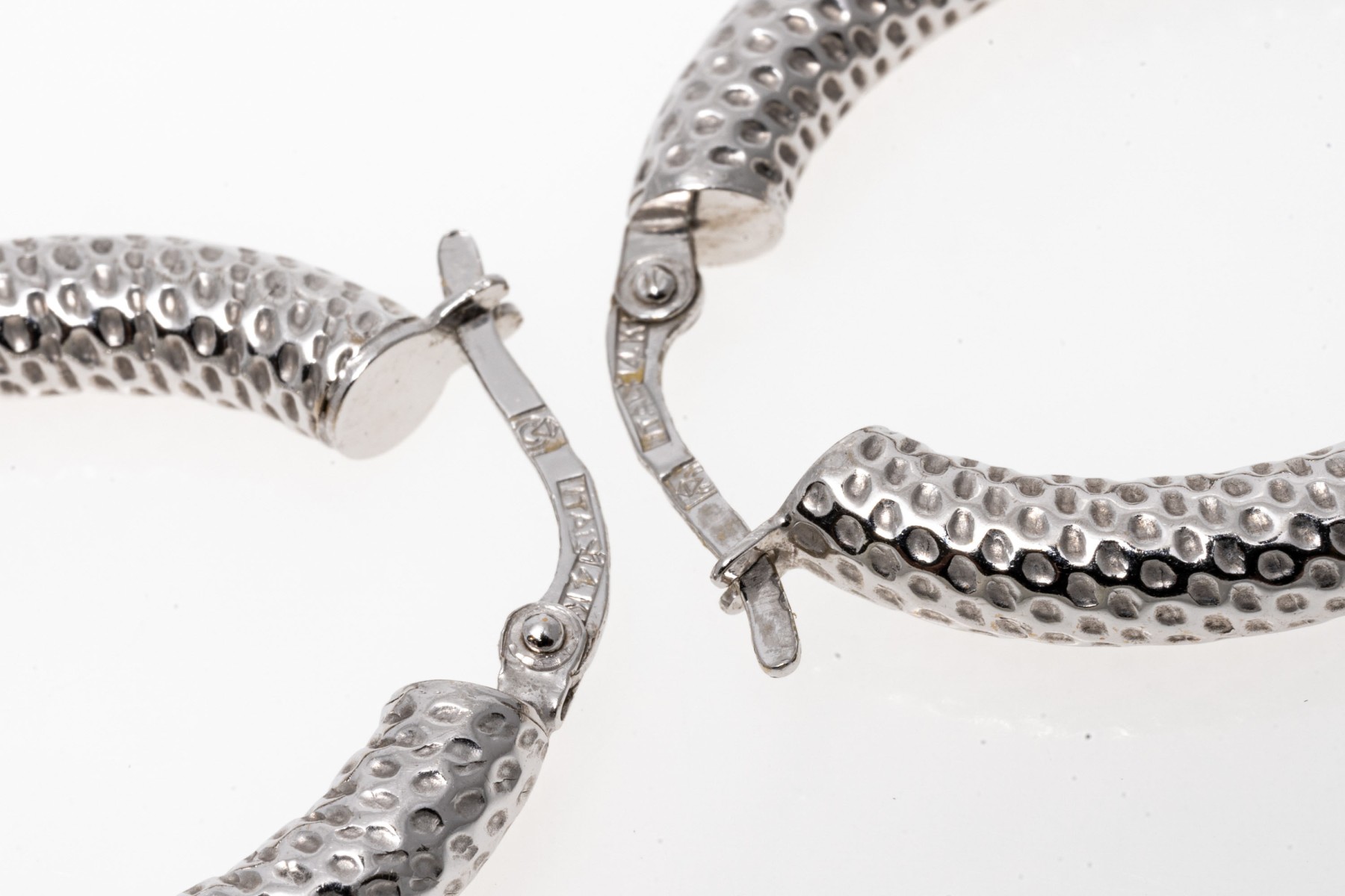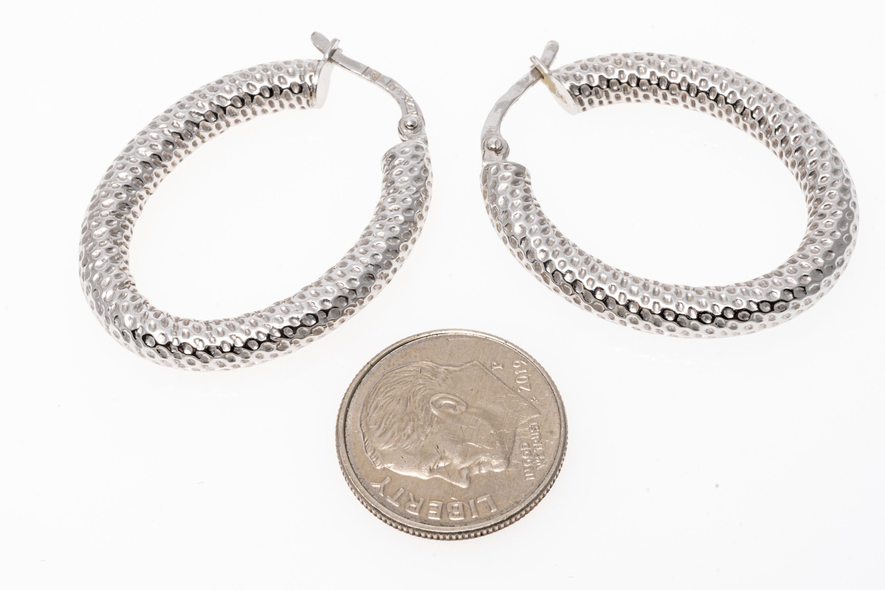 Bright polished 14K white gold elongated hoop earrings. The earrings have a dimpled appearance. Leaver post backings.