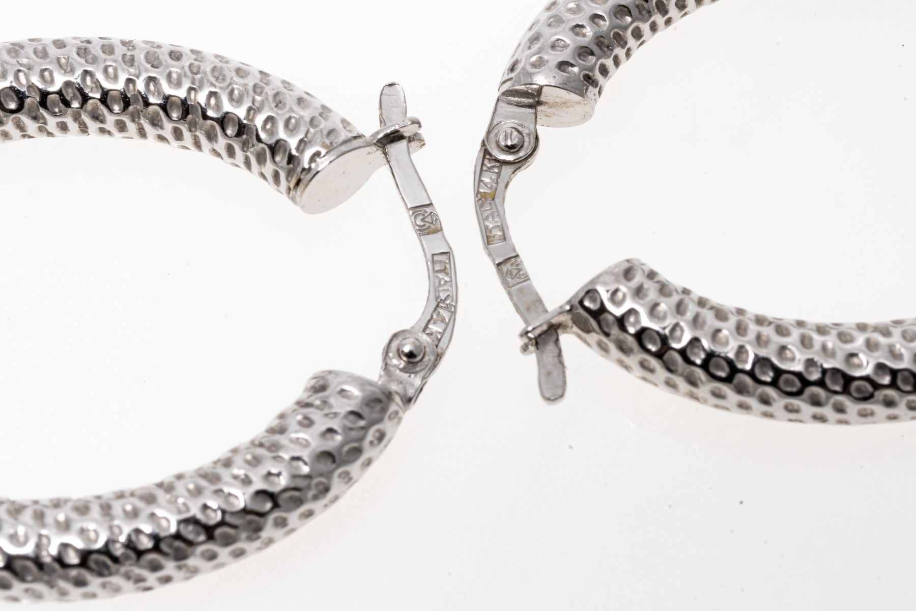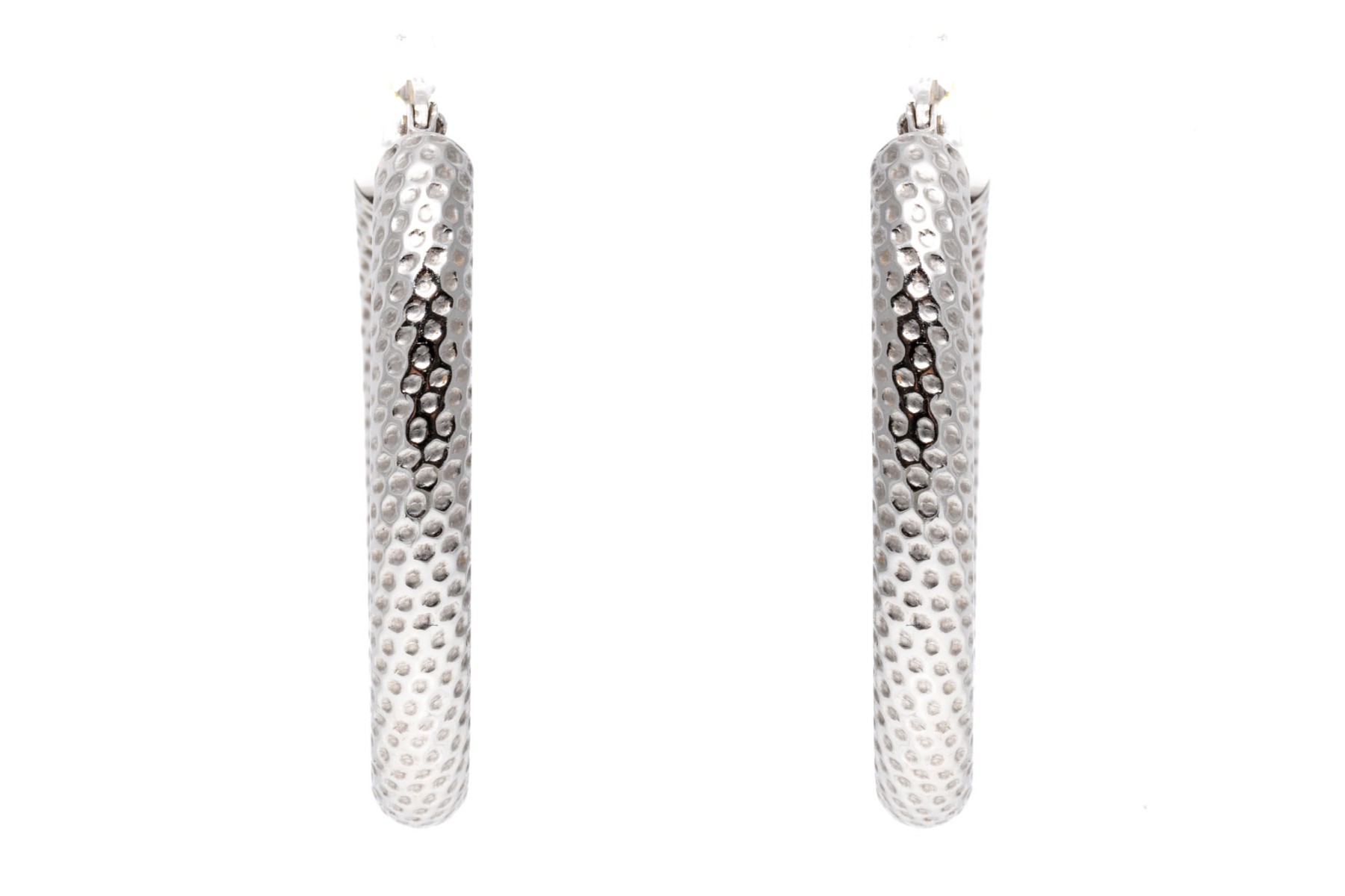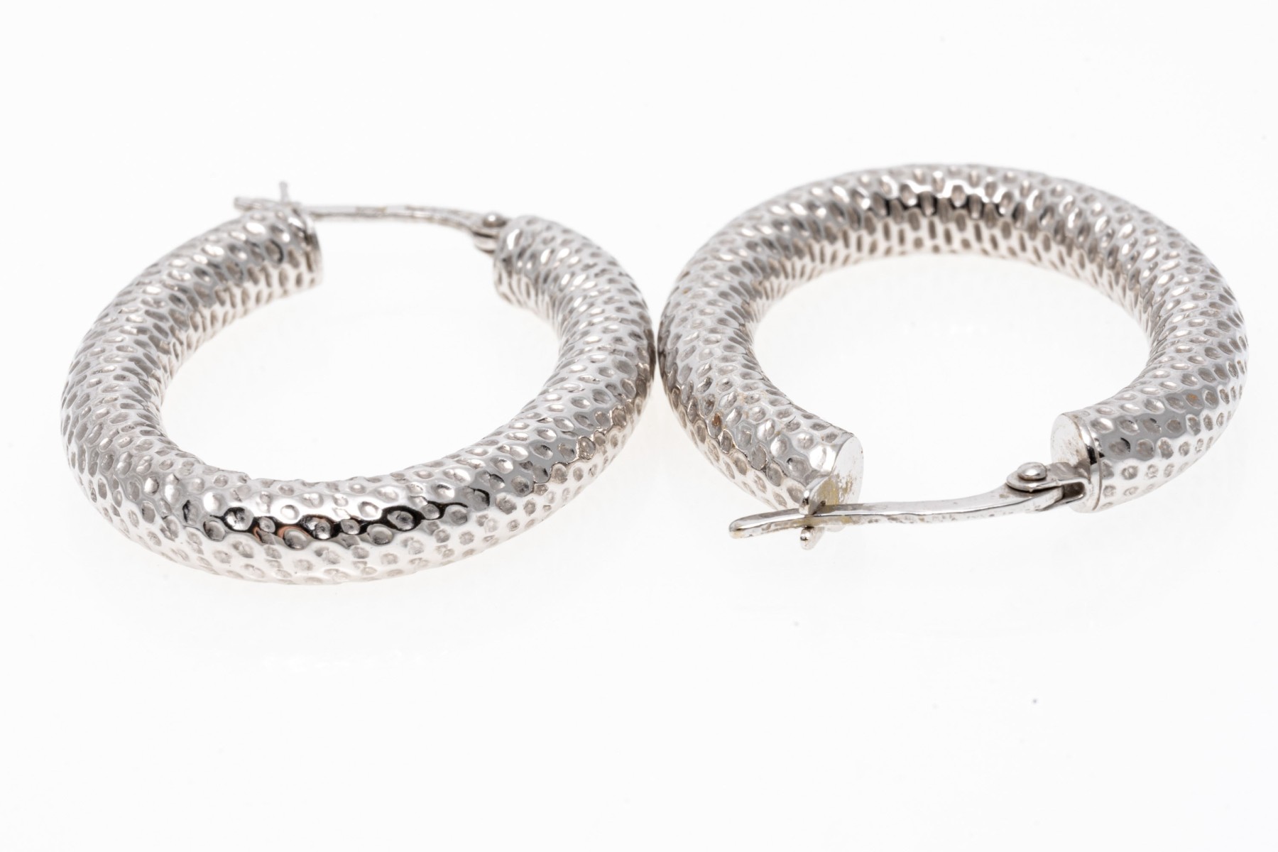 Bright polished 14K white gold elongated hoop earrings. The earrings have a dimpled appearance. Leaver post backings.