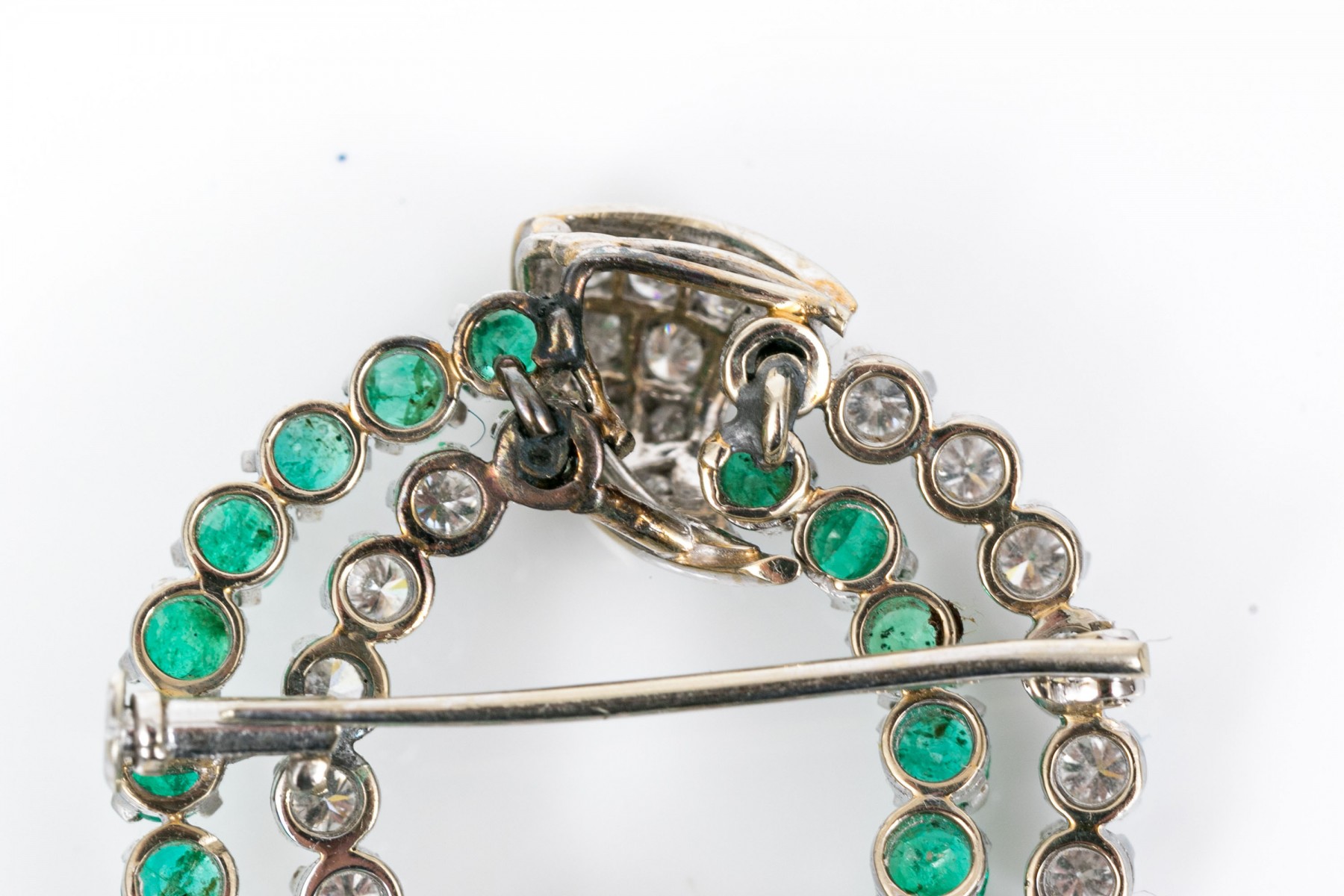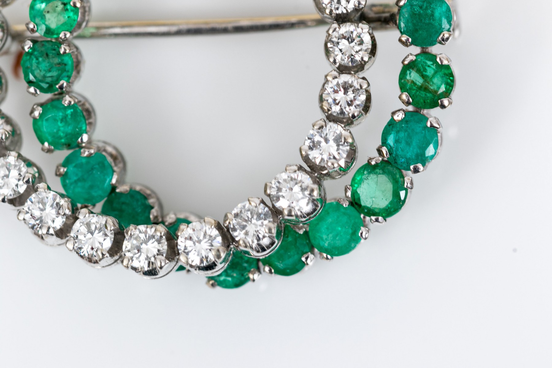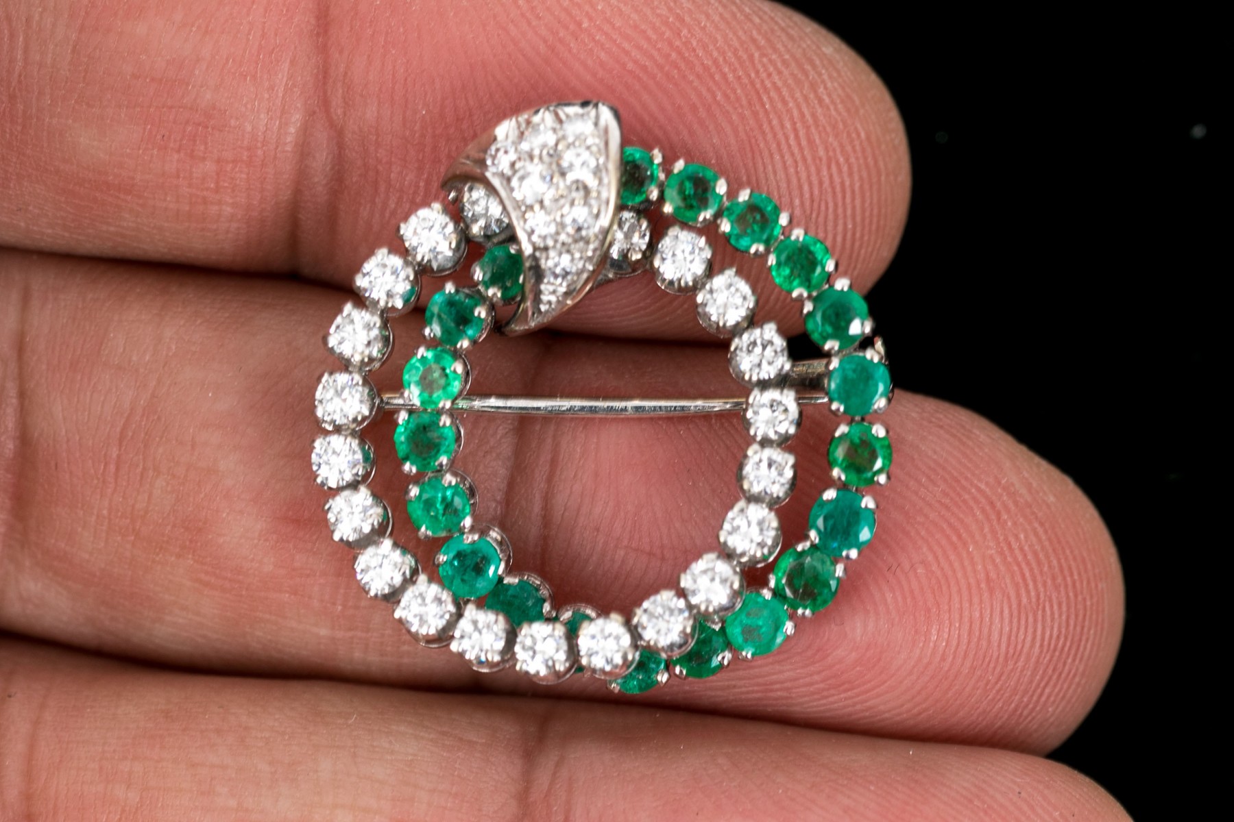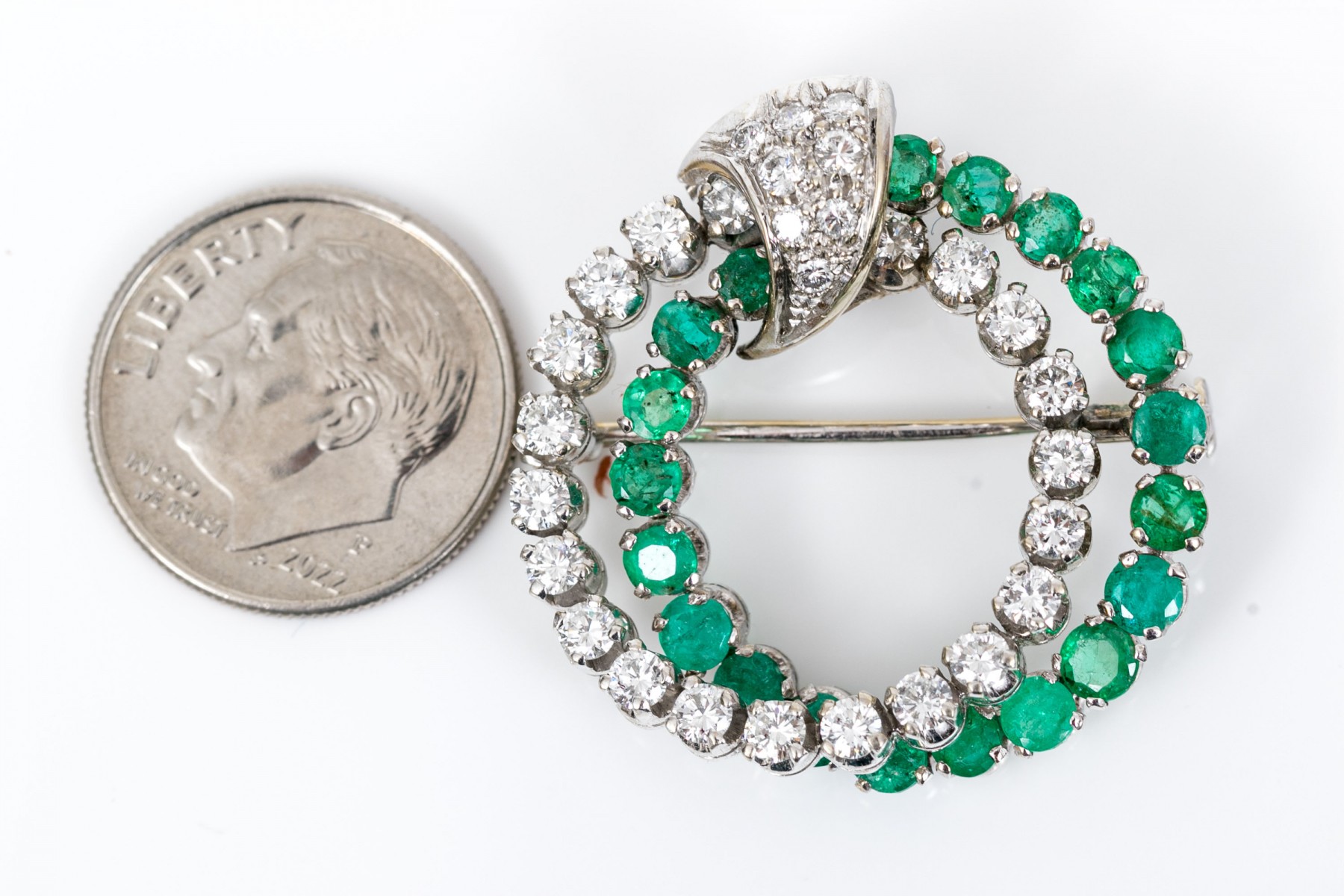 14k white gold fabulous emerald and diamond double circle brooch. This wonderful brooch features circle set with round brilliant cut diamonds, approximately 0.84 TCW, prong set, overlaying a second circle, set with round faceted, medium green color emeralds, approximately 2.00 TCW, also prong set. Topping the brooch is a swirled top, pave set with round brilliant cut diamonds, approximately 0.14 TCW