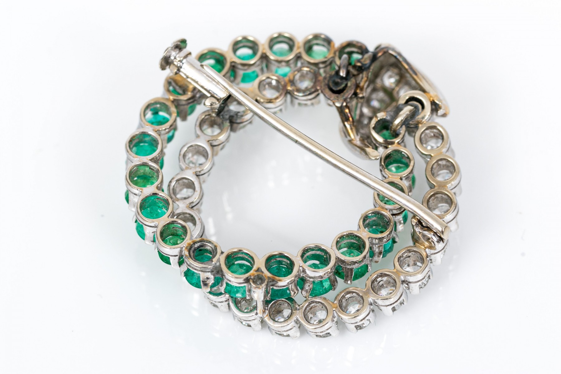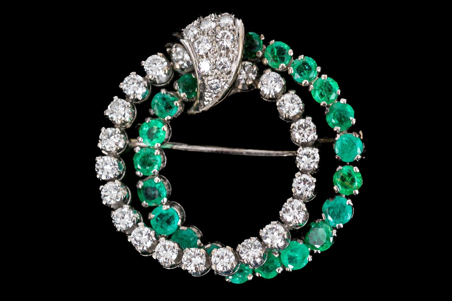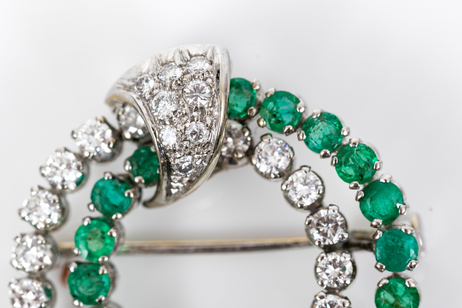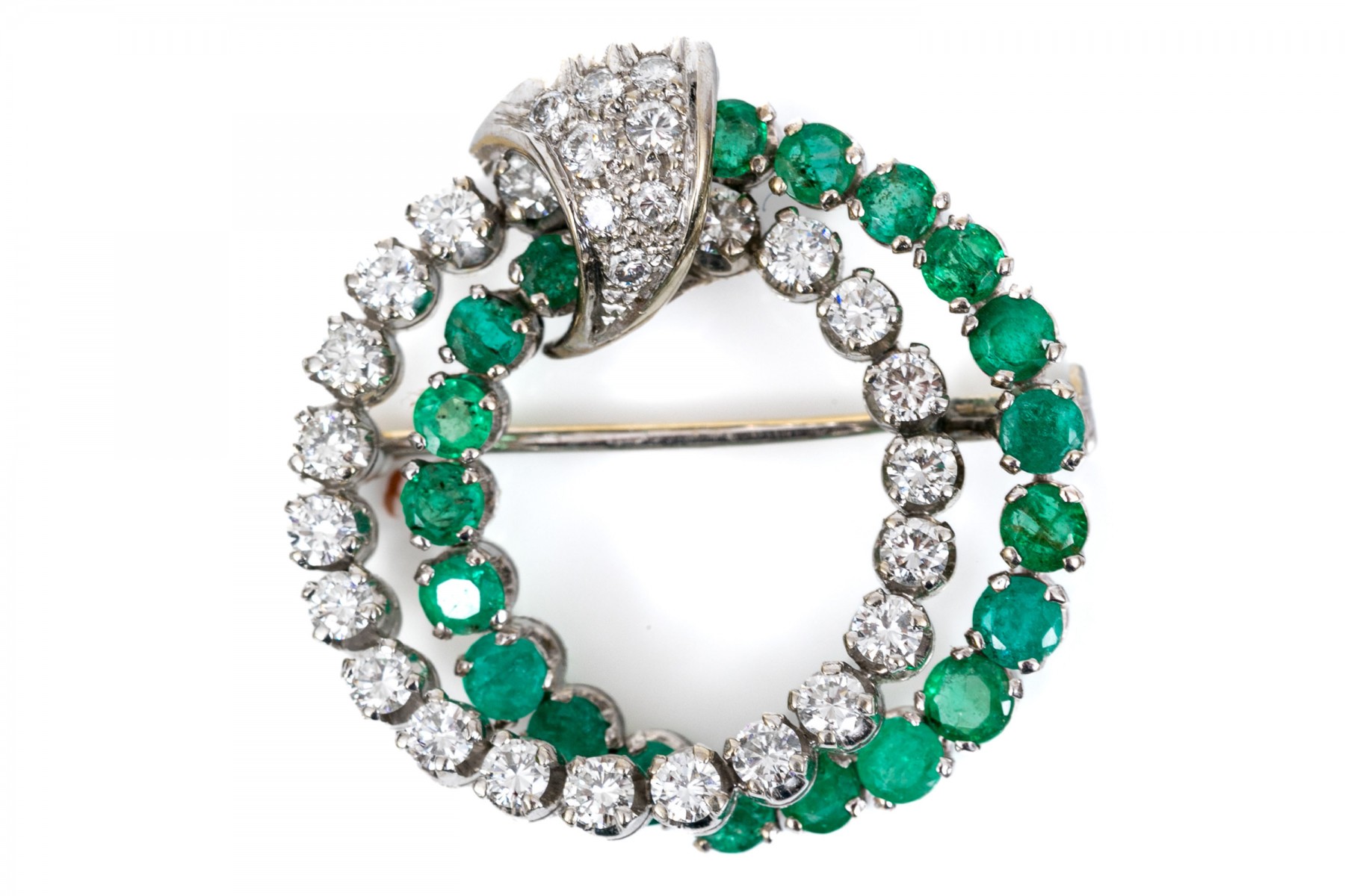 14k white gold fabulous emerald and diamond double circle brooch. This wonderful brooch features circle set with round brilliant cut diamonds, approximately 0.84 TCW, prong set, overlaying a second circle, set with round faceted, medium green color emeralds, approximately 2.00 TCW, also prong set. Topping the brooch is a swirled top, pave set with round brilliant cut diamonds, approximately 0.14 TCW