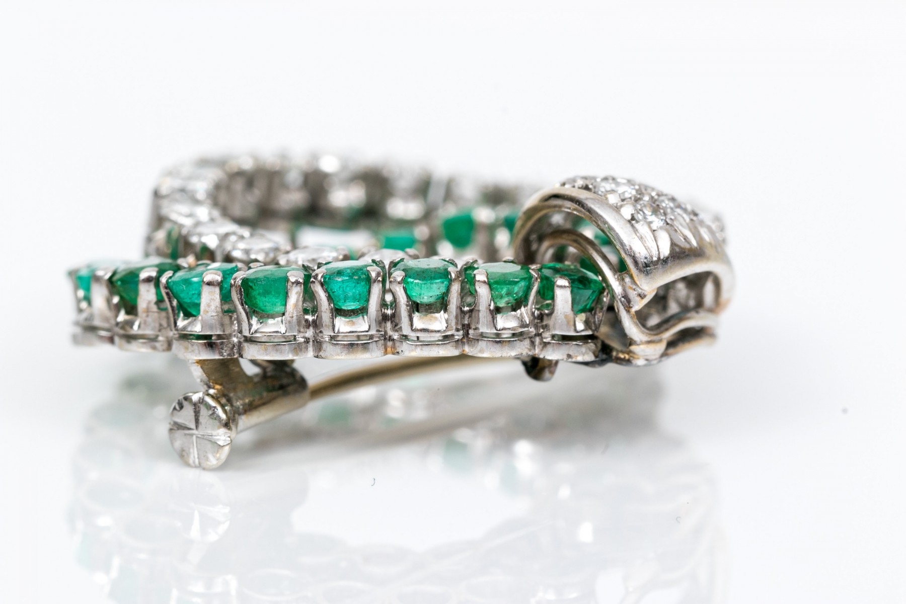 Condition: Good overall estate condition, pin stem bent, some nicks to emeralds
