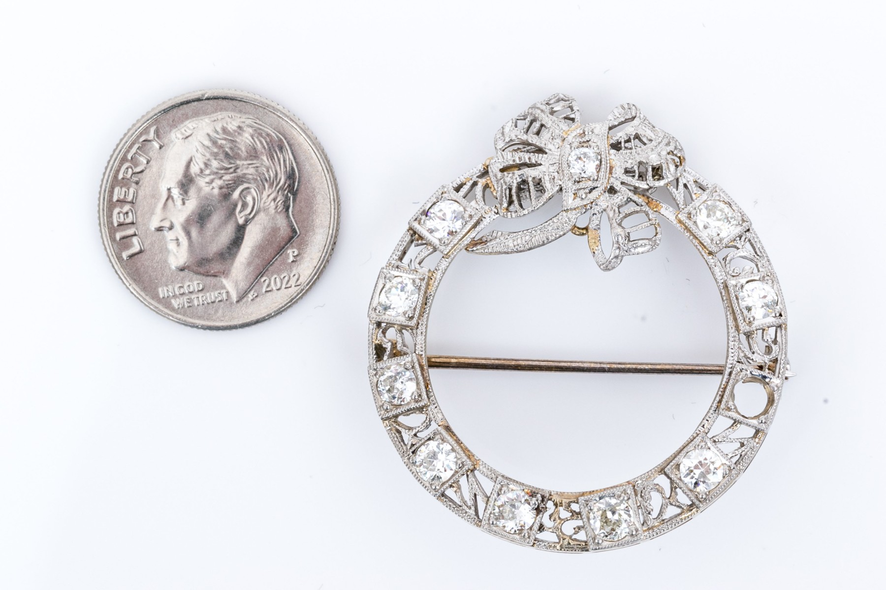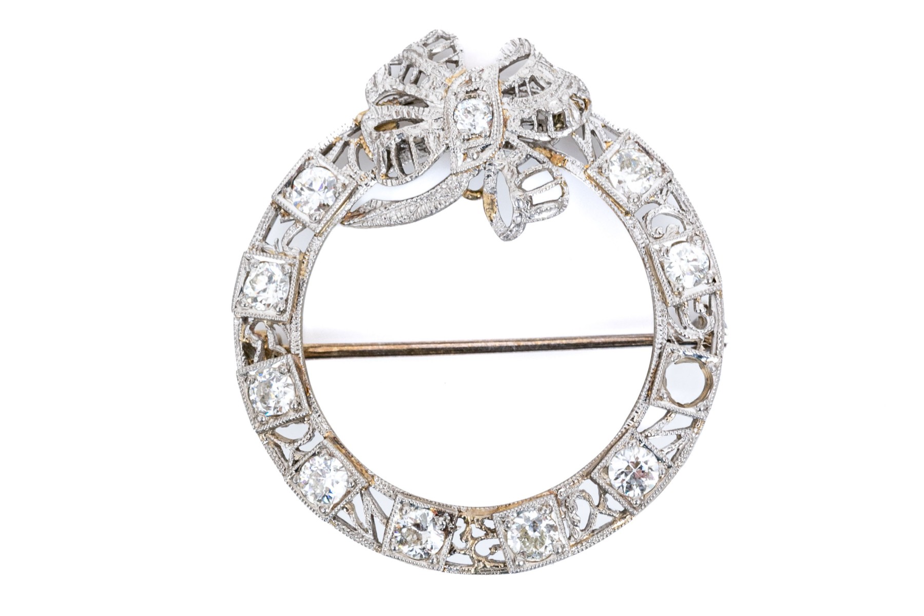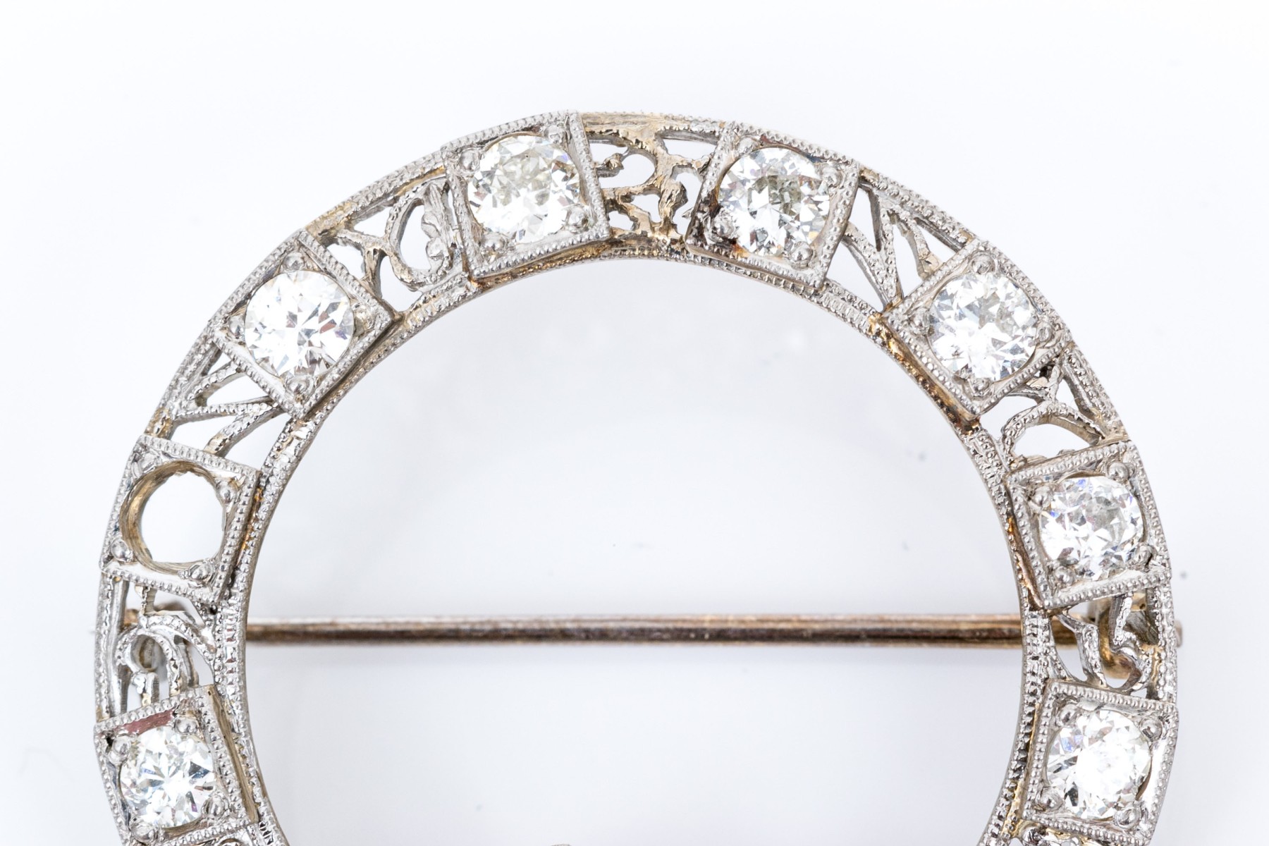 14K white gold filigree circle brooch. Set into the brooch at stations are Old European cut diamonds, approximately 1.0 TCW.