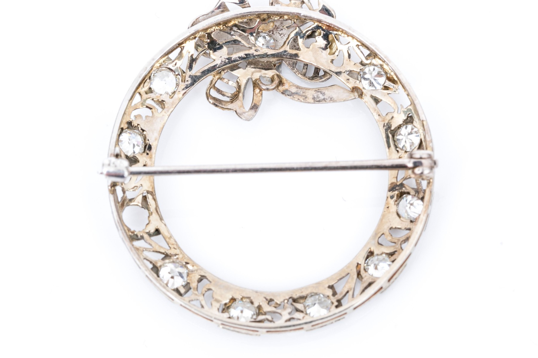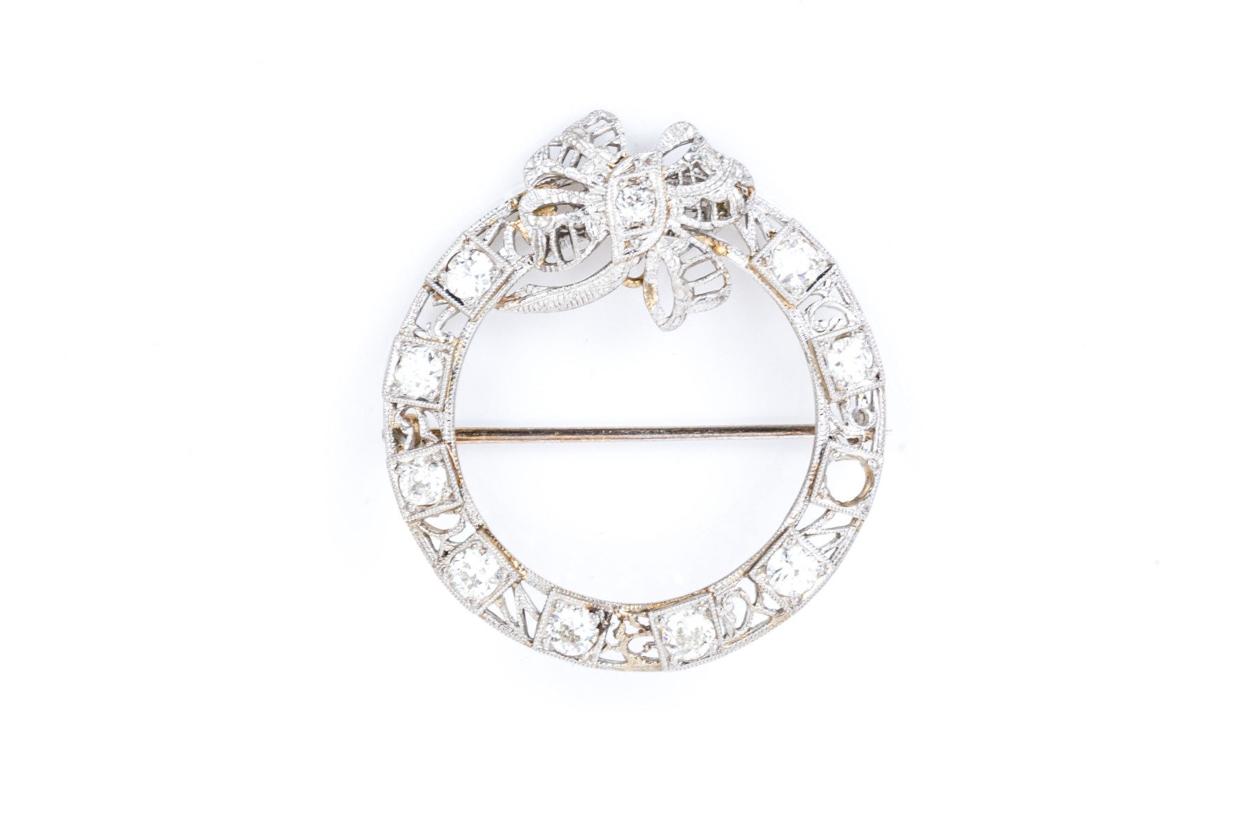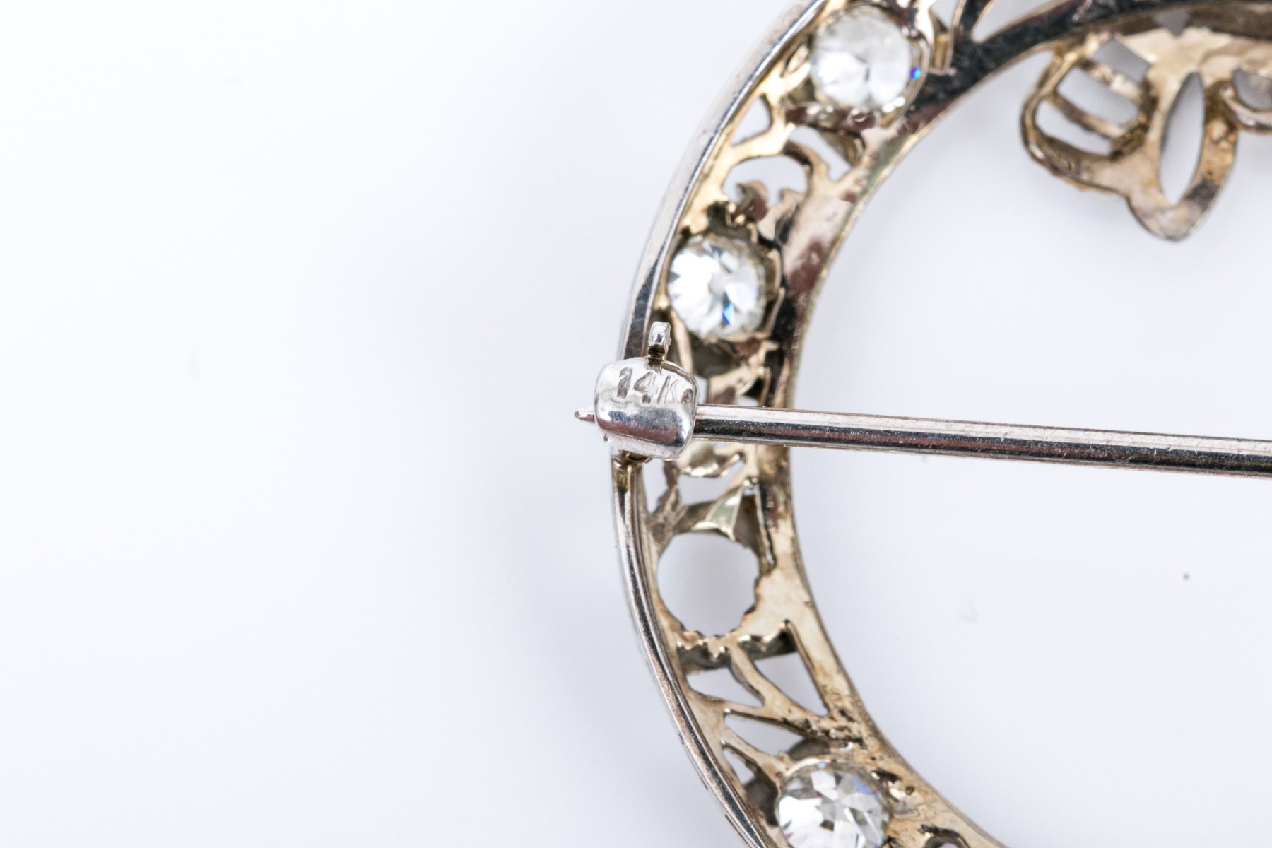 14K white gold filigree circle brooch. Set into the brooch at stations are Old European cut diamonds, approximately 1.0 TCW.