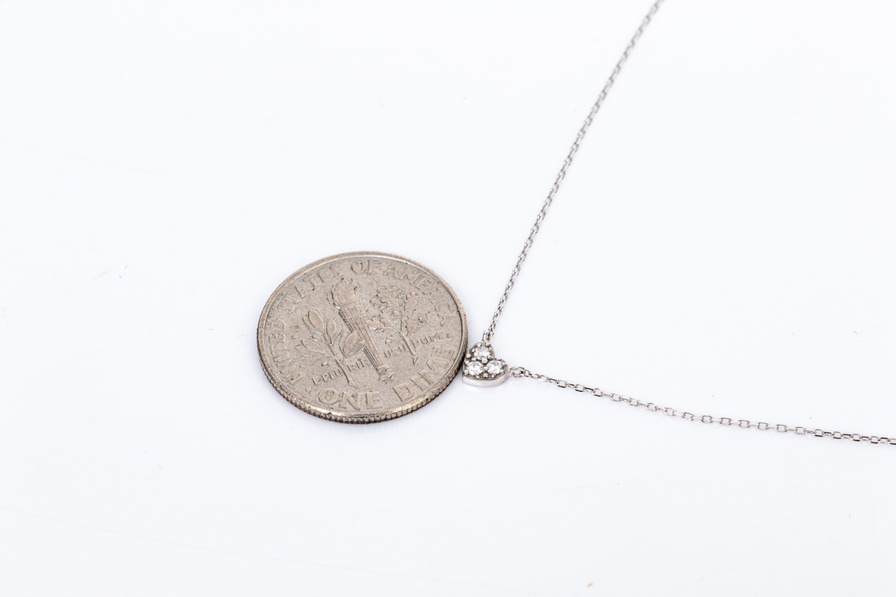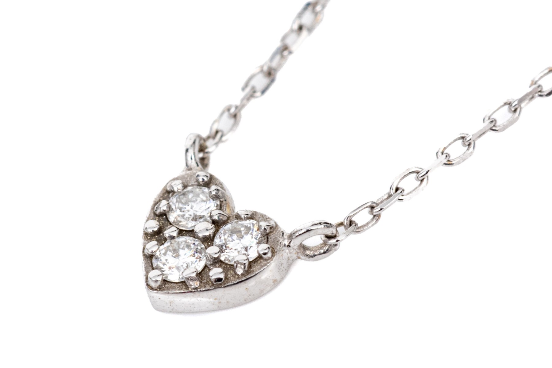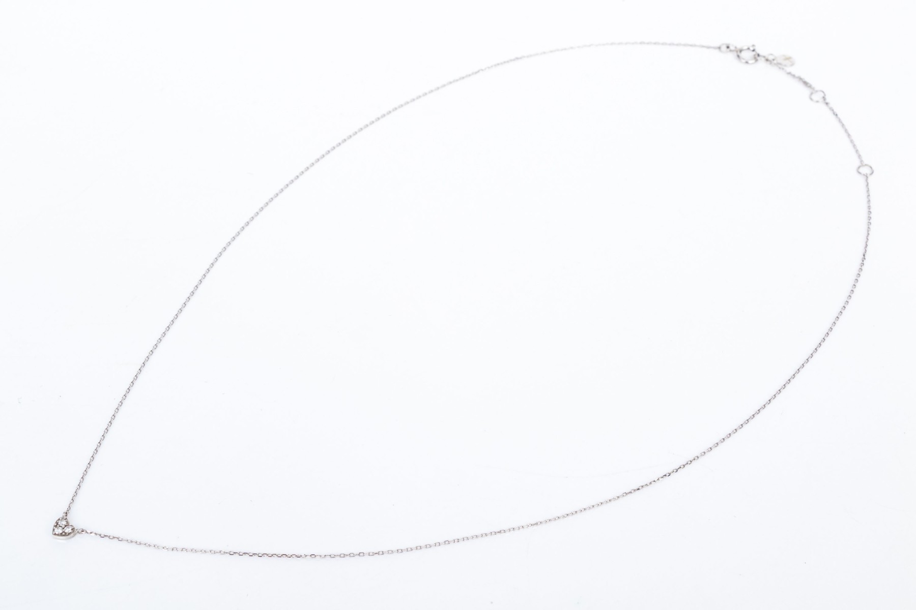 14k white gold fine curb link chain and tiny pave diamond set heart necklace, app. 0.03 TCW. This pretty necklace features a small diamond set heart, set into a curb link chain and finished with a spring ring style clasp. Adjustable length.