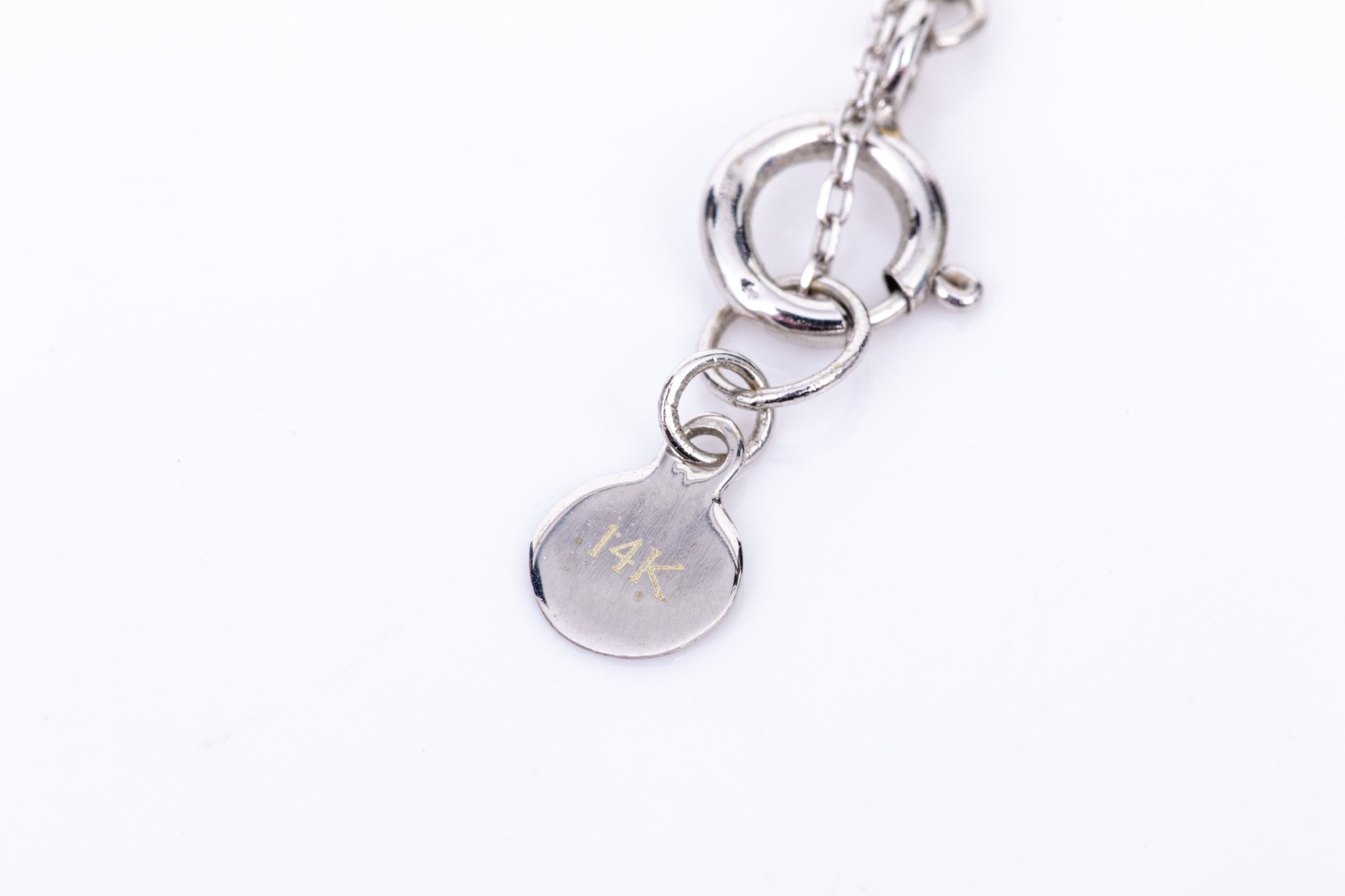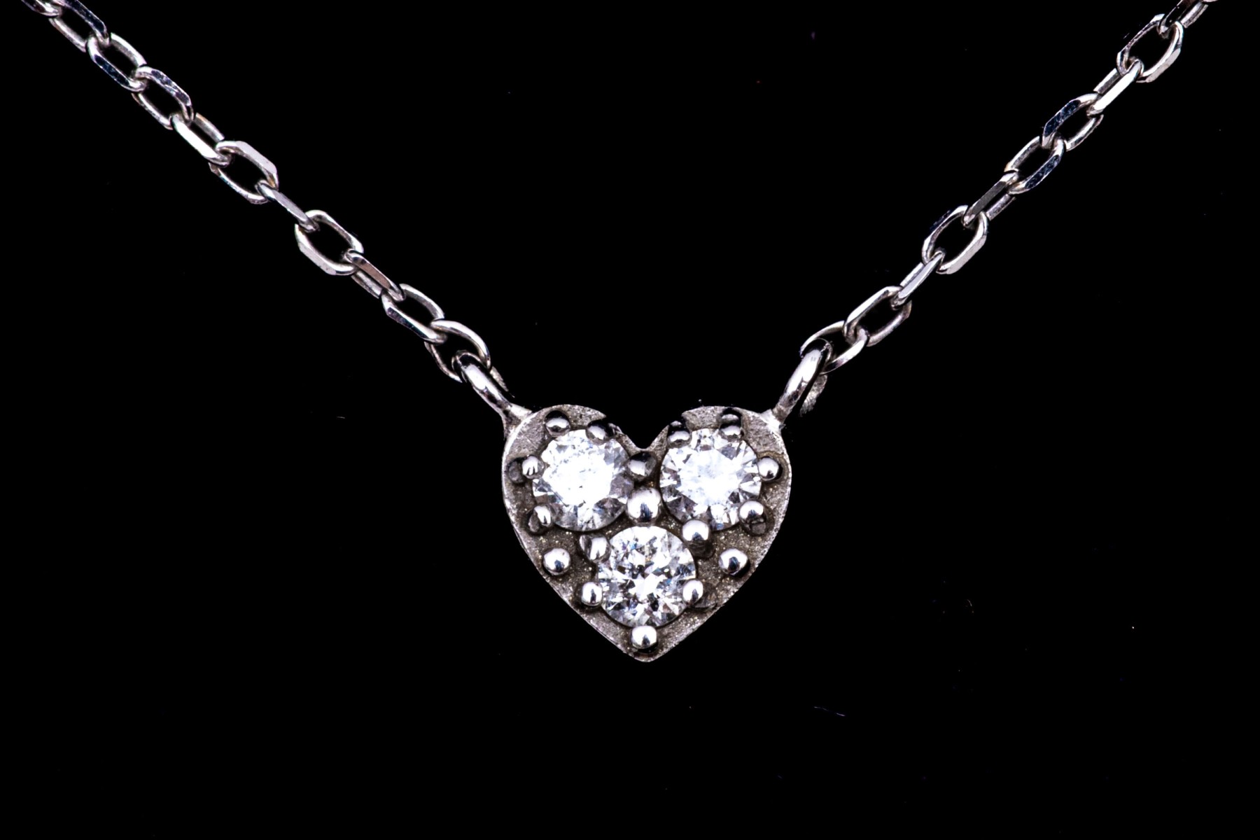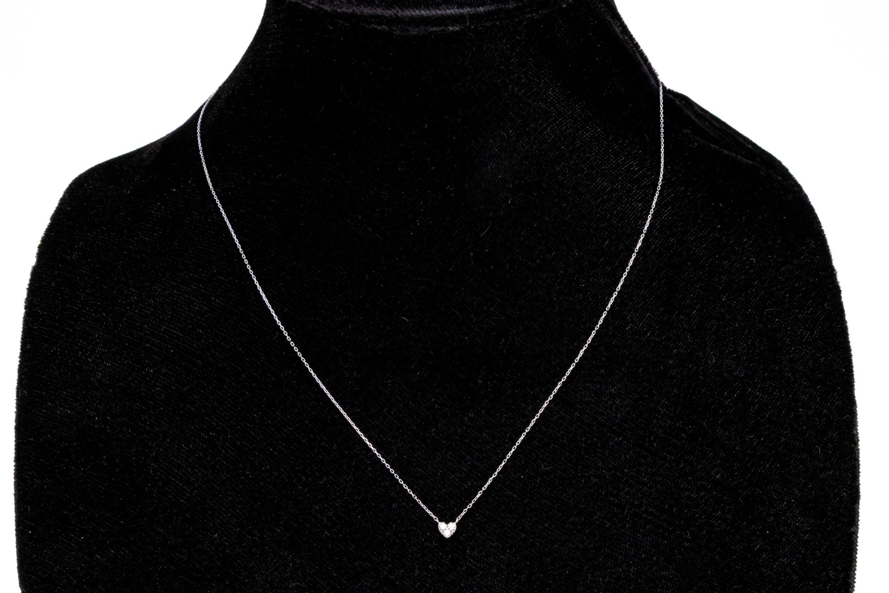 14k white gold fine curb link chain and tiny pave diamond set heart necklace, app. 0.03 TCW. This pretty necklace features a small diamond set heart, set into a curb link chain and finished with a spring ring style clasp. Adjustable length.