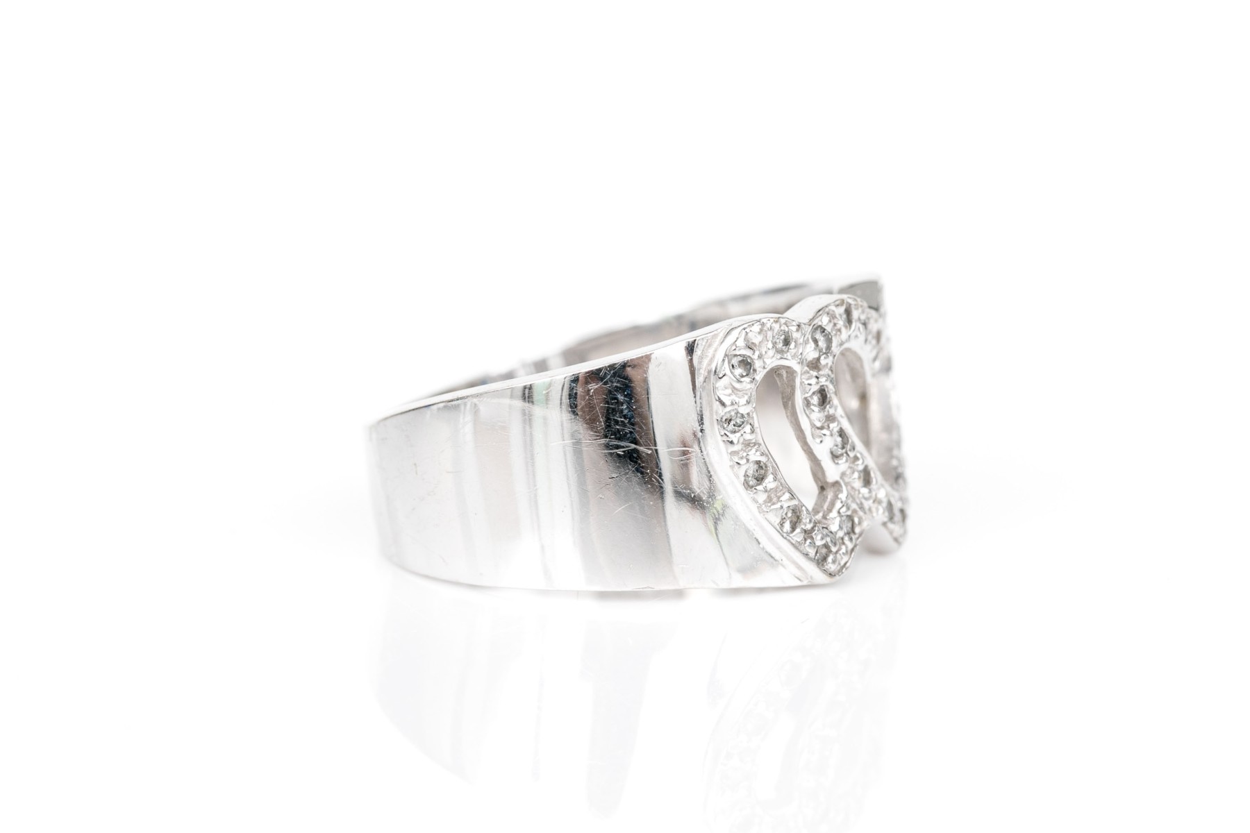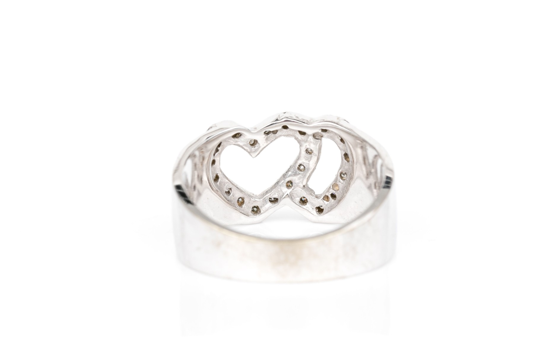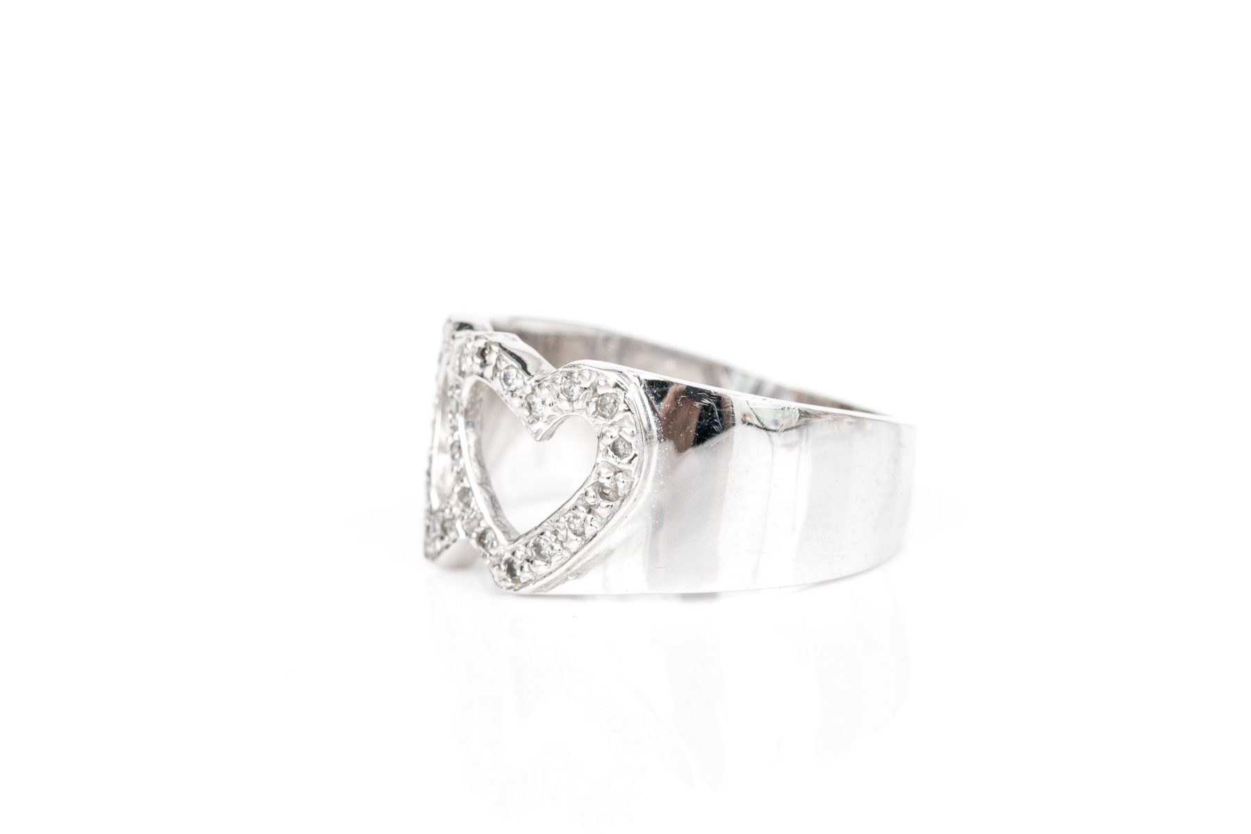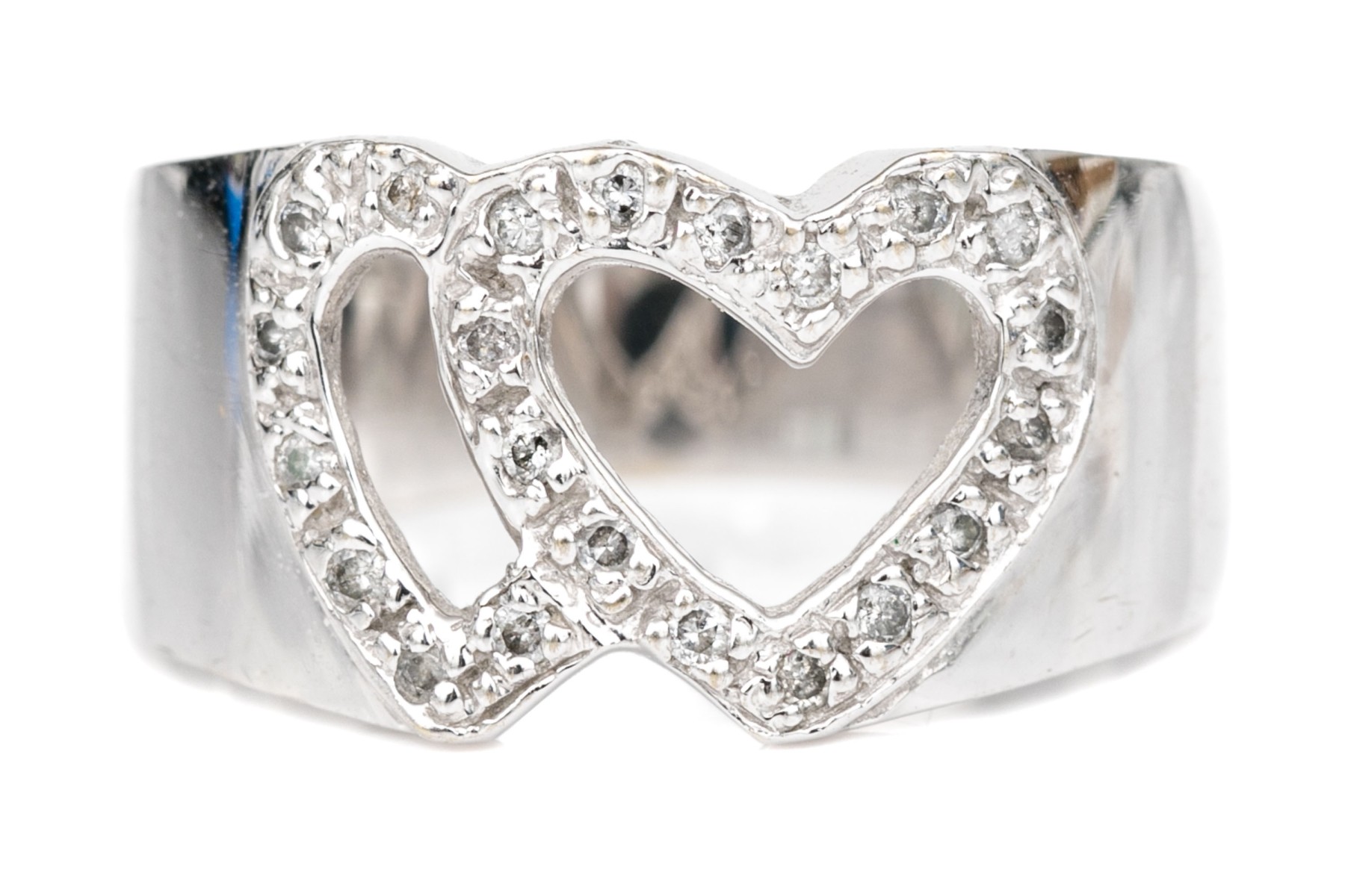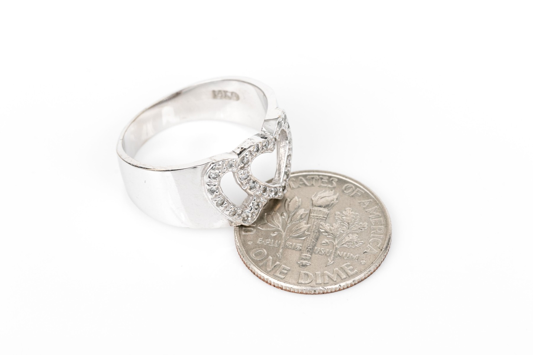 14k white gold fun wide double diamond set open heart ring, app. 0.07 TCW, size 6.5. The diamonds are I2 clarity K color