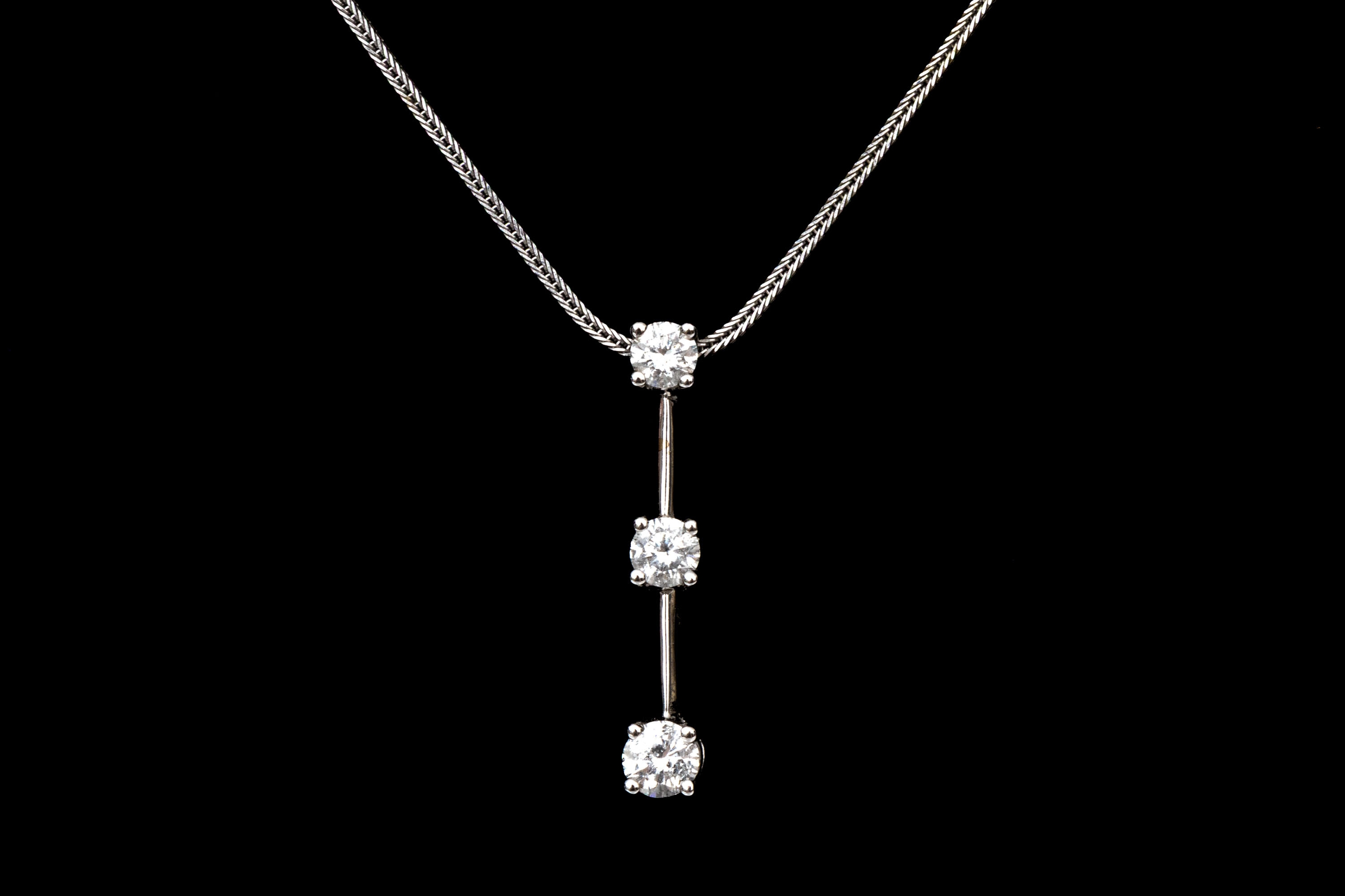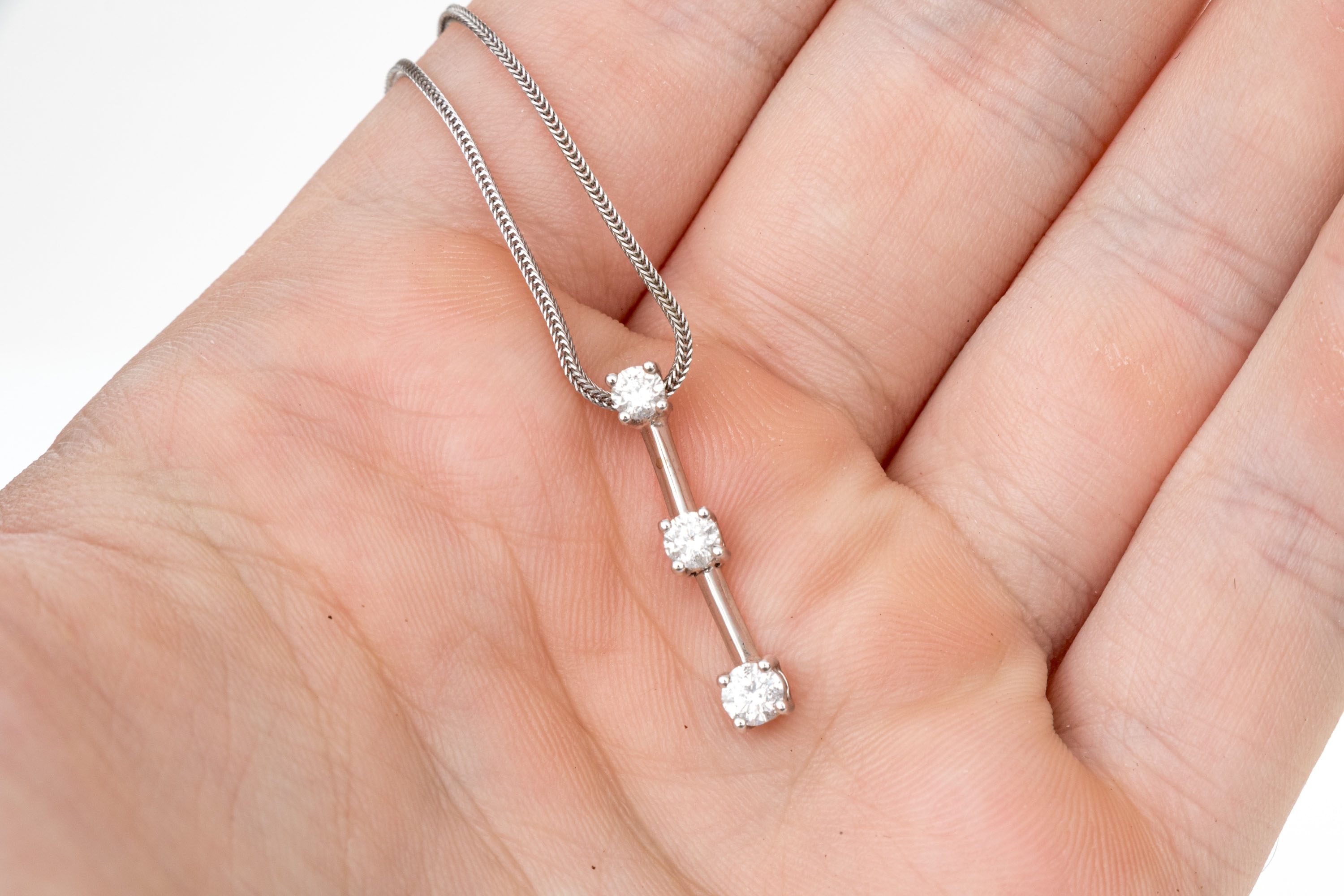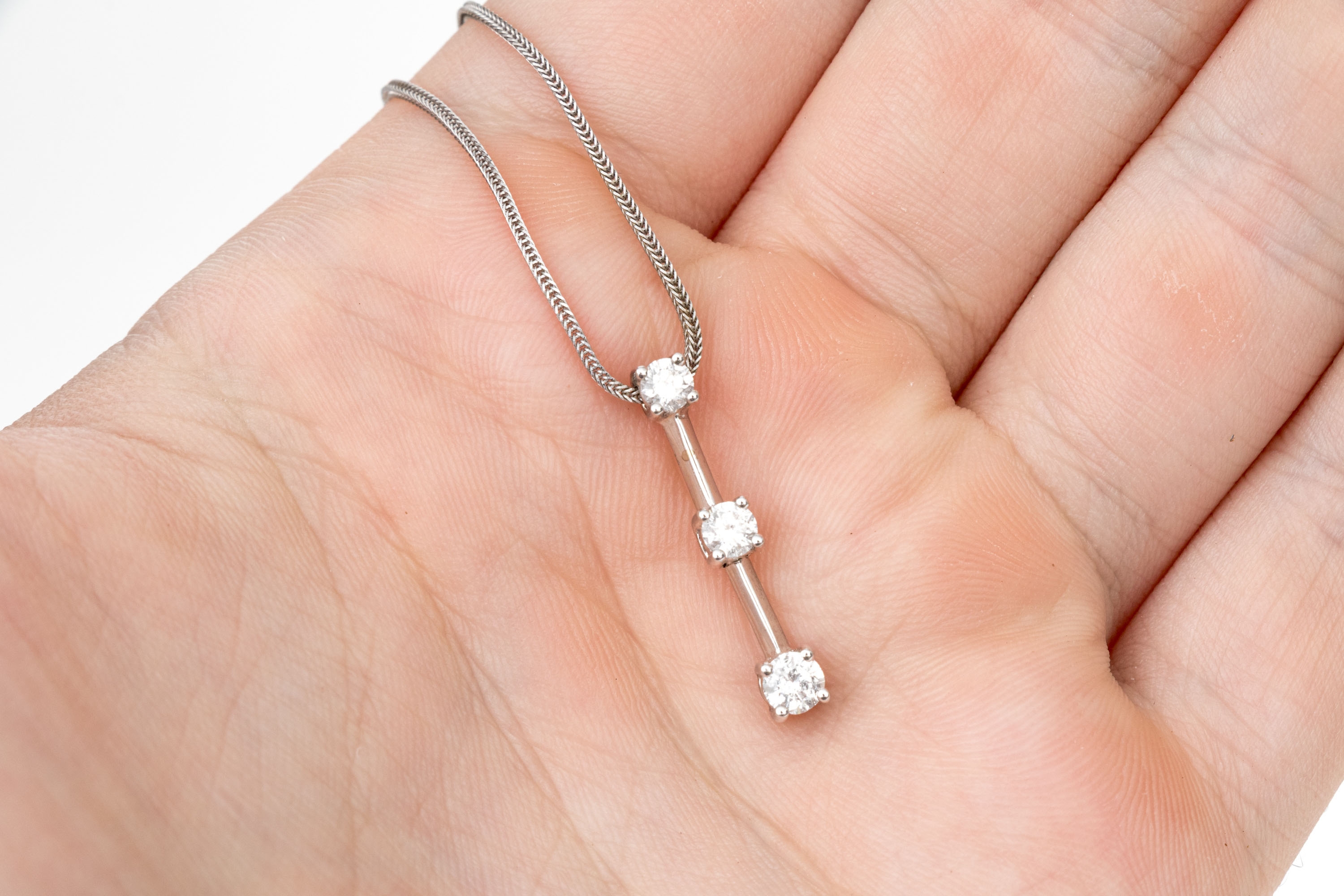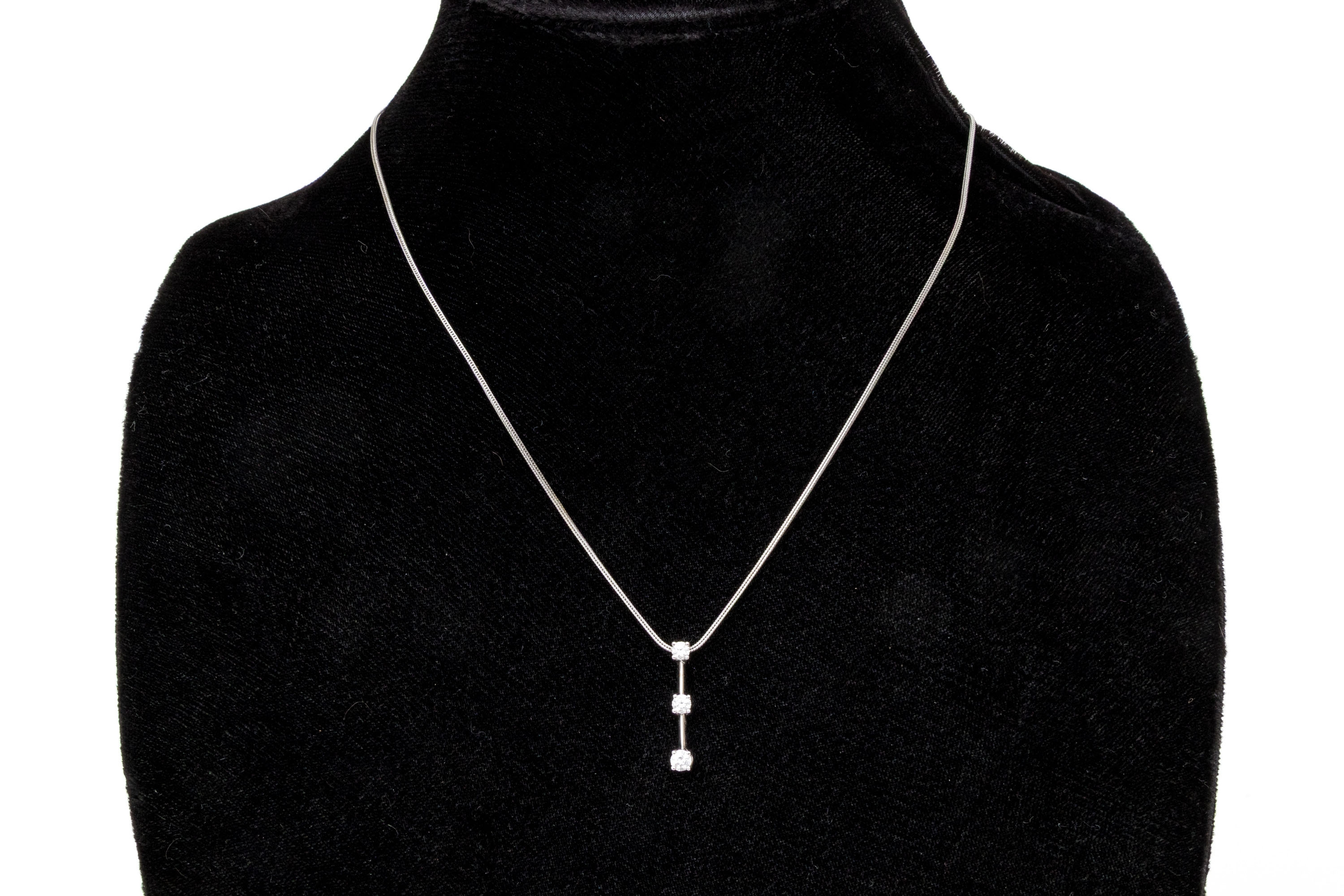14k white gold pendant. This contemporary pendant contains three graduated round brilliant cut diamonds, approximately 0.41 TCW and prong set, stacked vertically with a connecting bars in between. The pendant is suspended from a wheat chain with a spring ring clasp.