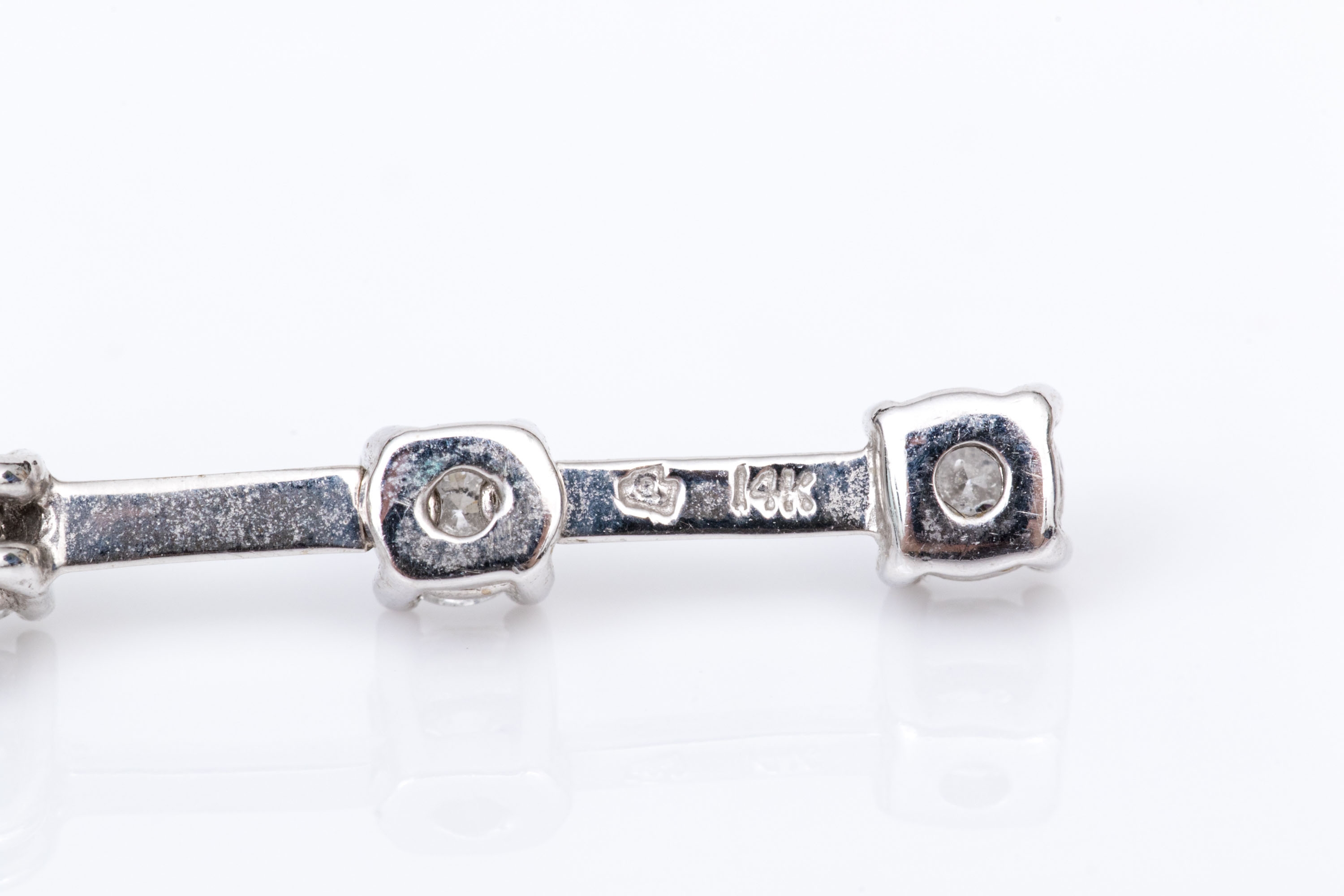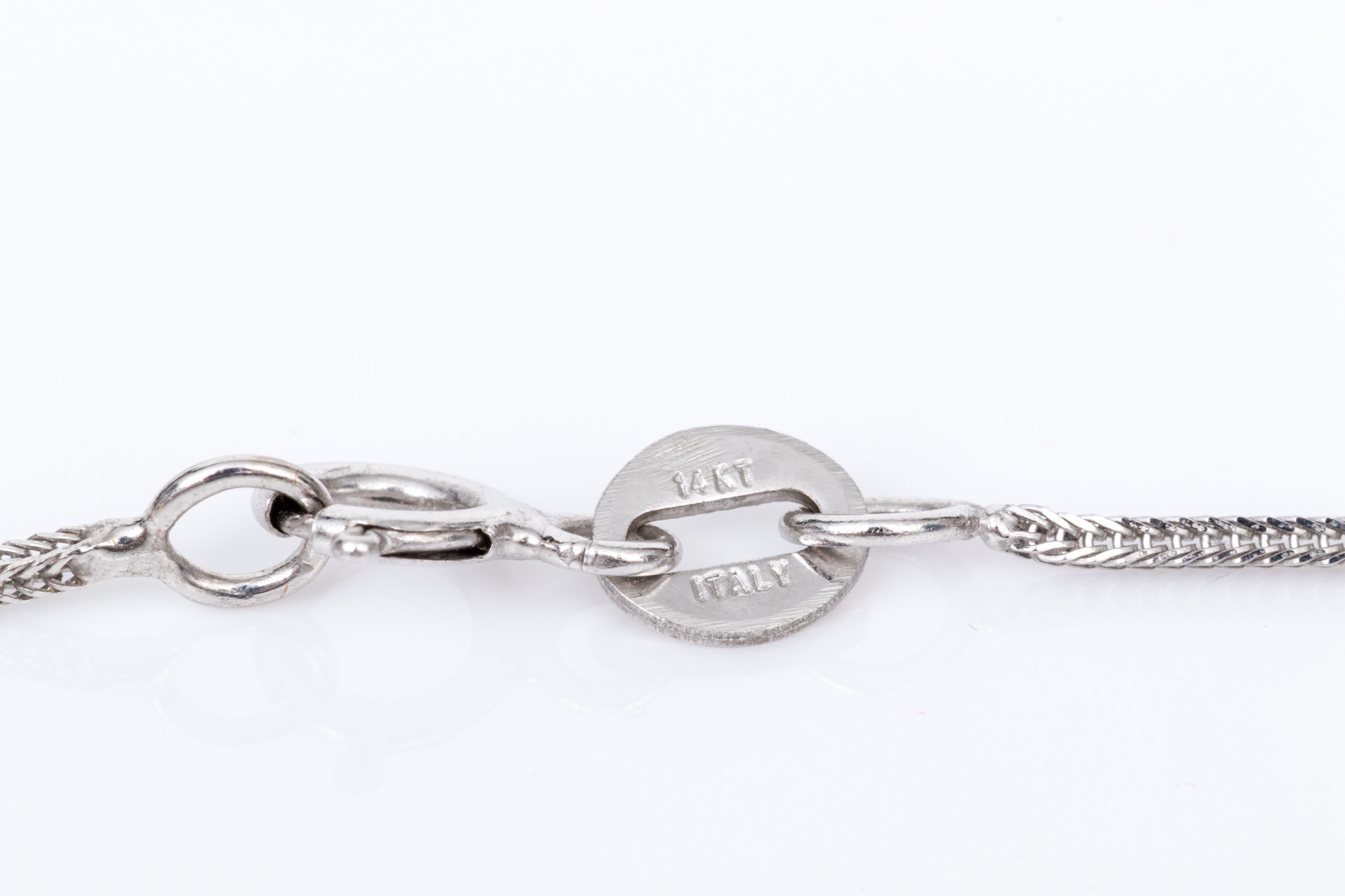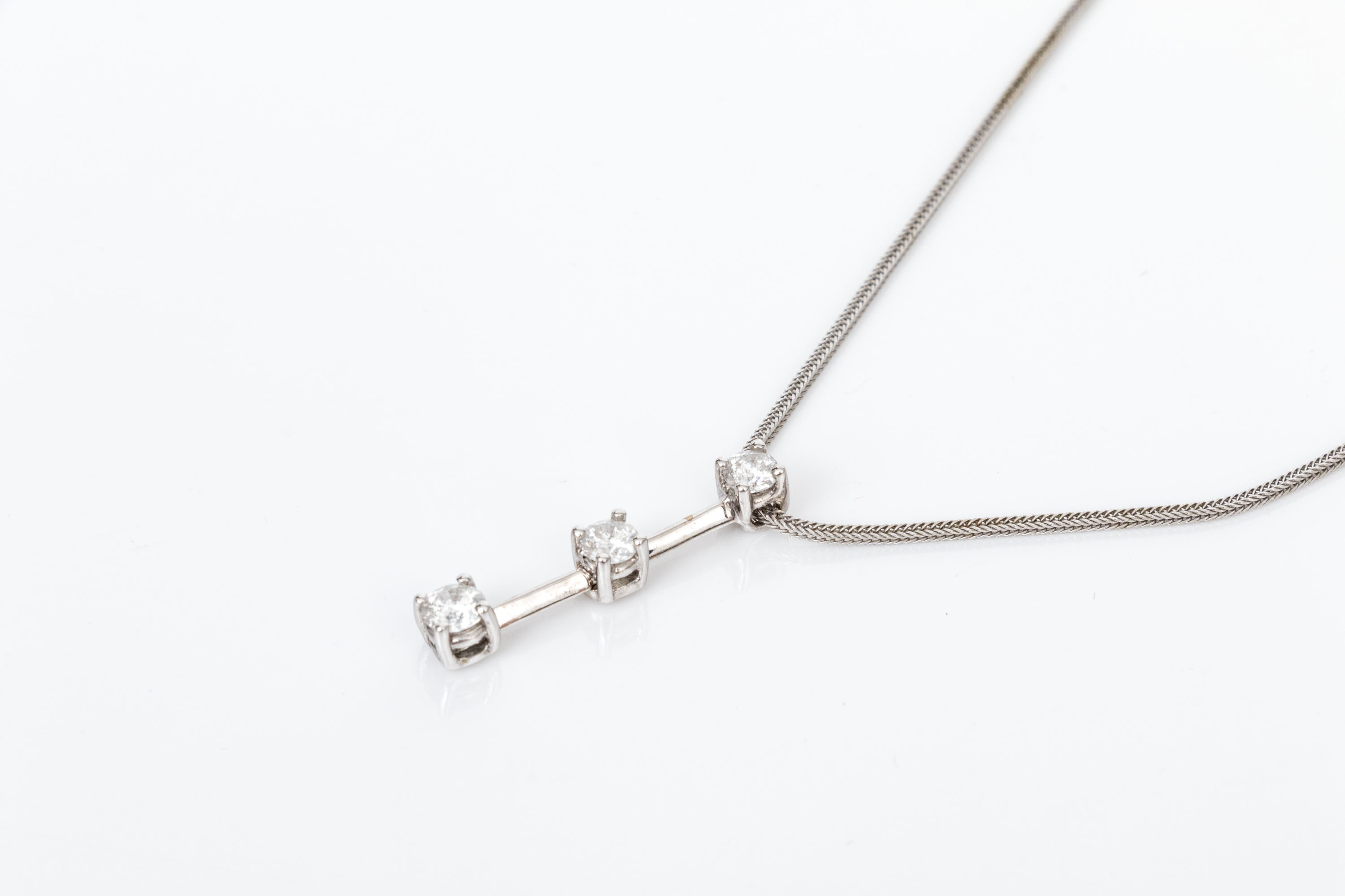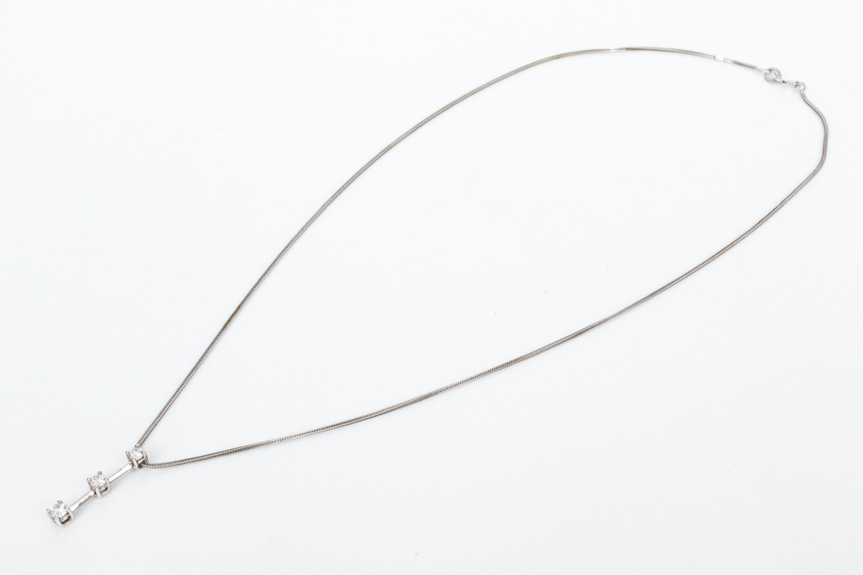 14k white gold pendant. This contemporary pendant contains three graduated round brilliant cut diamonds, approximately 0.41 TCW and prong set, stacked vertically with a connecting bars in between. The pendant is suspended from a wheat chain with a spring ring clasp.