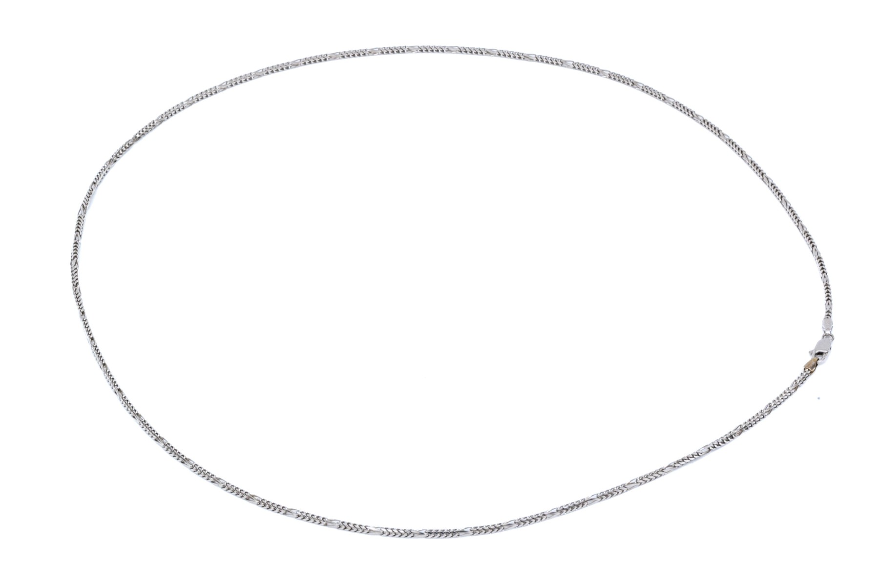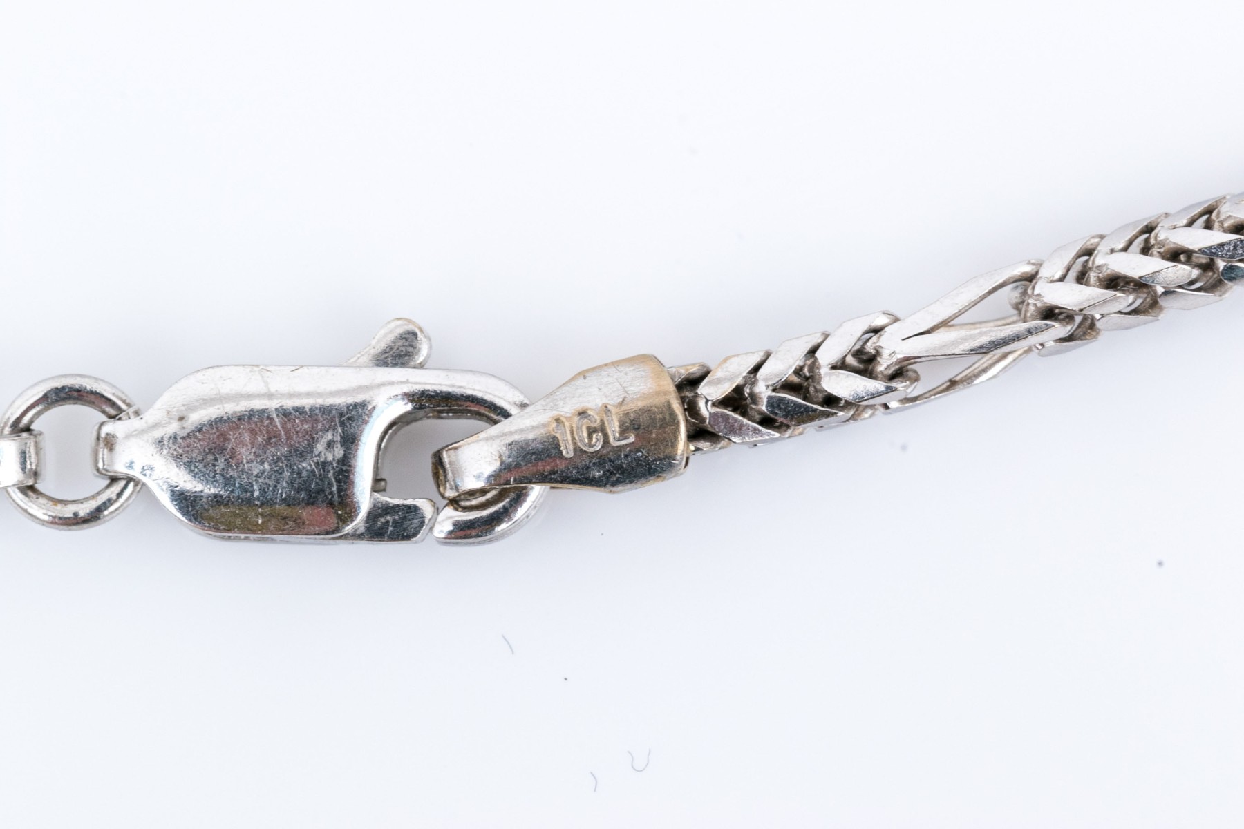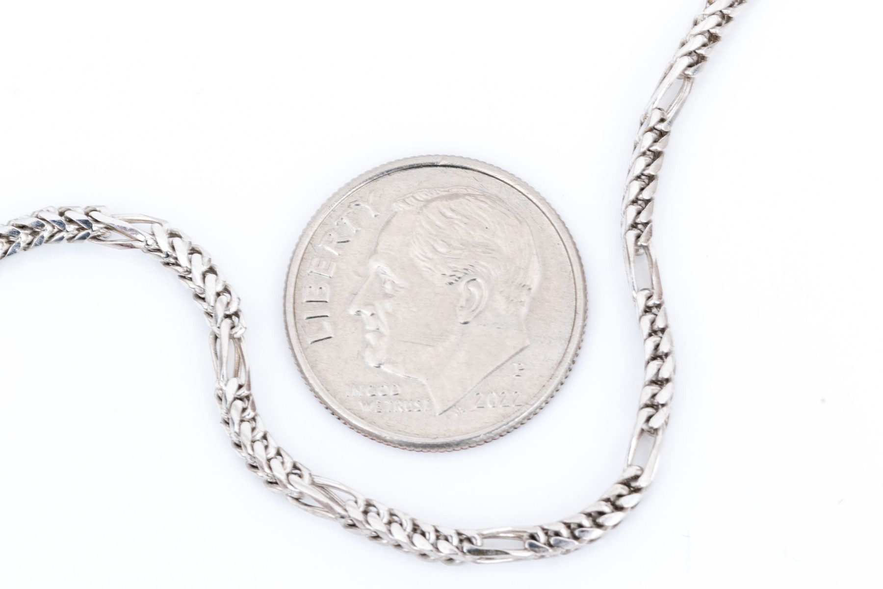 14k white gold handsome foxtail patterned matinee length link chain, finished with a lobster claw style clasp