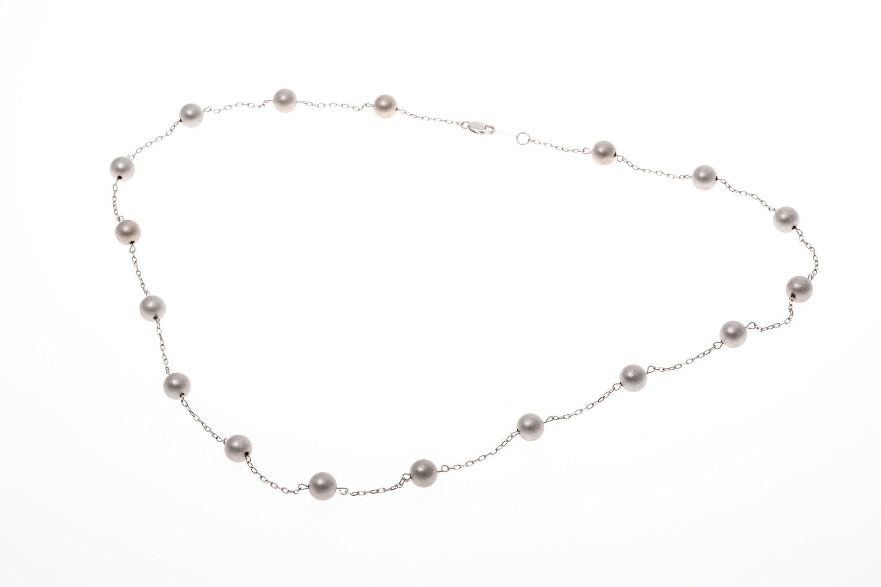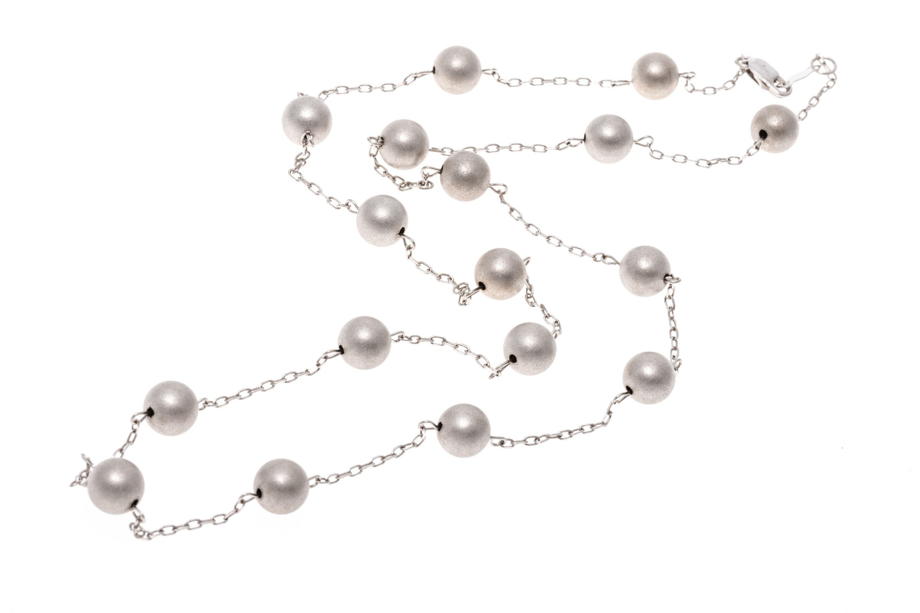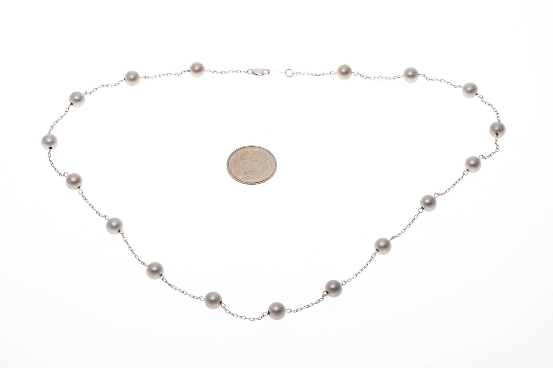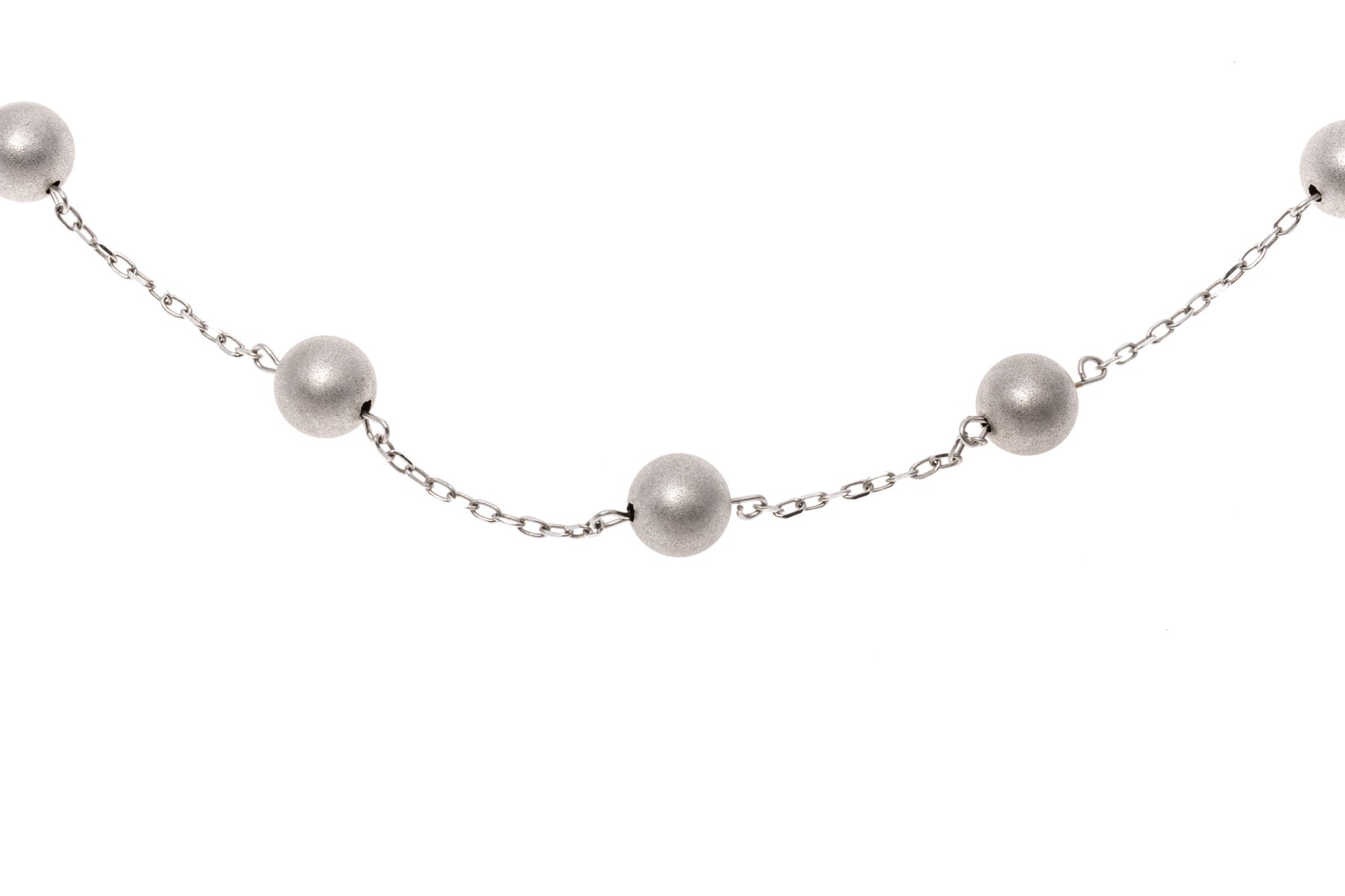 14k white gold necklace. This handsome white gold necklace is a tin cup style, decorated with brushed, 5.75 mm beads, alternating with a curb link style chain. The necklace is finished with a lobster claw style clasp.