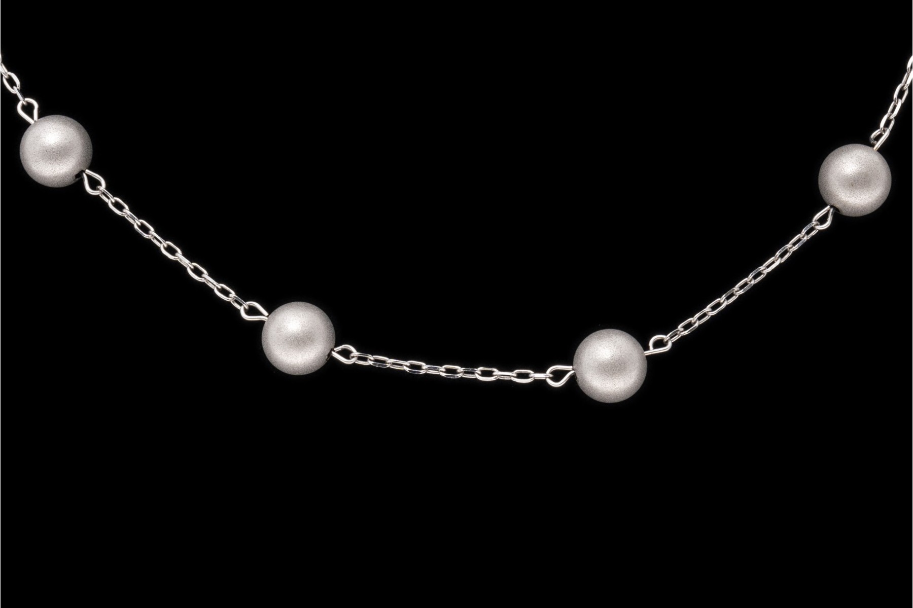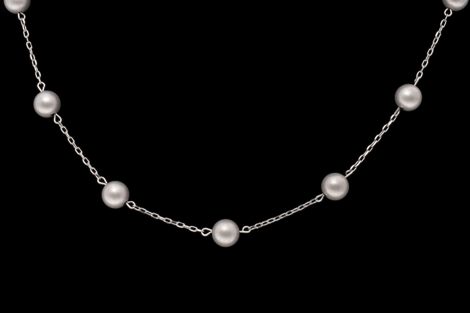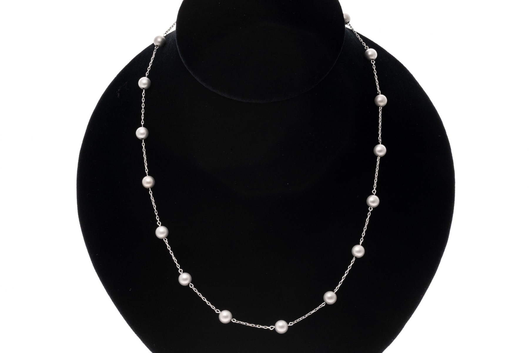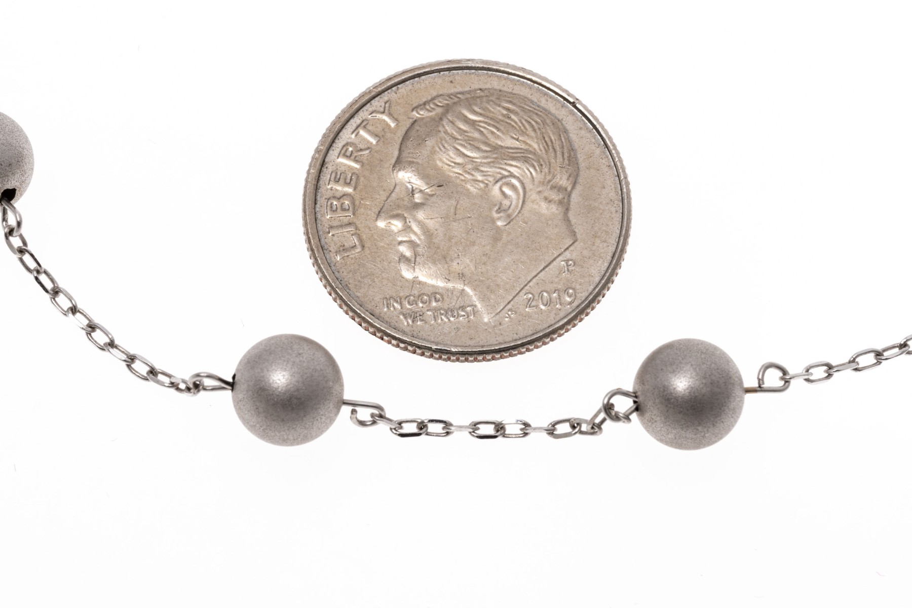 14k white gold necklace. This handsome white gold necklace is a tin cup style, decorated with brushed, 5.75 mm beads, alternating with a curb link style chain. The necklace is finished with a lobster claw style clasp.