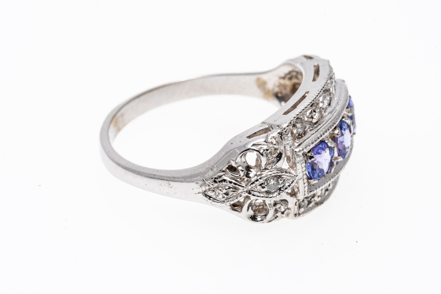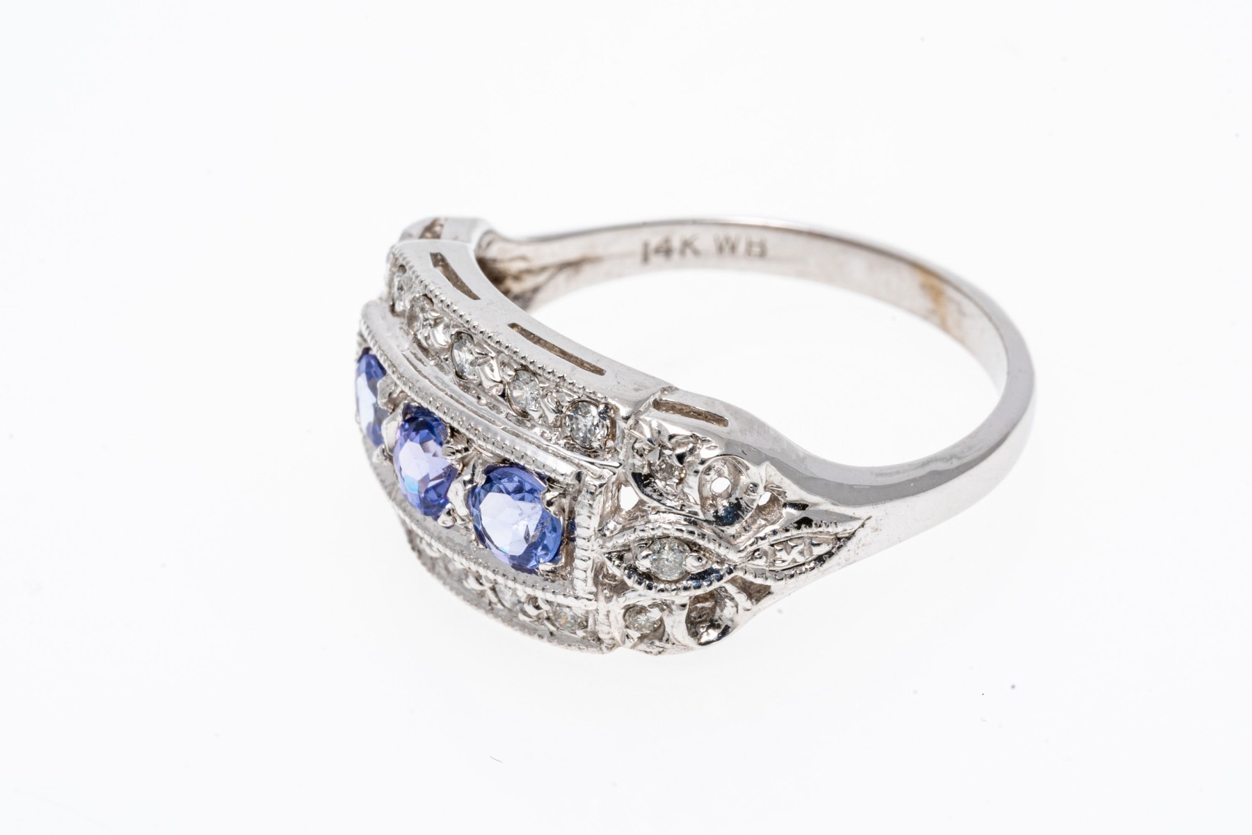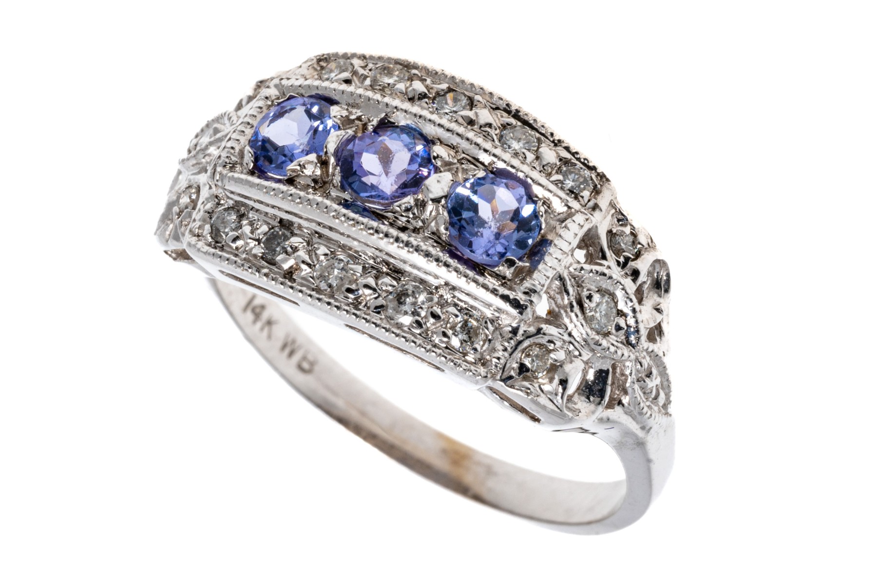 14K white gold ring. The ring displays a row of three round faceted iolite stones within a frame of round faceted diamonds. The iolite are approximately 0.3 TCW. Ring size 7.
