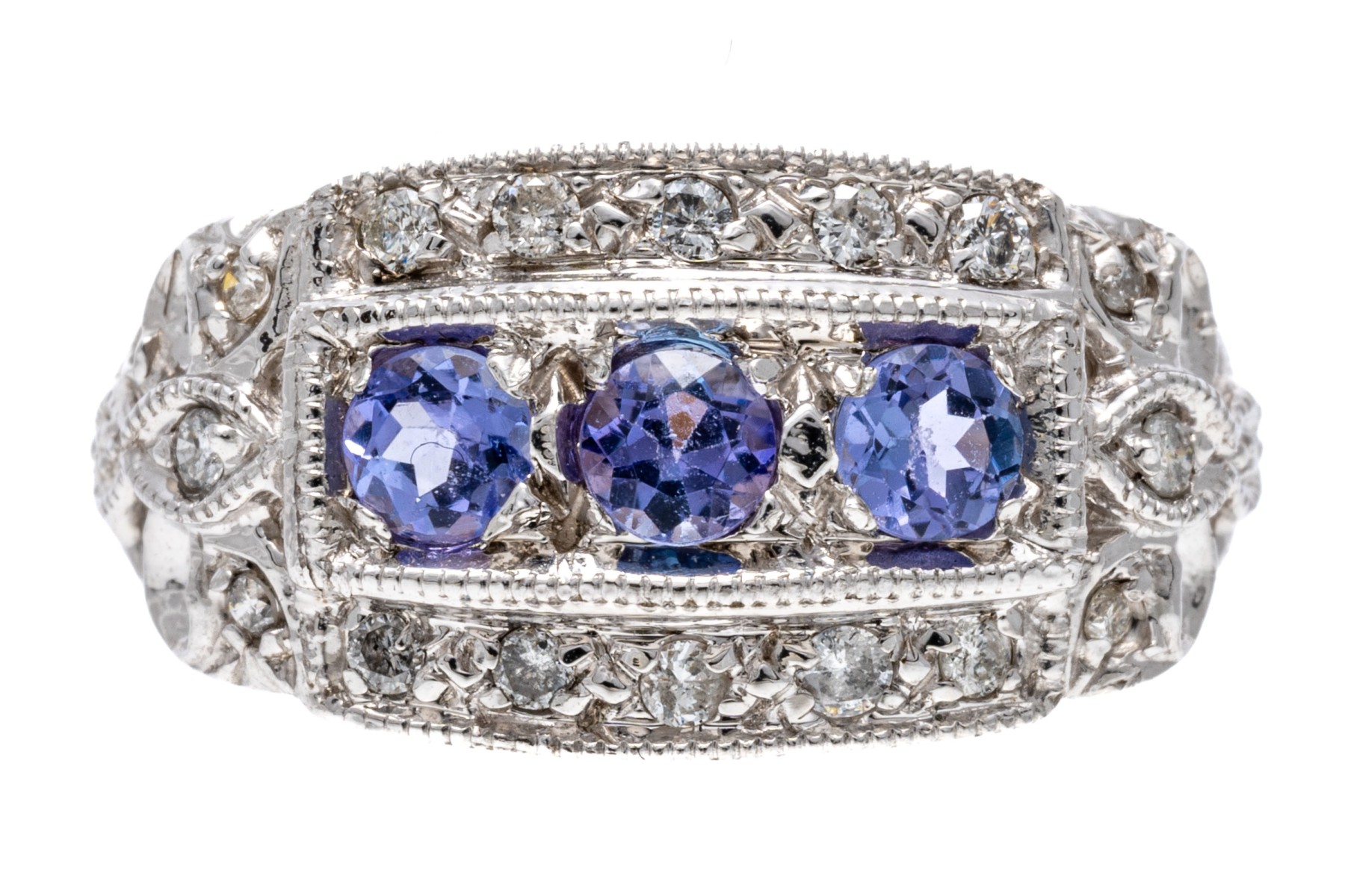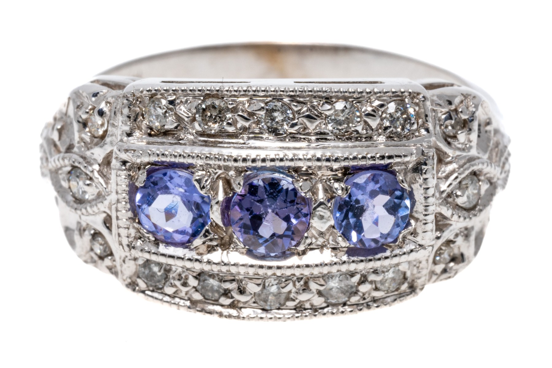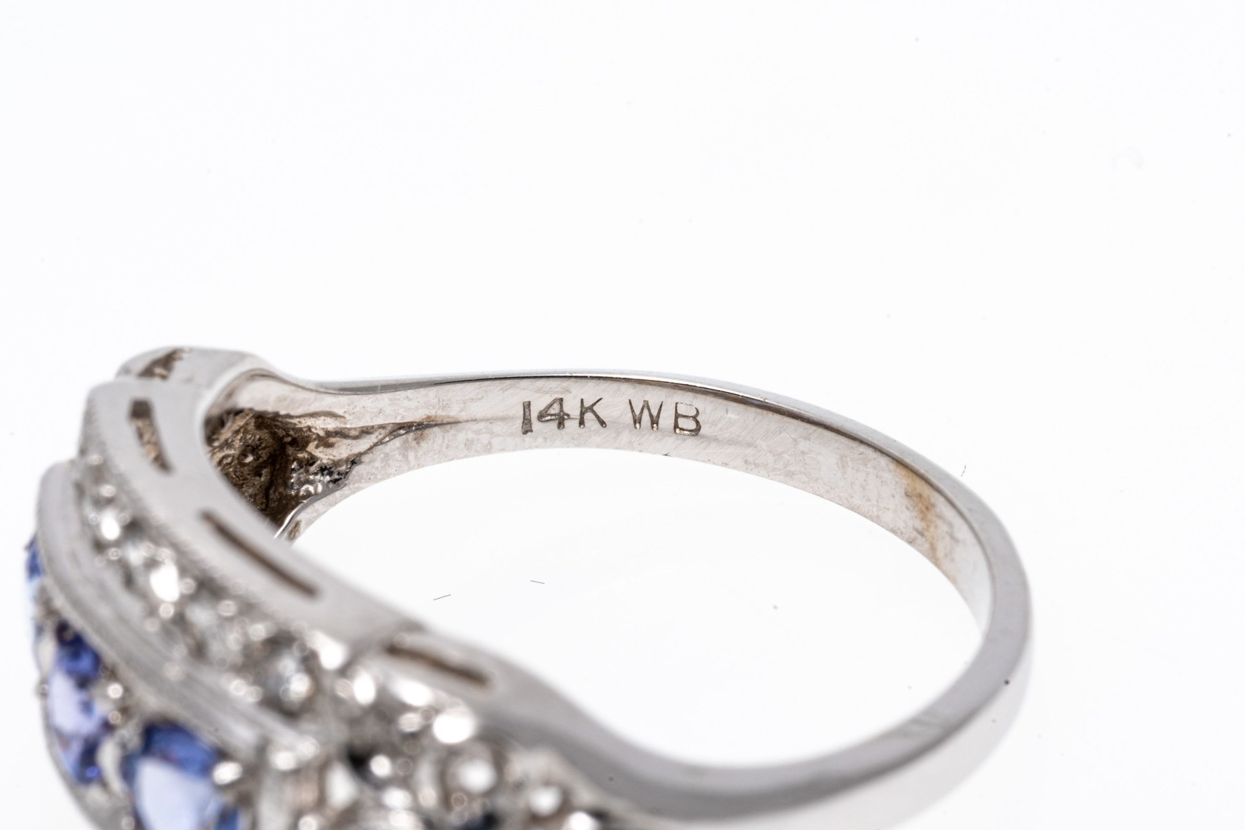 14K white gold ring. The ring displays a row of three round faceted iolite stones within a frame of round faceted diamonds. The iolite are approximately 0.3 TCW. Ring size 7.