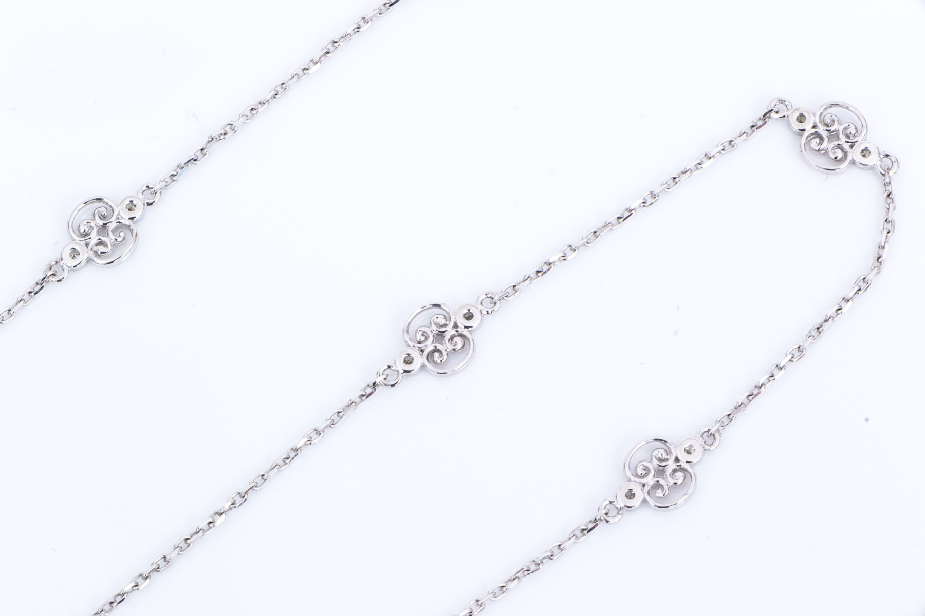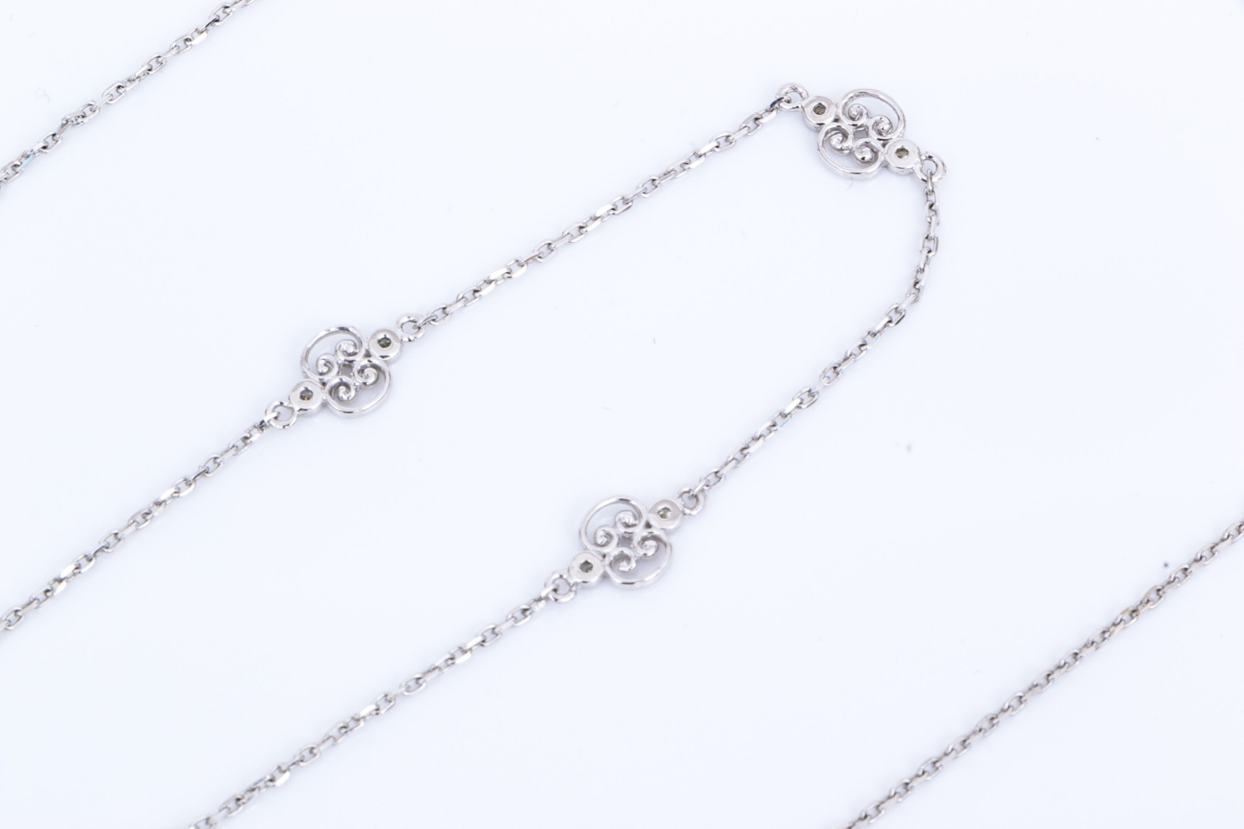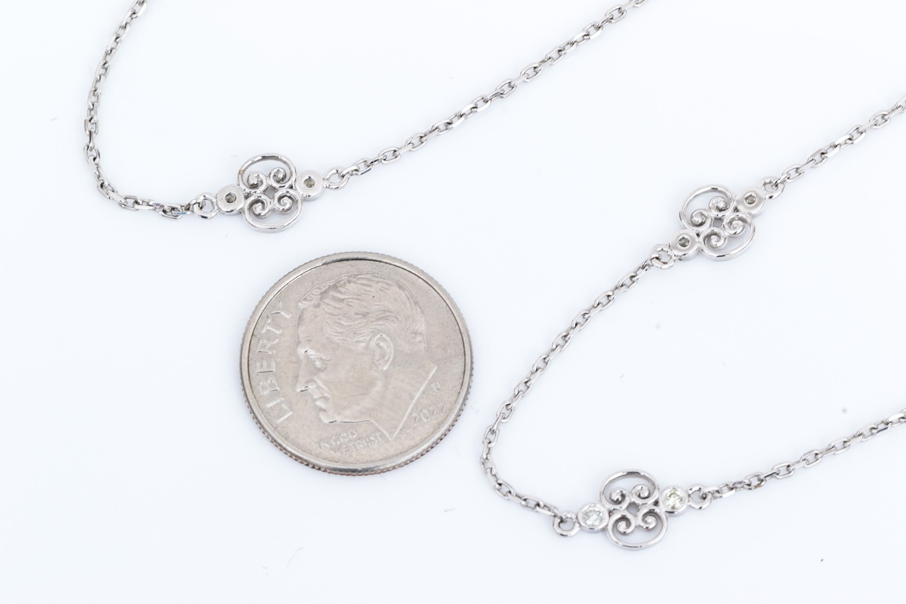 14k white gold lovely opera length diamond set station necklace, app. 0.24 TCW, bezel set, finished with a curb style chain and lobster claw clasp