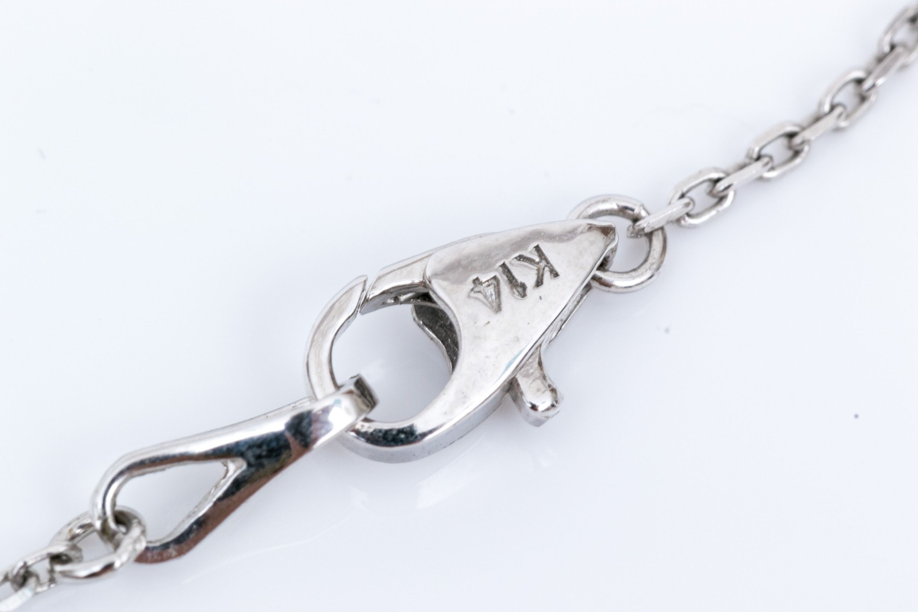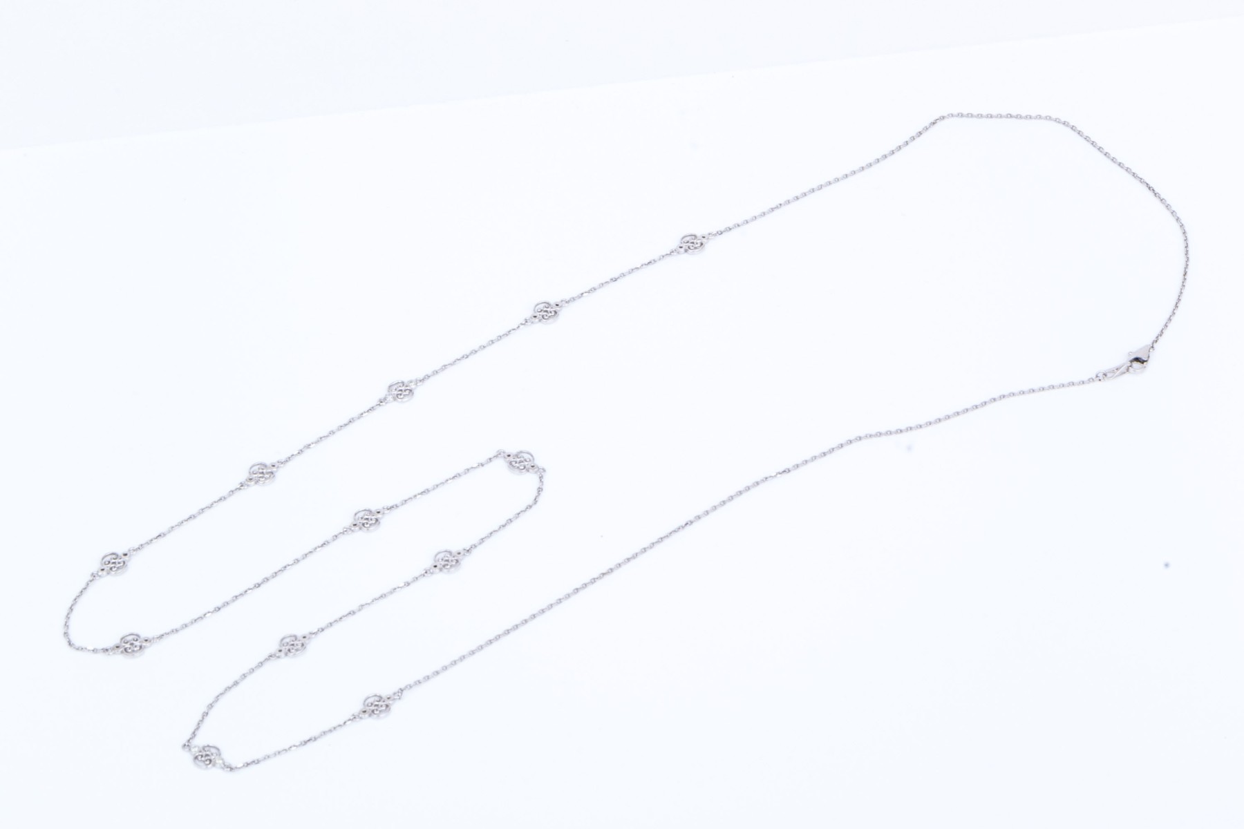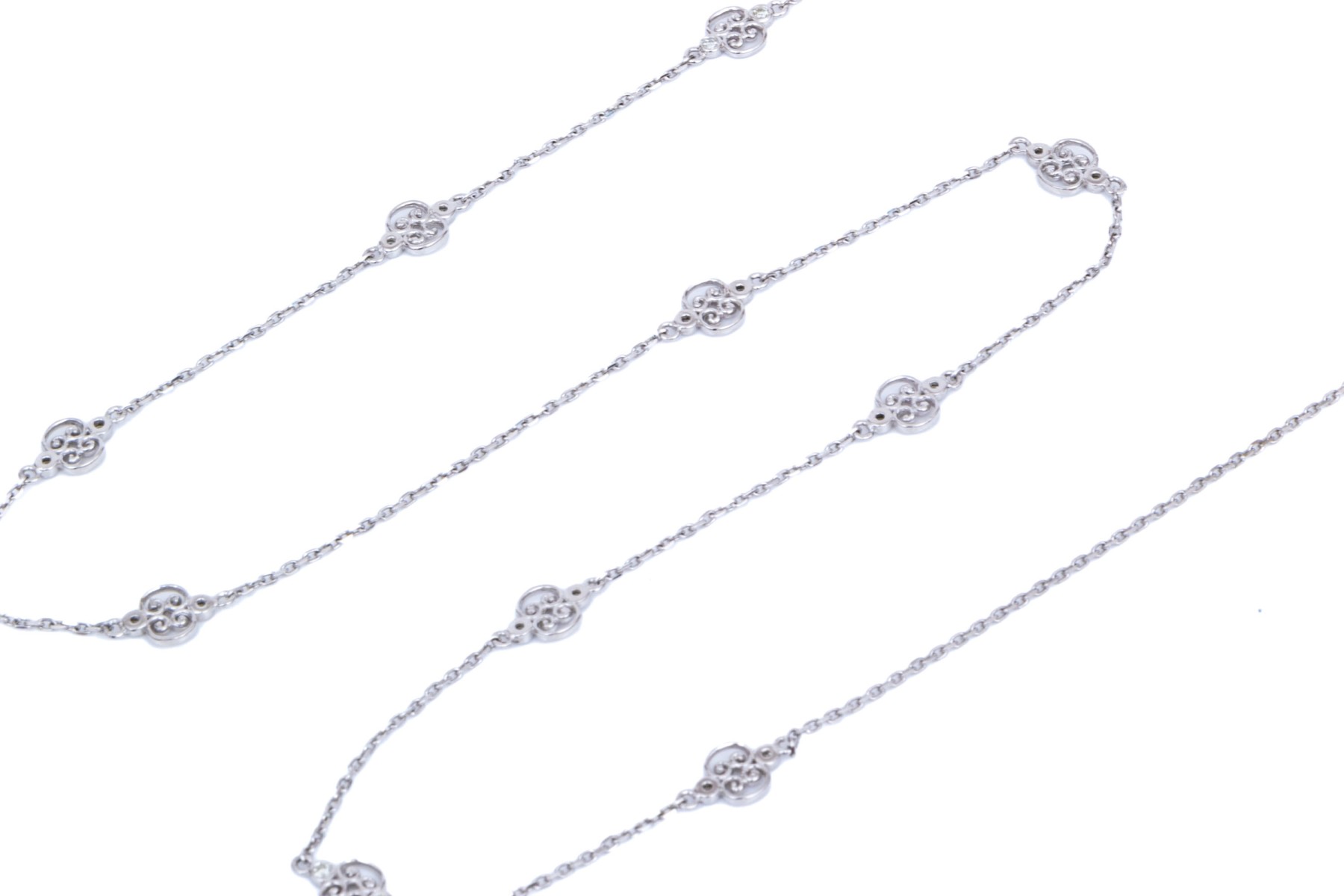 14k white gold lovely opera length diamond set station necklace, app. 0.24 TCW, bezel set, finished with a curb style chain and lobster claw clasp