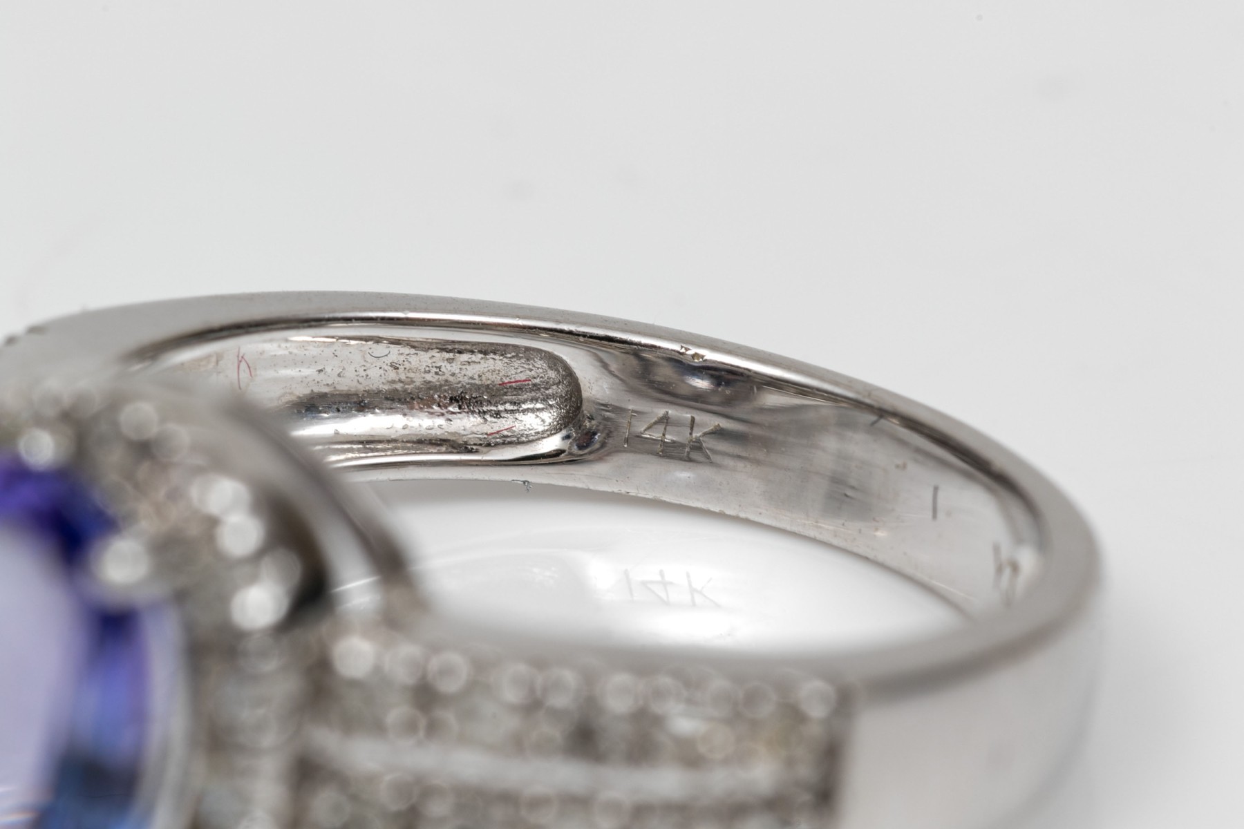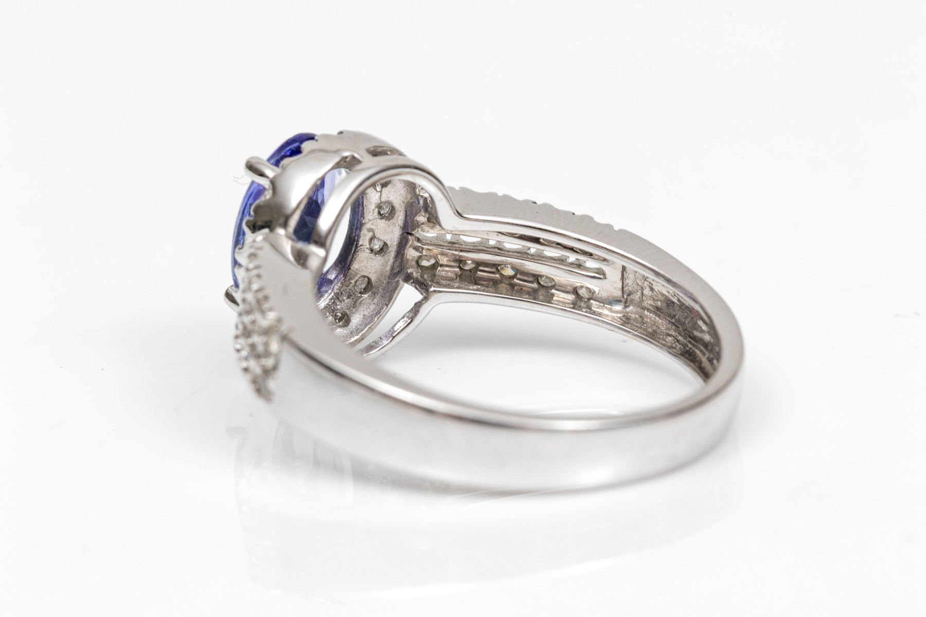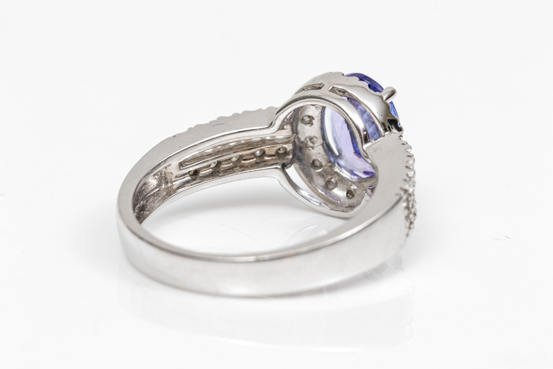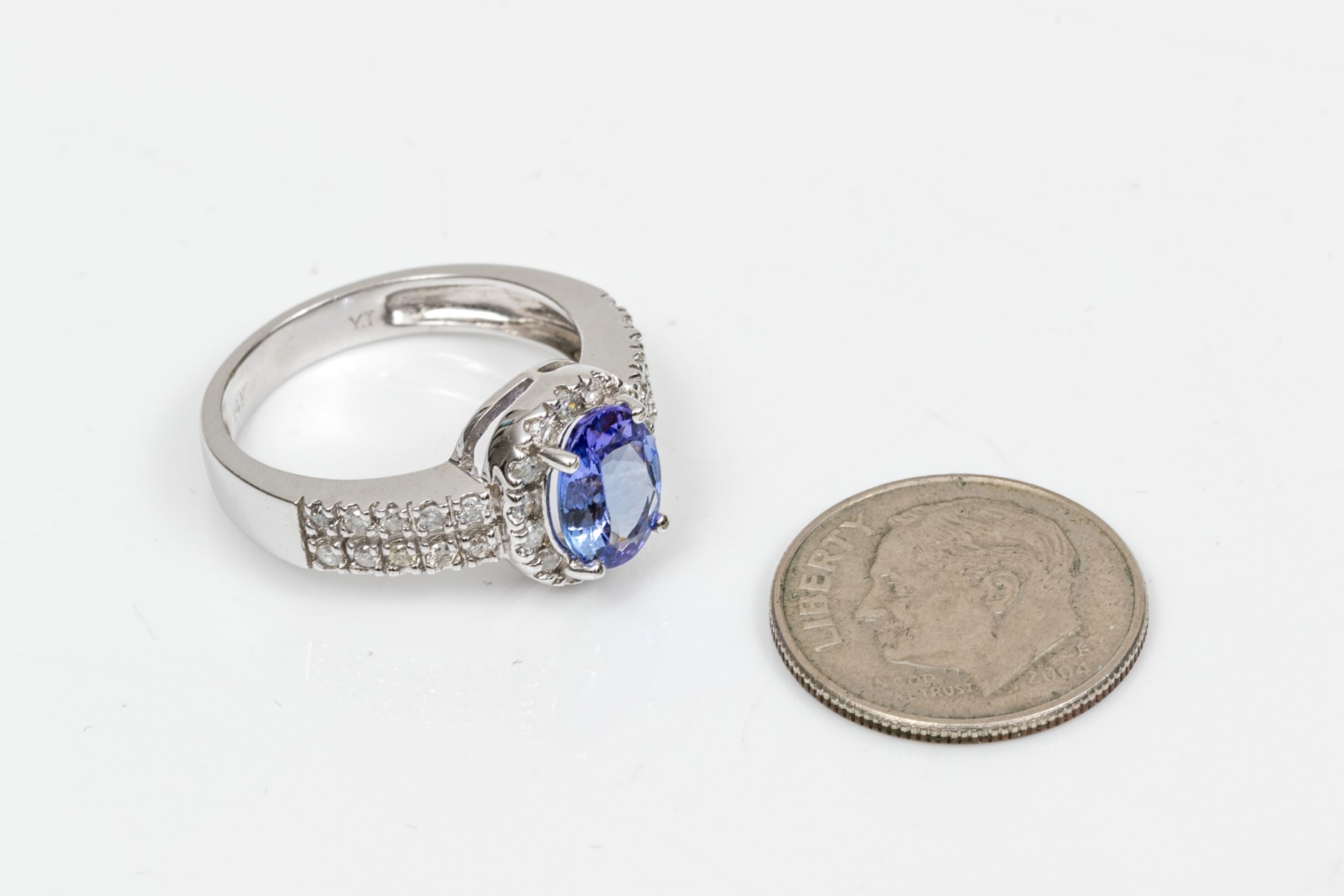 14k white gold lovely oval tanzanite and diamond halo ring, size 7, diamonds app. 0.34, tanzanite is app. 1.05 CTS, prong set