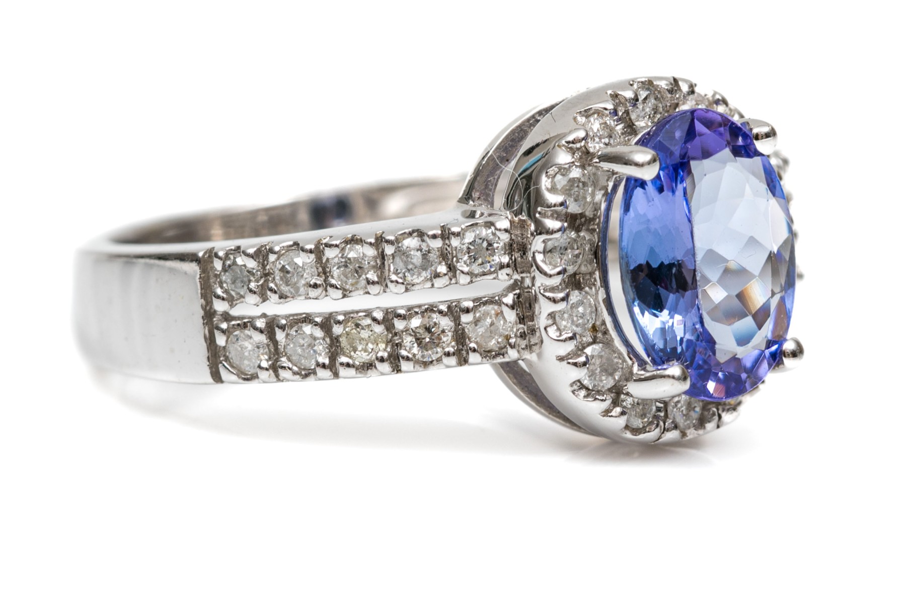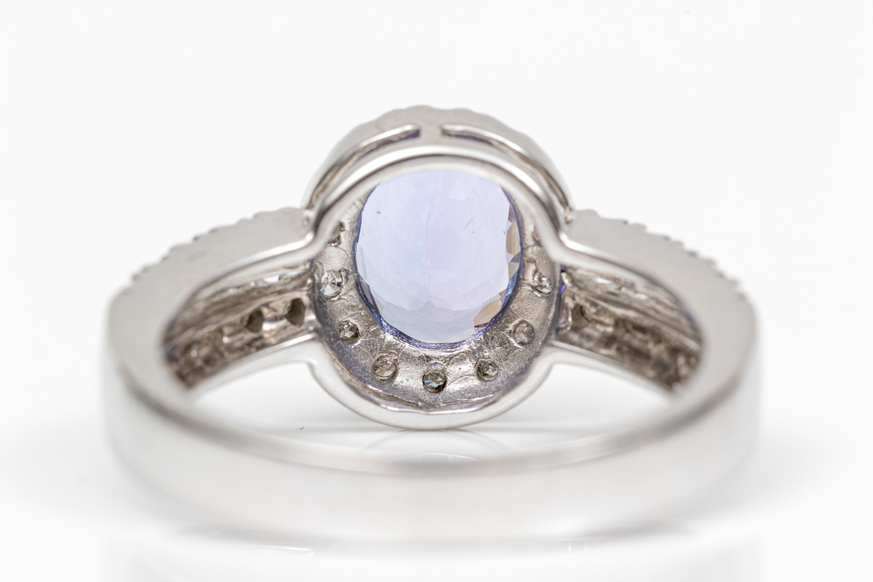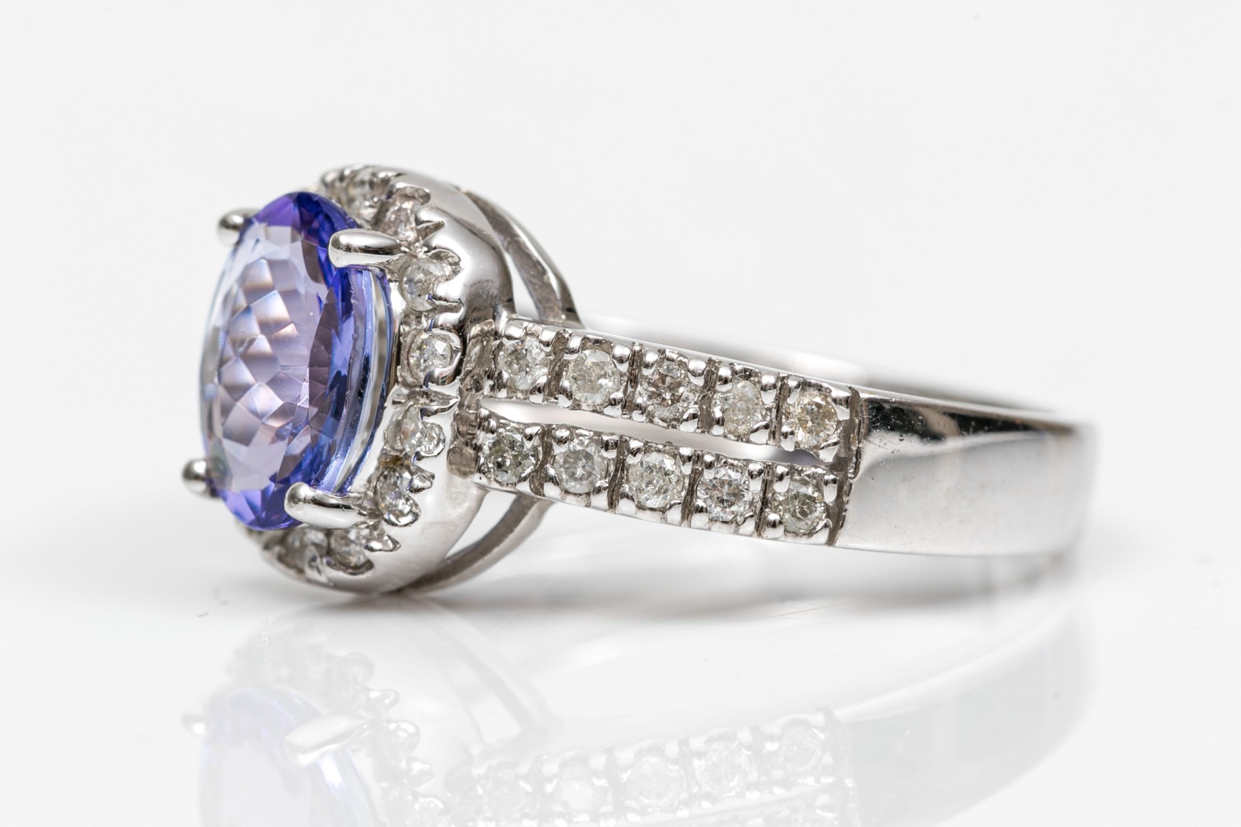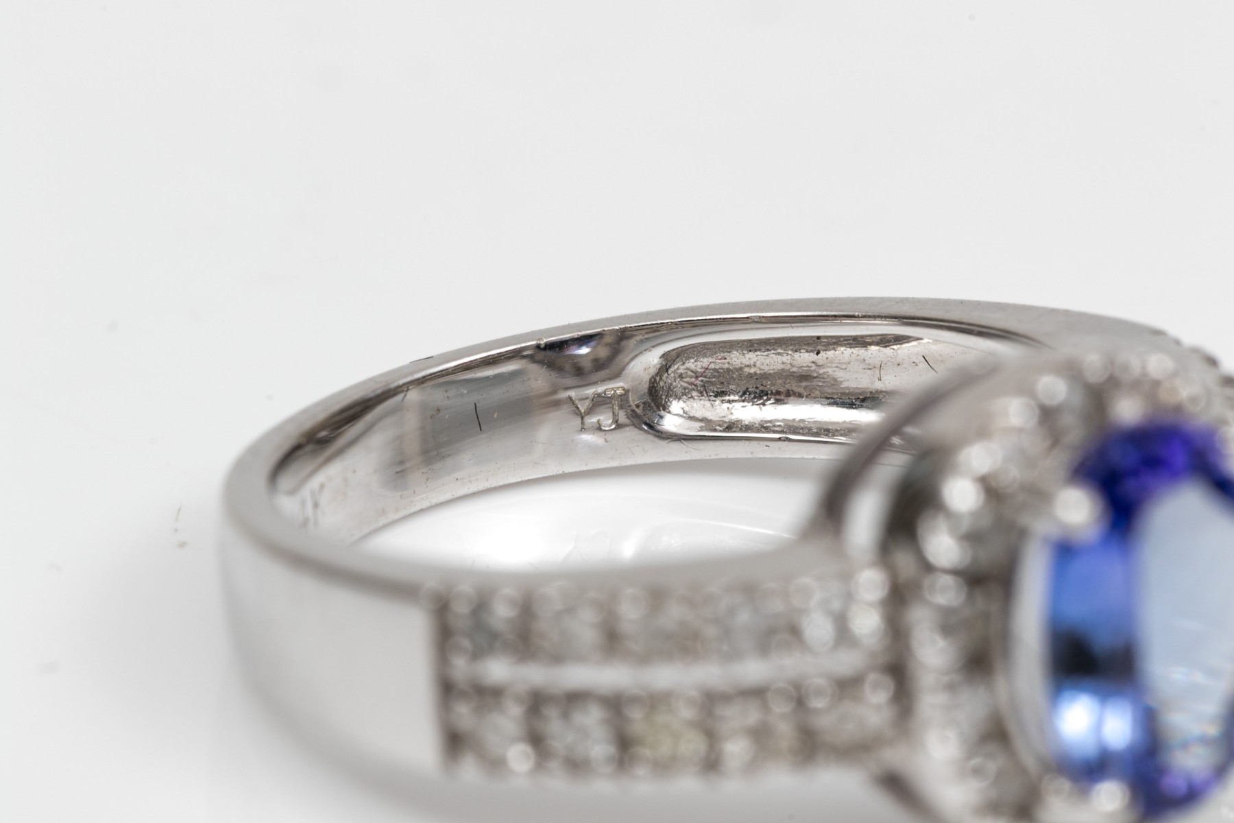 14k white gold lovely oval tanzanite and diamond halo ring, size 7, diamonds app. 0.34, tanzanite is app. 1.05 CTS, prong set