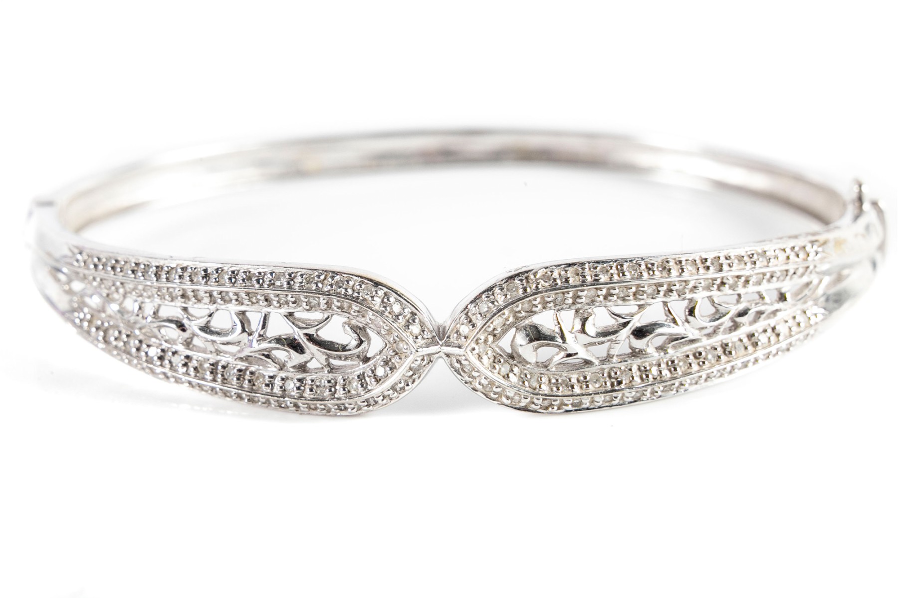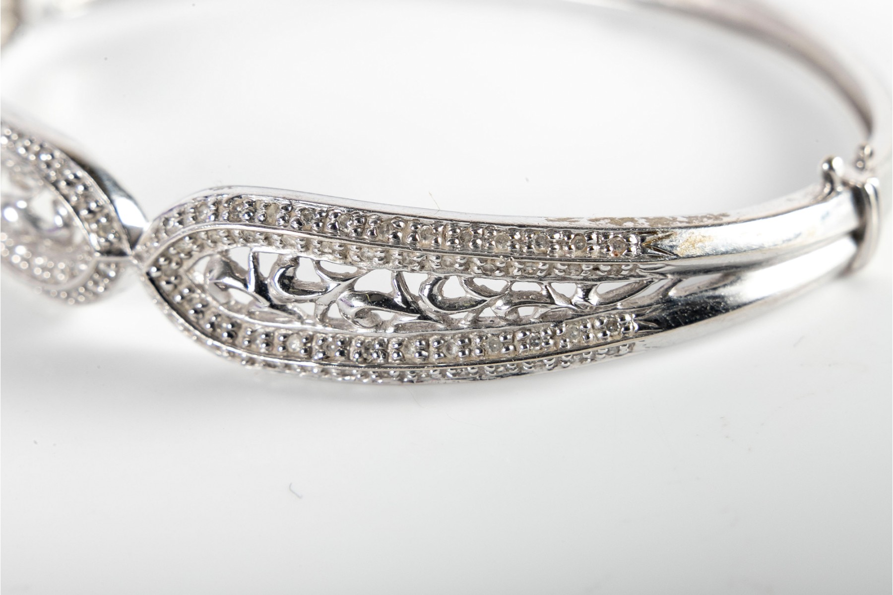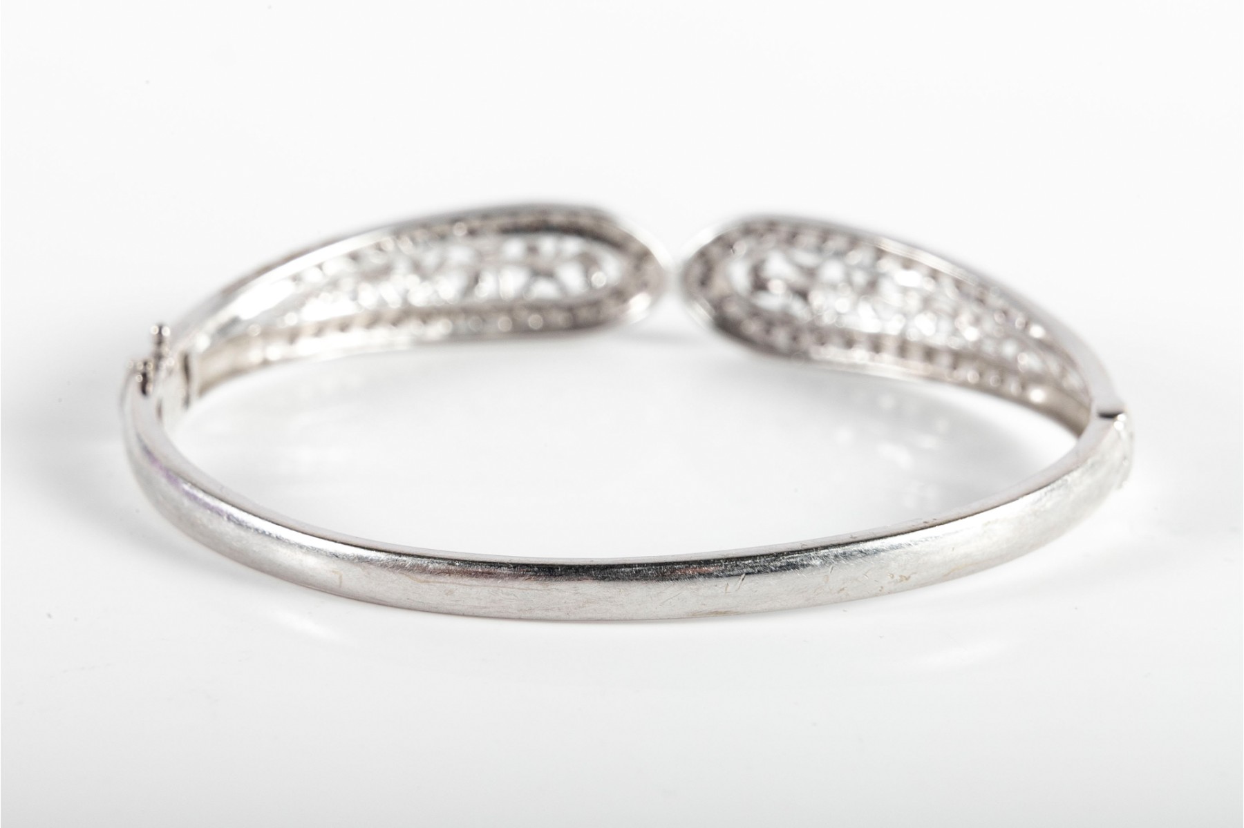 An elegant white gold cuff bracelet displaying two pear-shaped ends meeting at a tension center, sporting beveled channels of prong-set round moissanites around pierced centers of foliate scrolled vines.