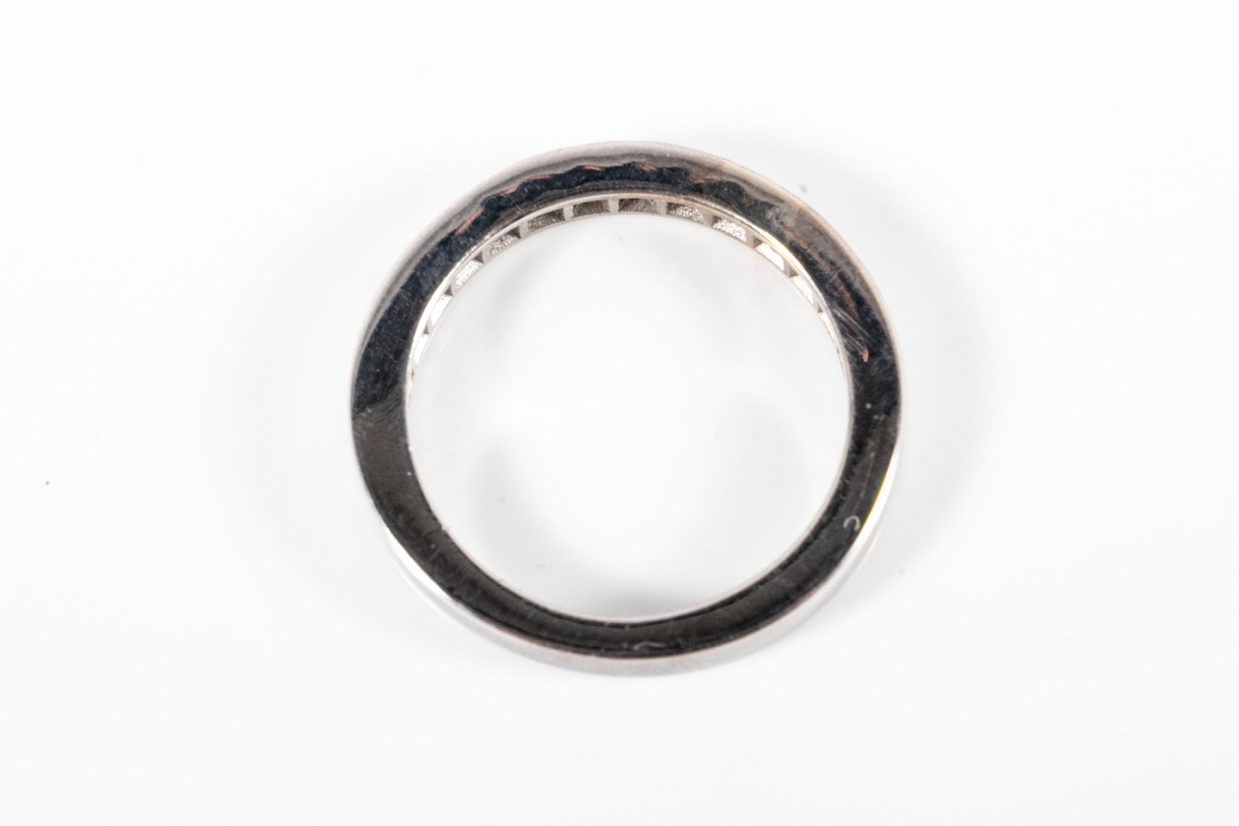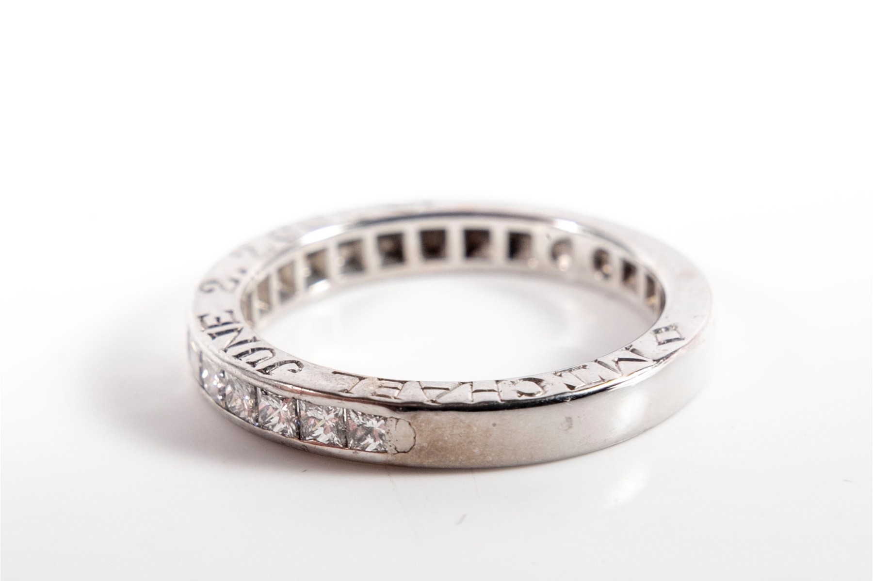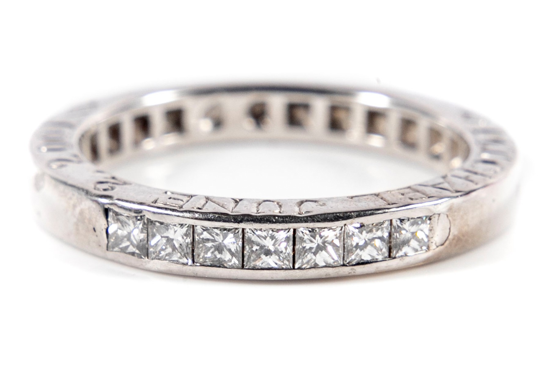 A simple white gold ring displaying a channel of princess cut moissanites.