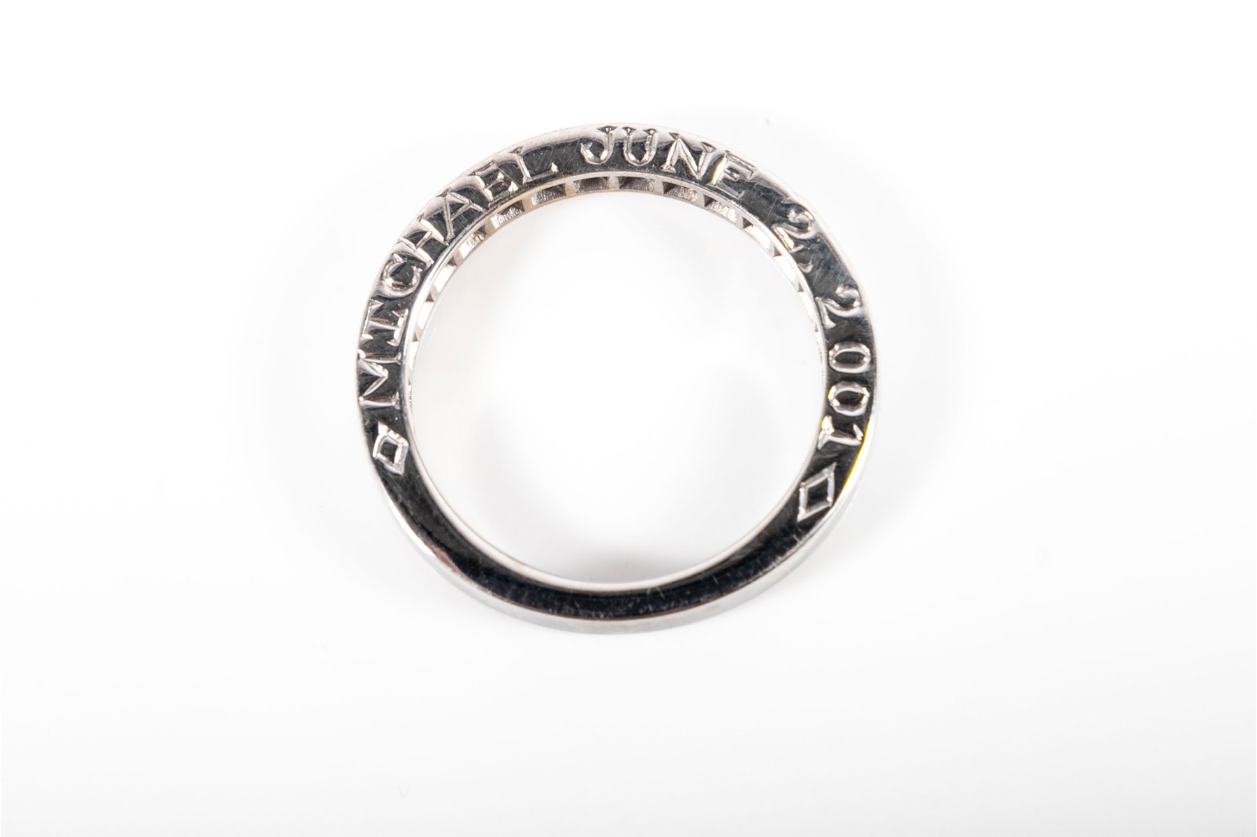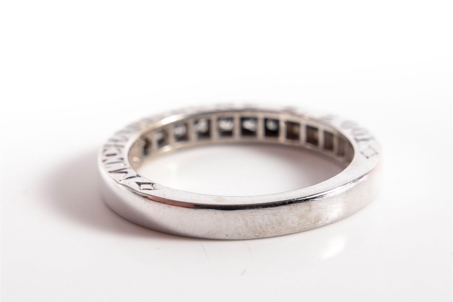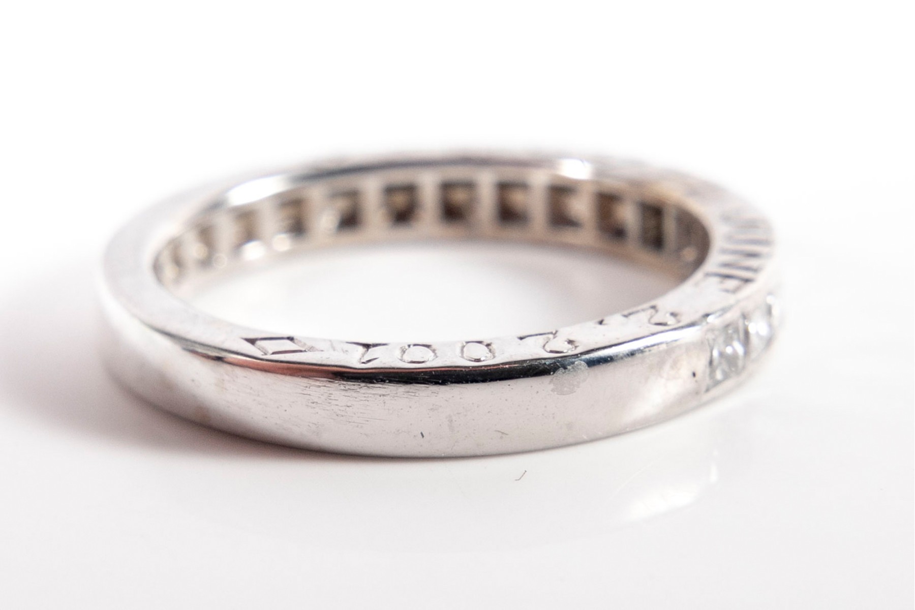 A simple white gold ring displaying a channel of princess cut moissanites.