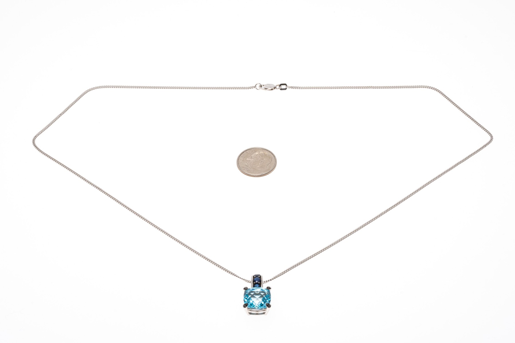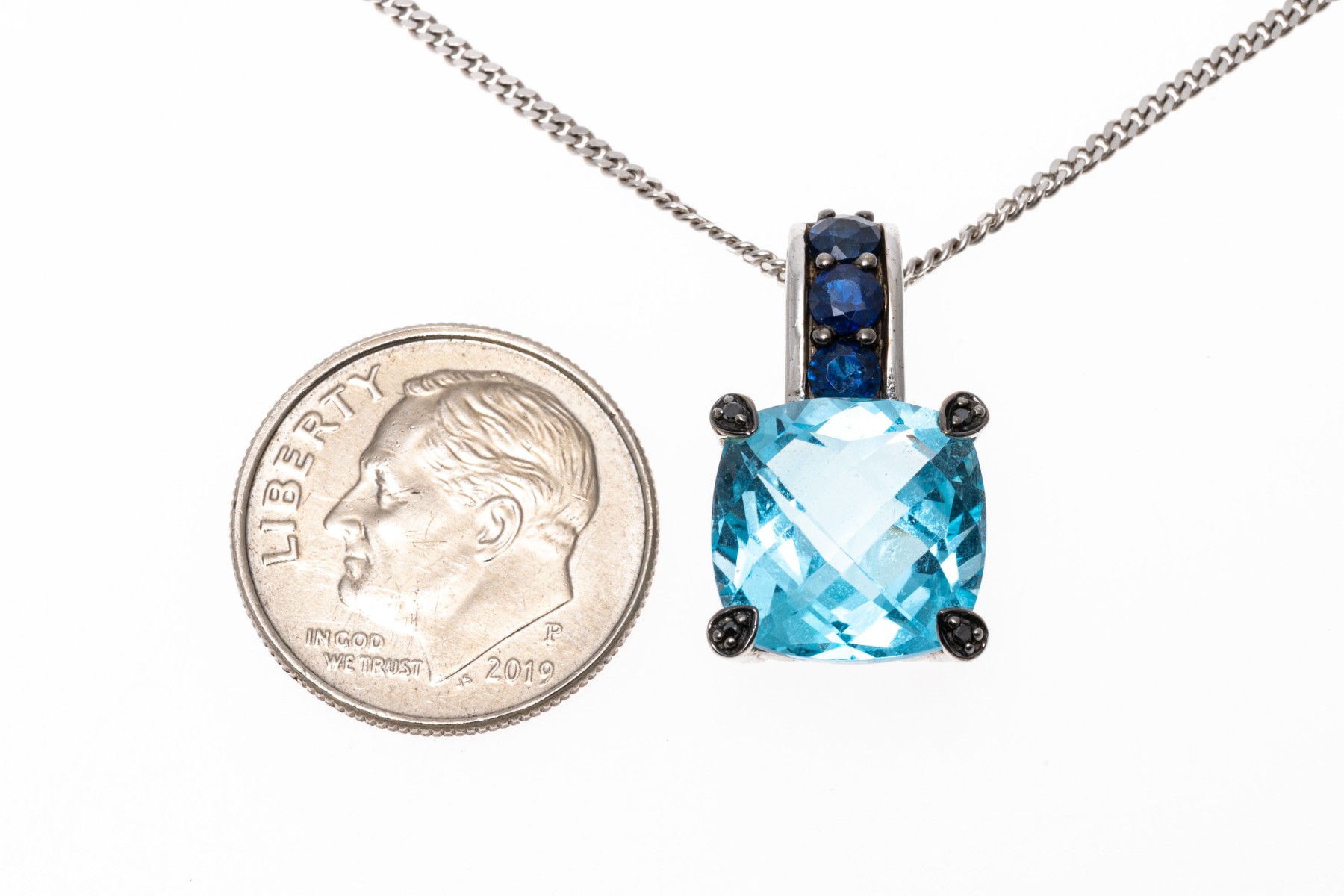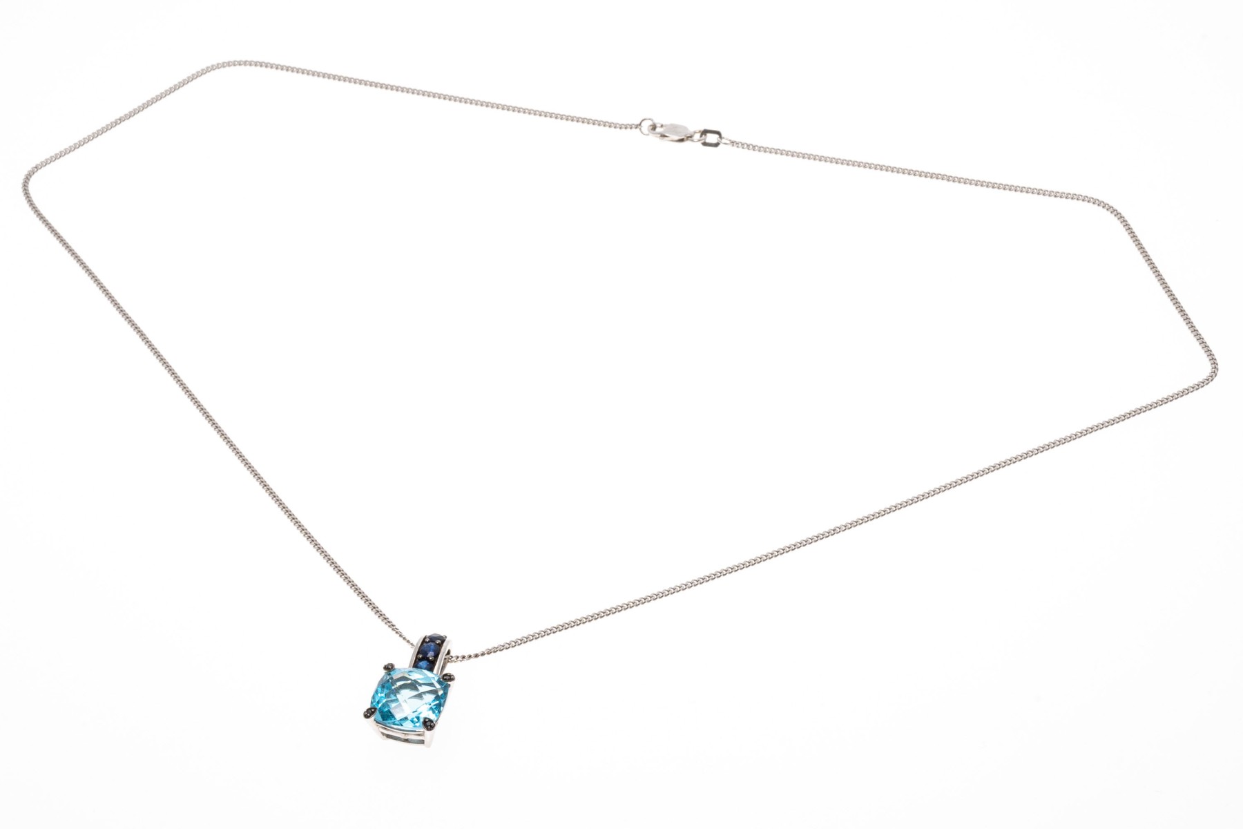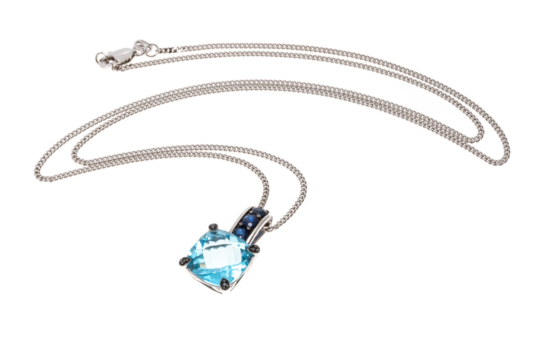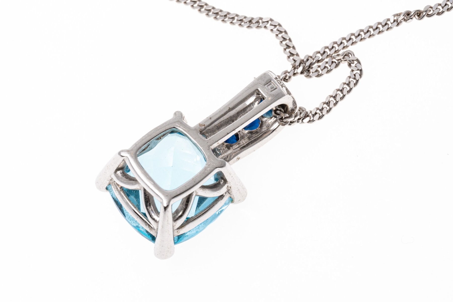 A 14K white gold Italian chain supports a bright contemporary pendant. The pendant is crafted from 10K white gold and features a cushion cut blue topaz within a frame of round cut sapphires that extend to the prong settings. The topaz is approximately 5.2 cts., and the sapphires are approximately 0.36 TCW. The chain secures with a lobster claw style clasp.