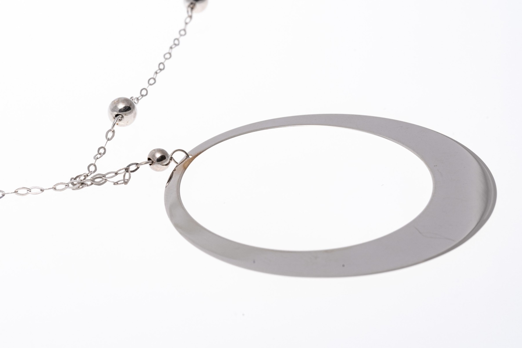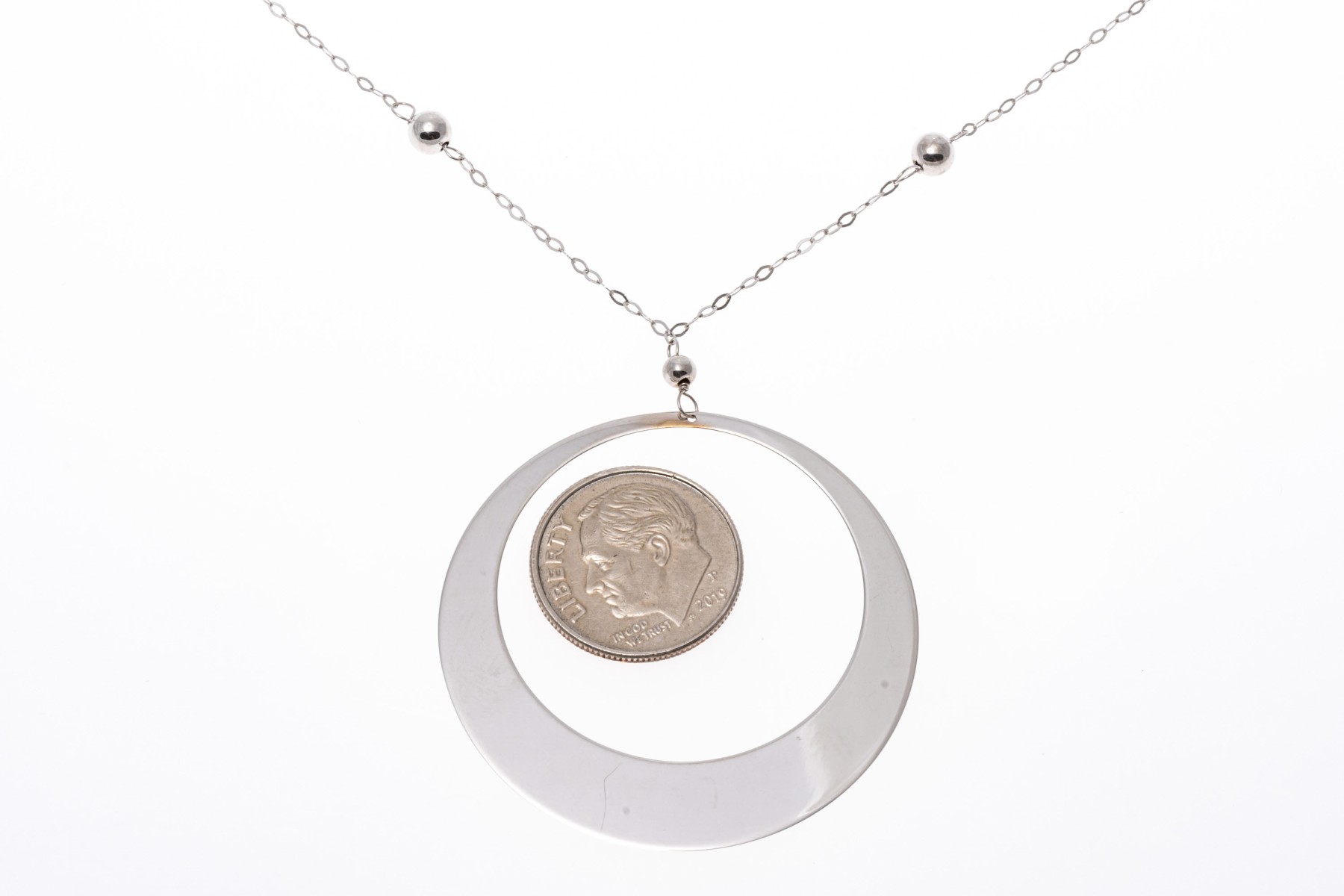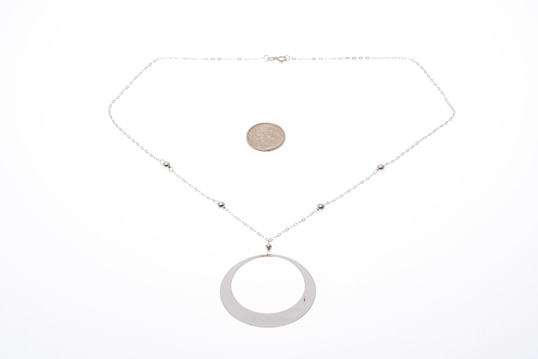 This chain necklace has been created from 14K white gold. Set along the chain are polished beads leading to a centered disk pendant. The pendant has an open design with a striking high polished finish. Spring ring clasp.