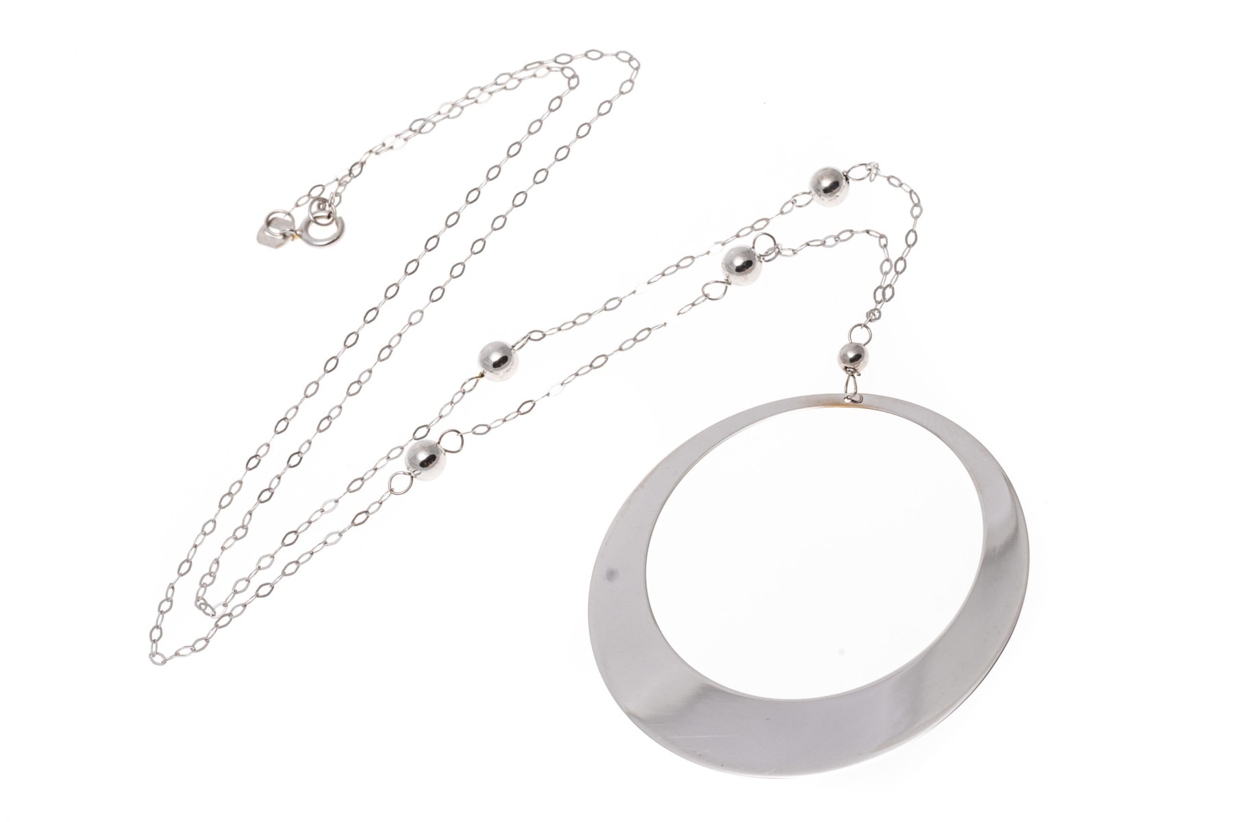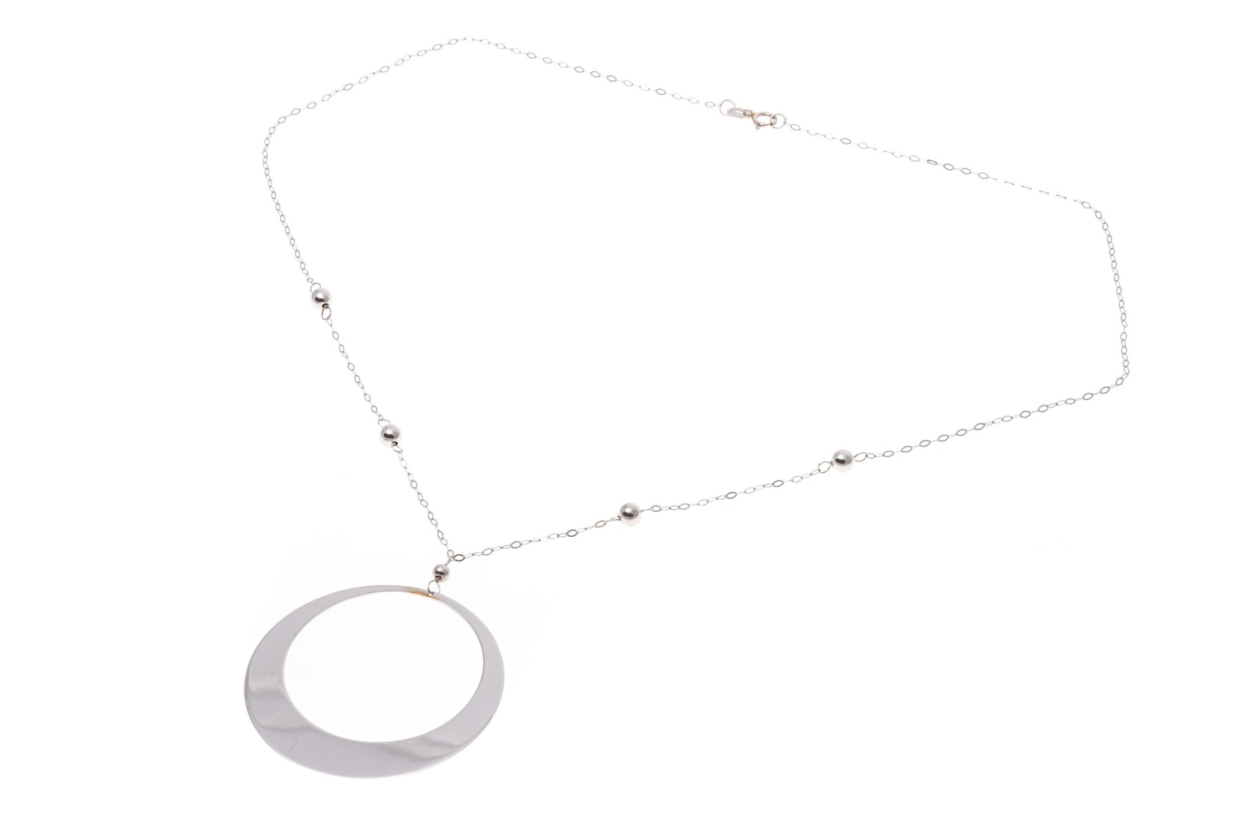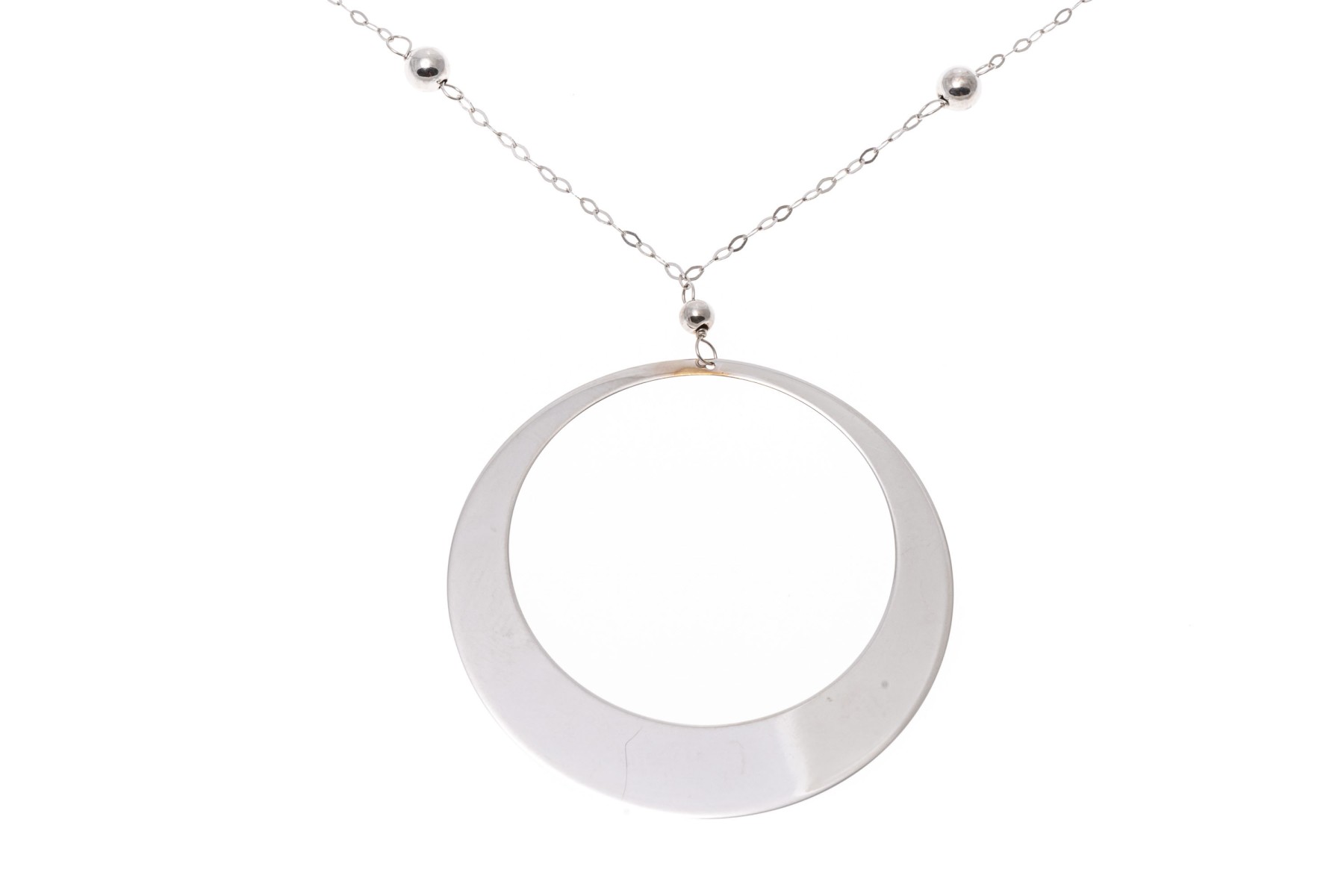 This chain necklace has been created from 14K white gold. Set along the chain are polished beads leading to a centered disk pendant. The pendant has an open design with a striking high polished finish. Spring ring clasp.