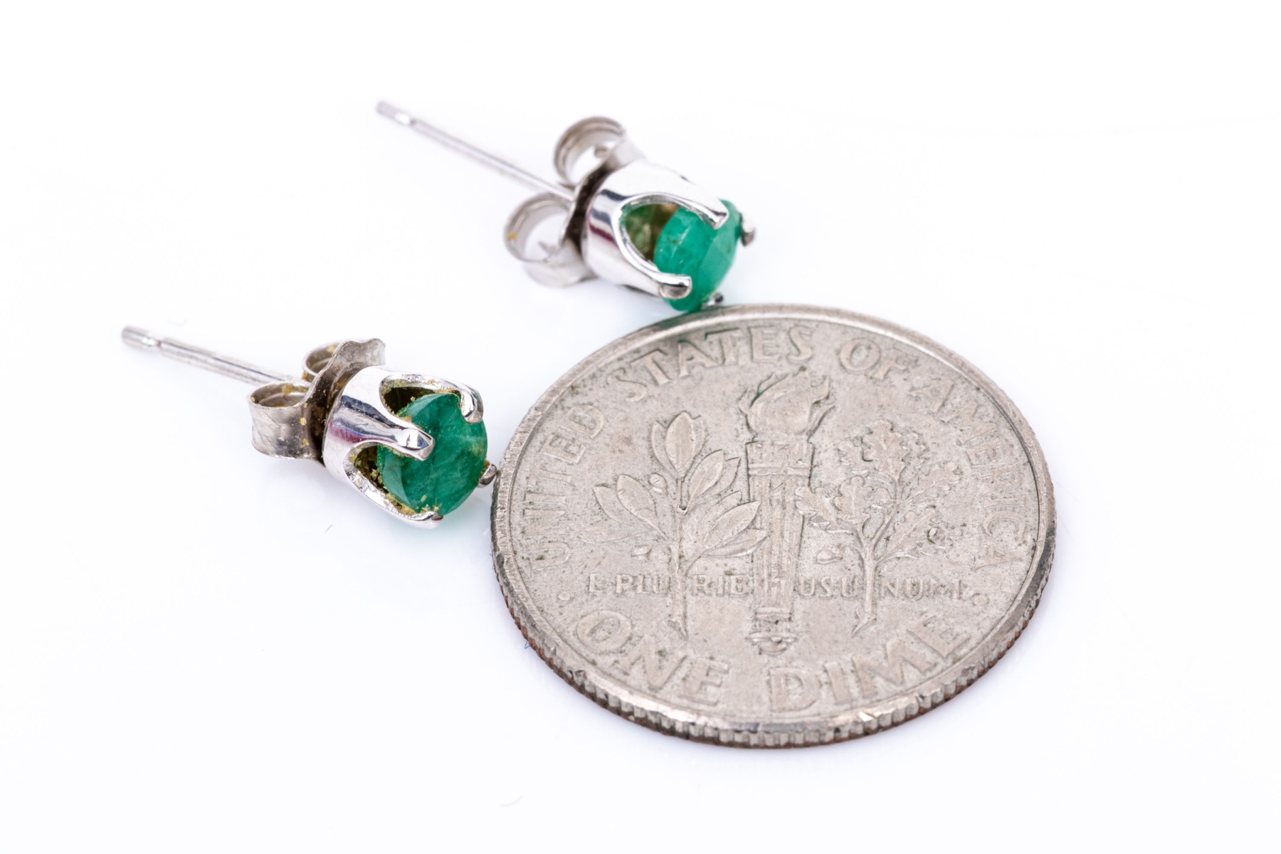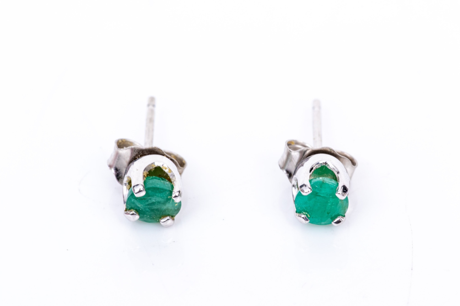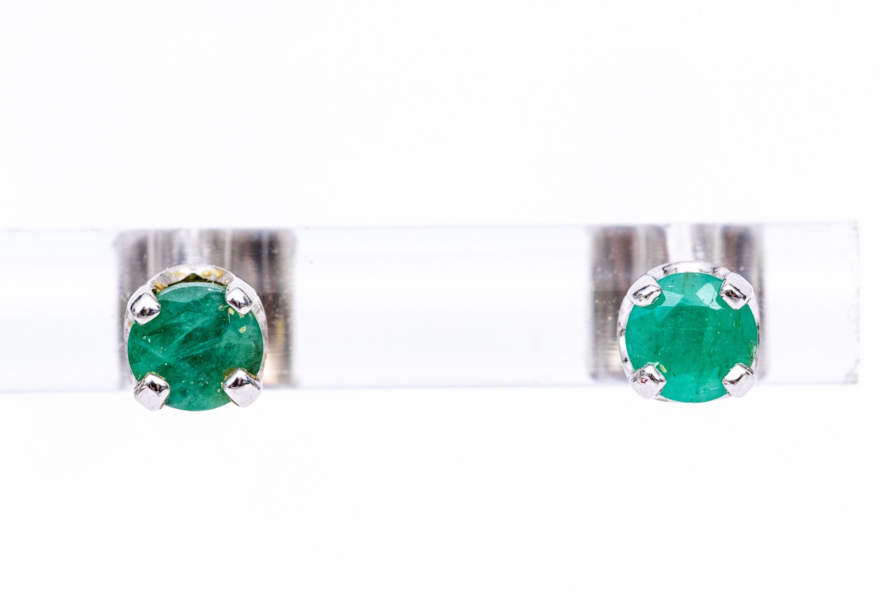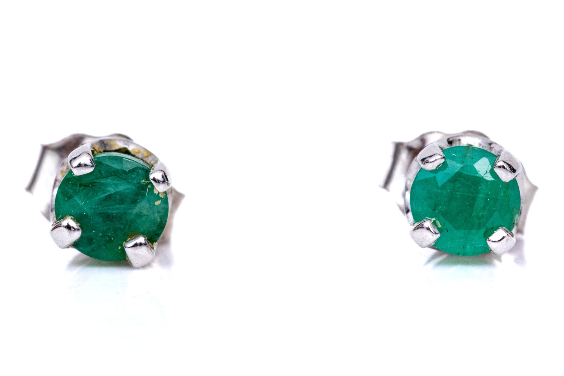 14k white gold opaque round emerald stud earrings, app. 0.36 TCW. These simple earrings are an opaque style green emerald, round faceted, and set in four prong set, basket style mountings and finished with posts and clutch style backs.