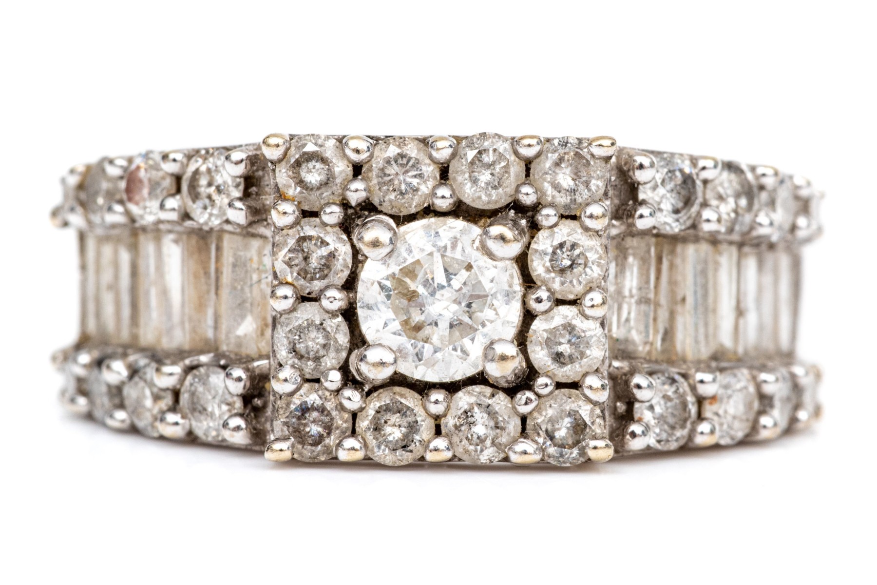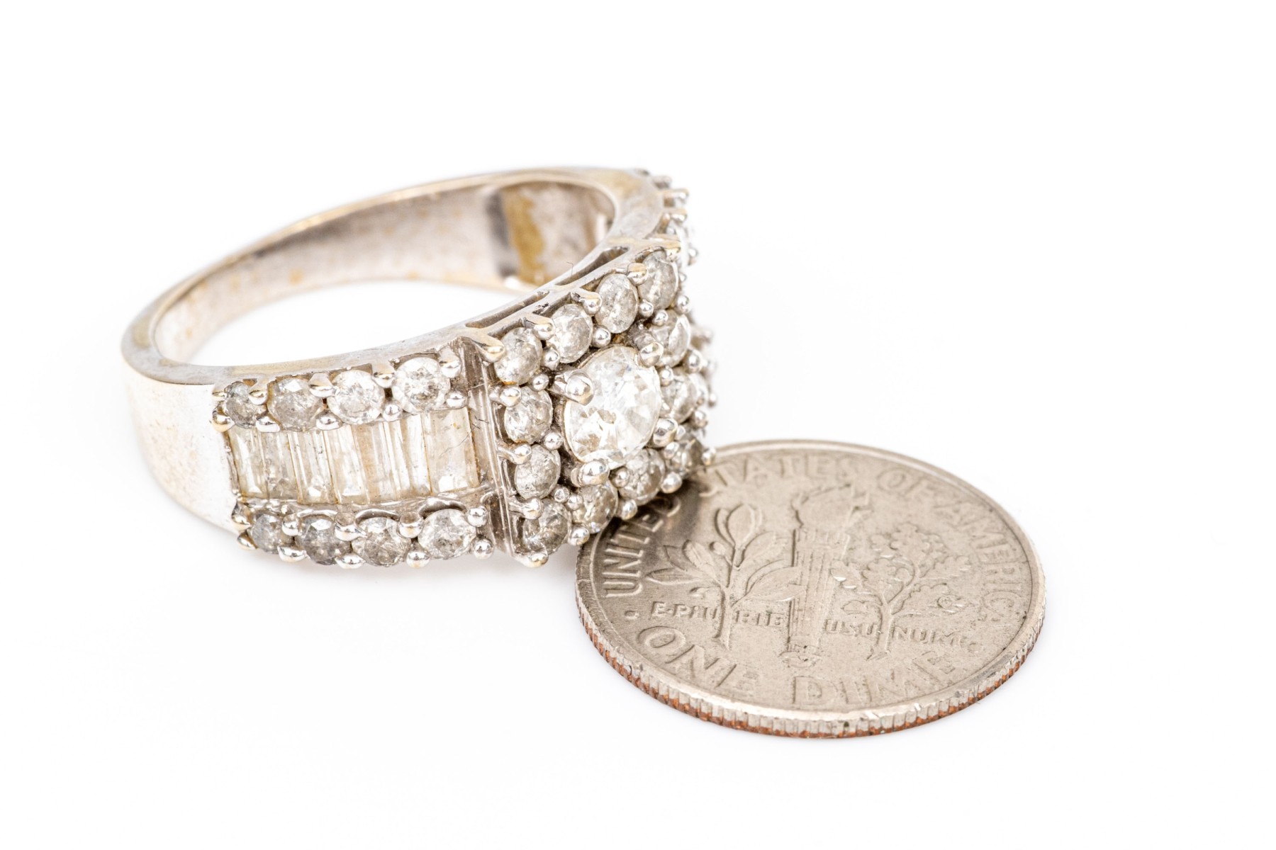 14k white gold ornate round and baguette diamond cluster ring, app. 1.78 TCW, size 7.75