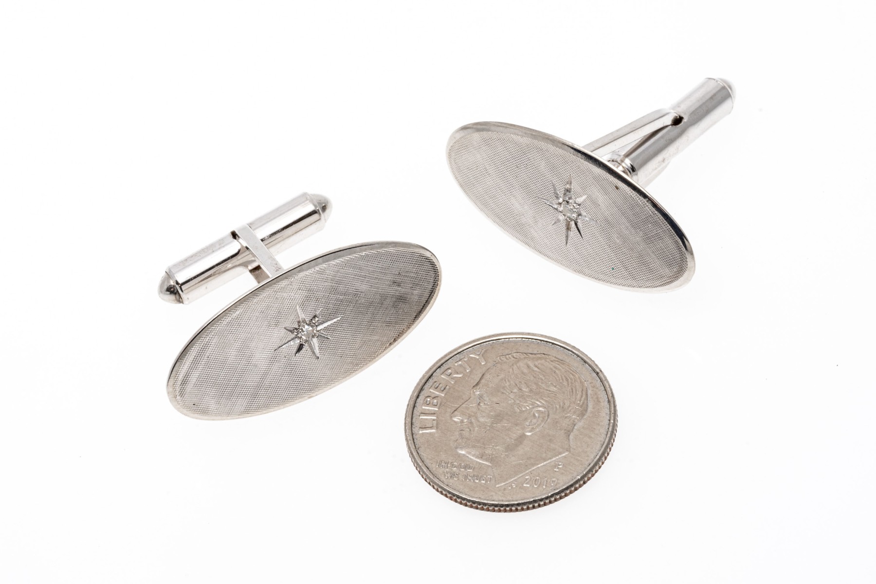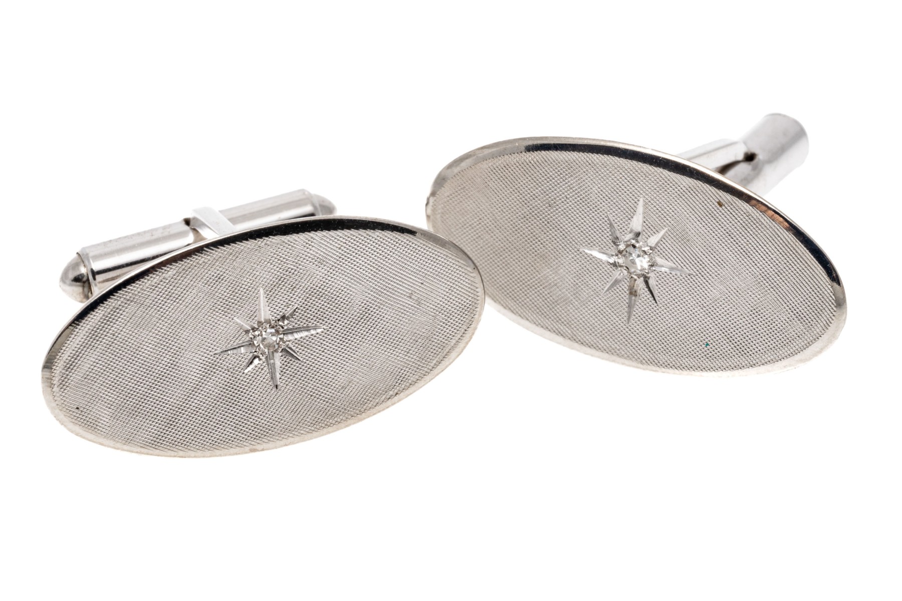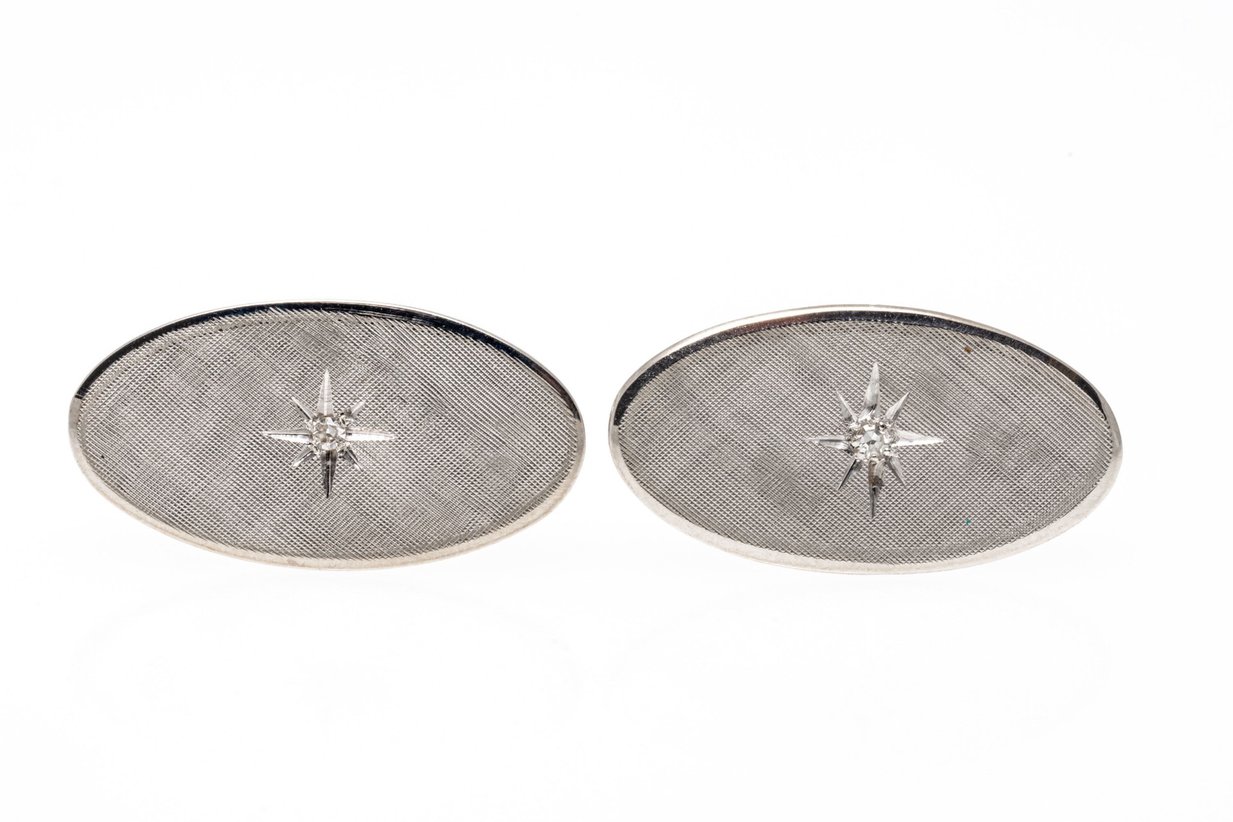 14k white gold oval florentined diamond center cufflinks, app. 0.04 TCW, lever style backs
