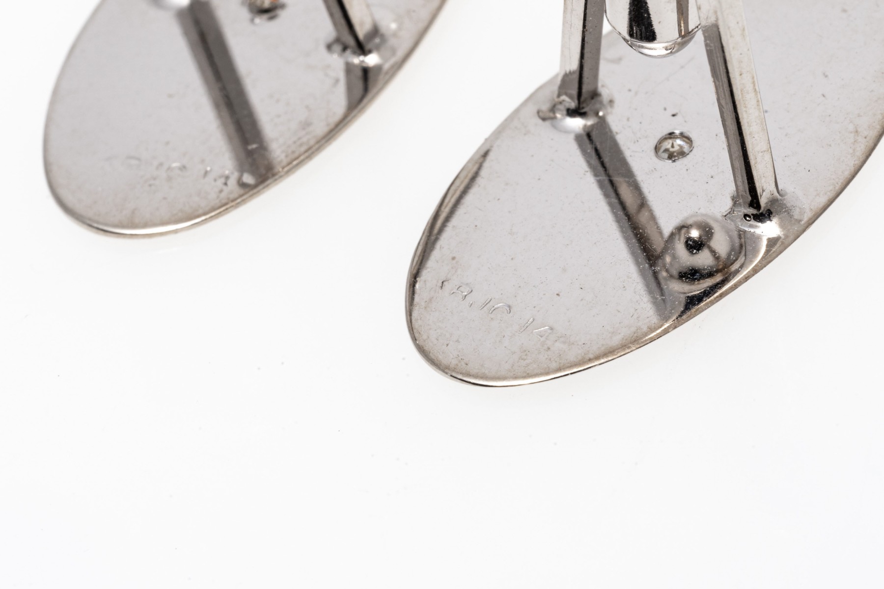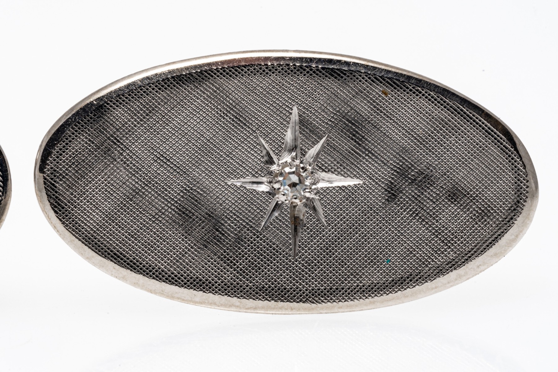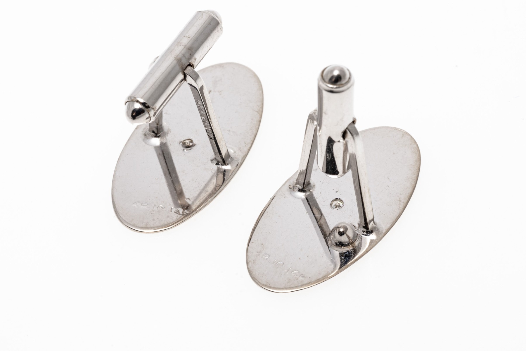 14k white gold oval florentined diamond center cufflinks, app. 0.04 TCW, lever style backs