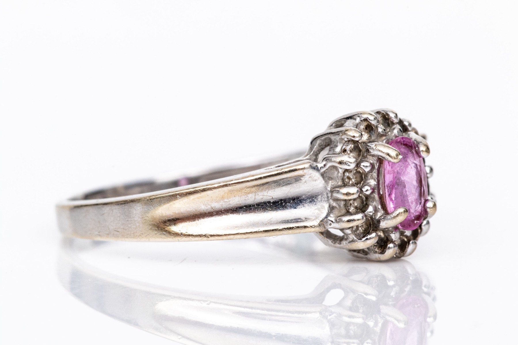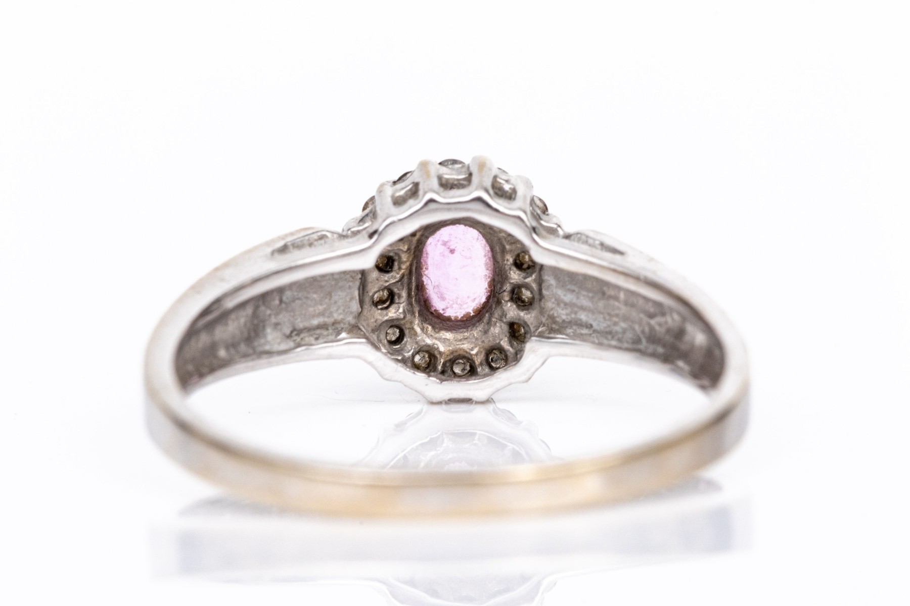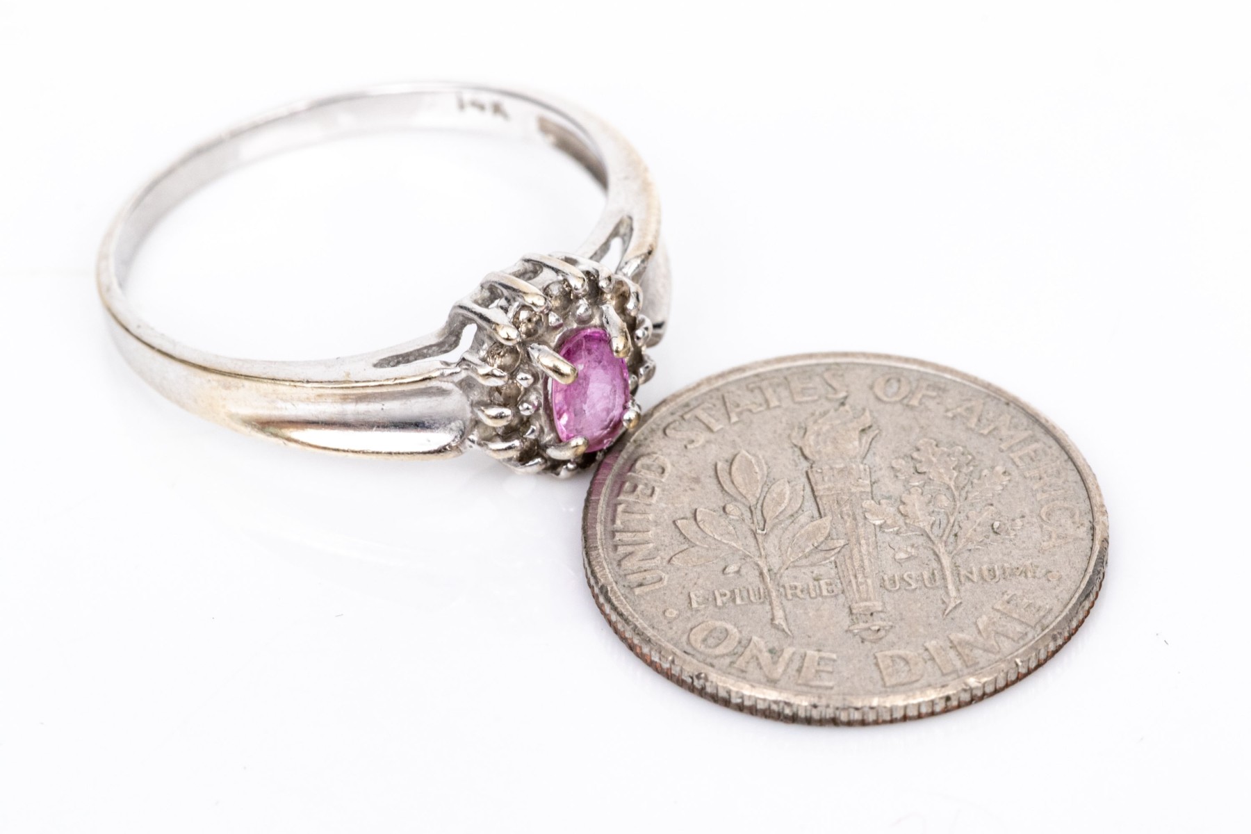 14k white gold oval pink topaz and diamond halo ring, app. 0.07 TCW, size 6.75. This pretty ring features high polished, concave form shoulders