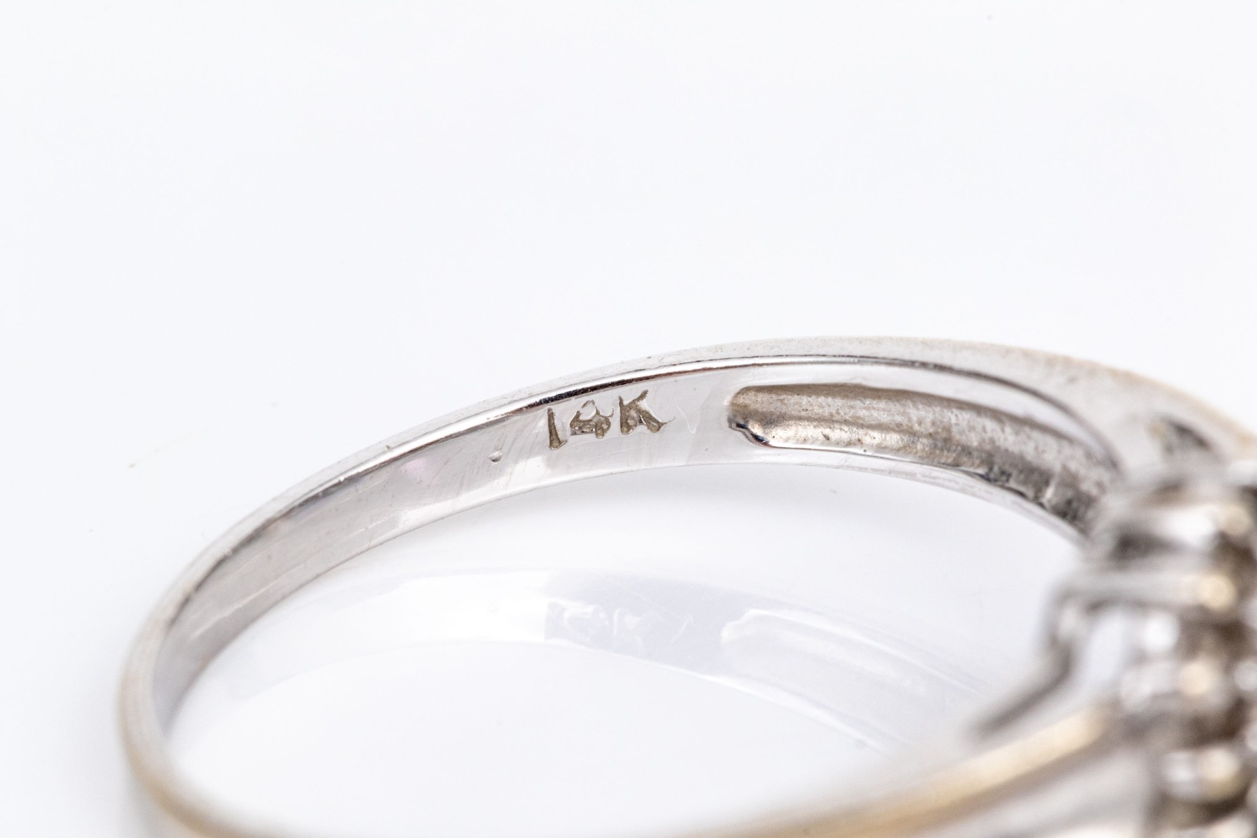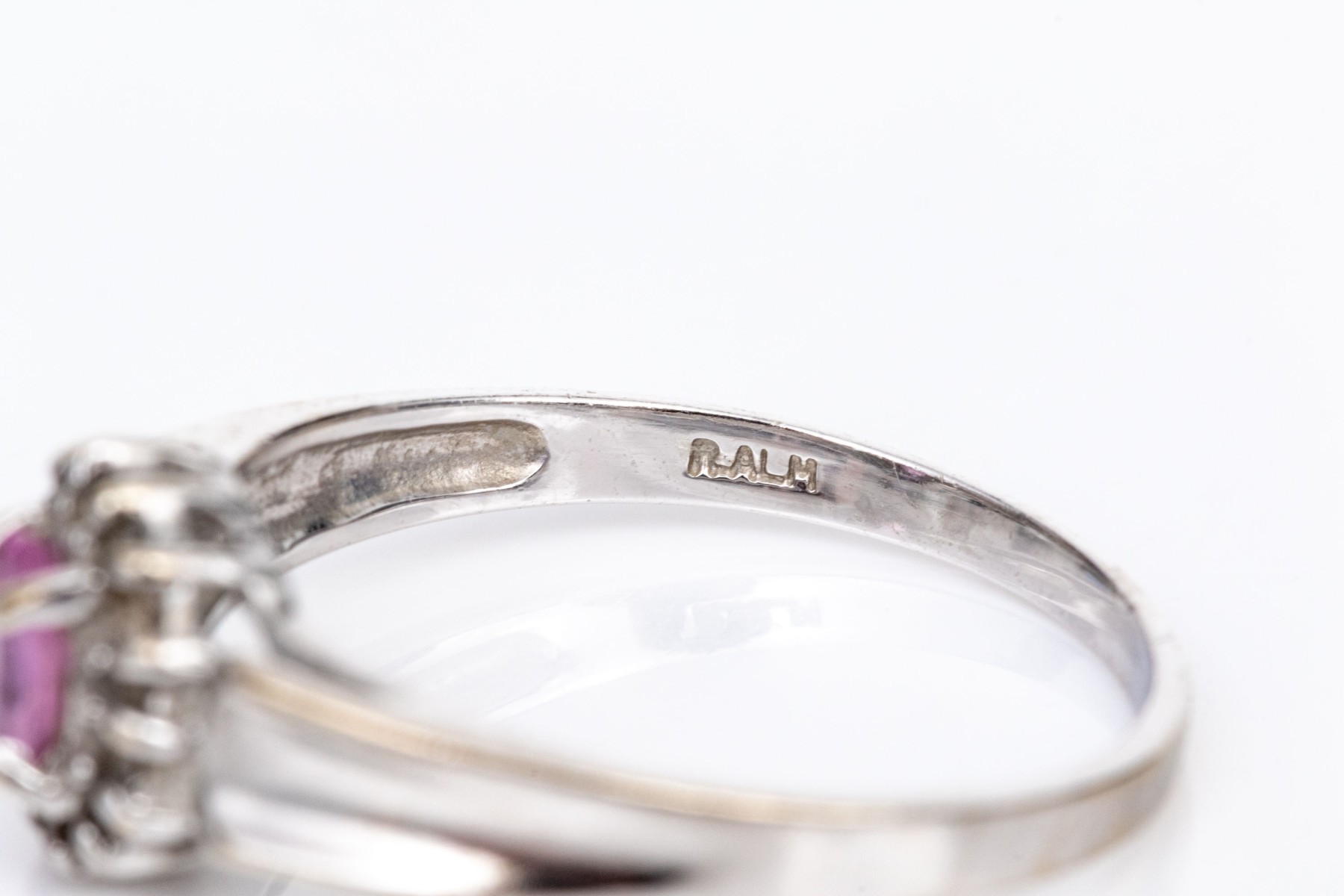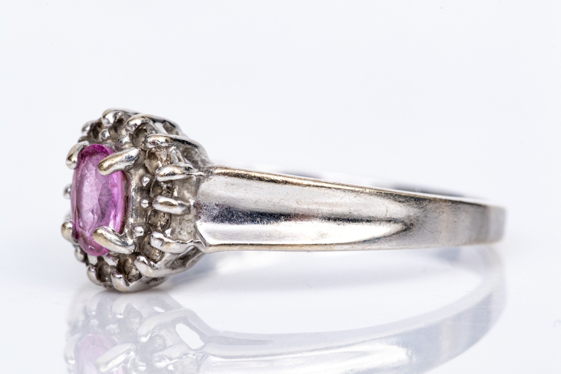 14k white gold oval pink topaz and diamond halo ring, app. 0.07 TCW, size 6.75. This pretty ring features high polished, concave form shoulders