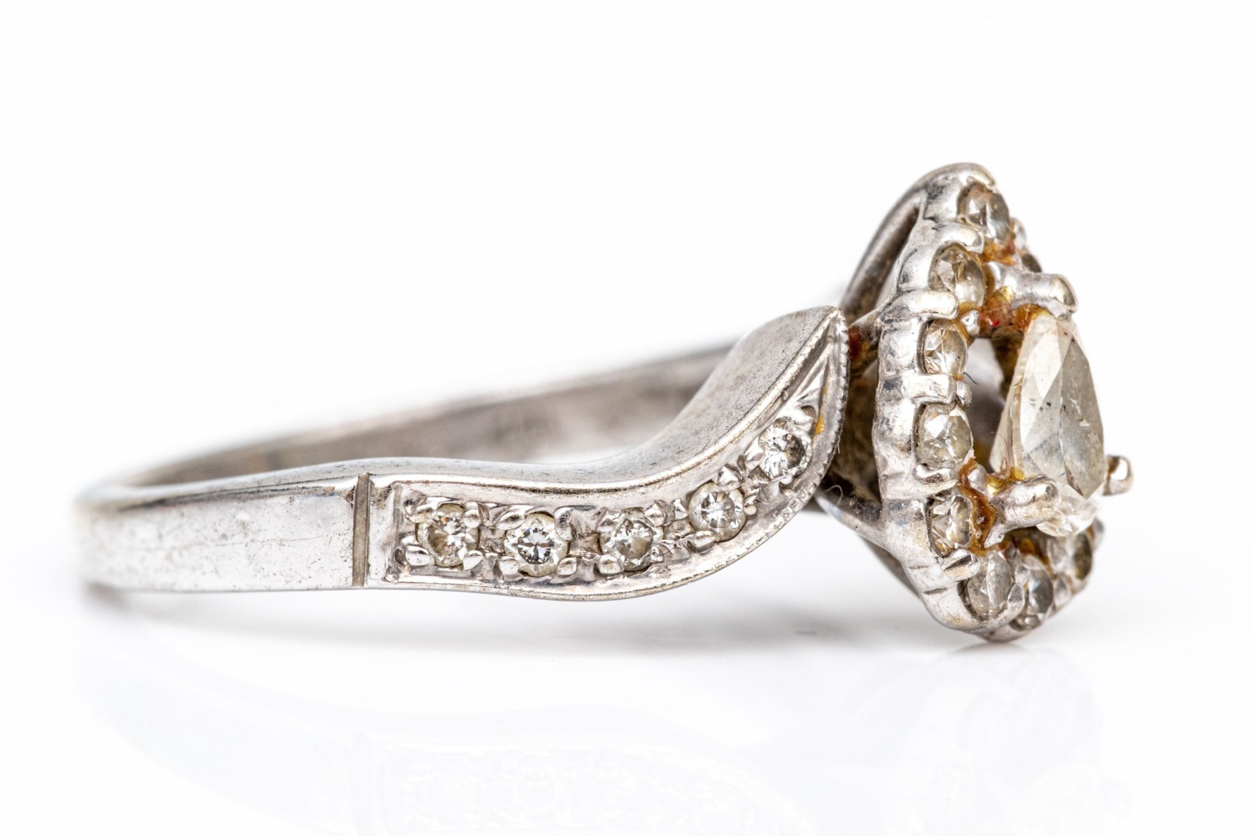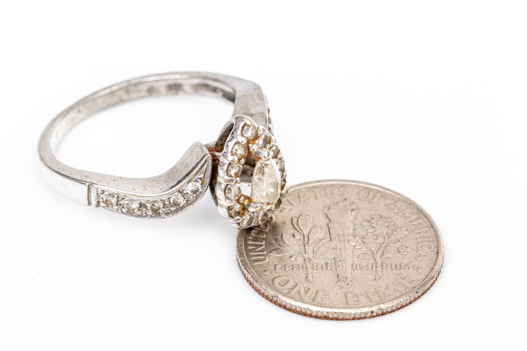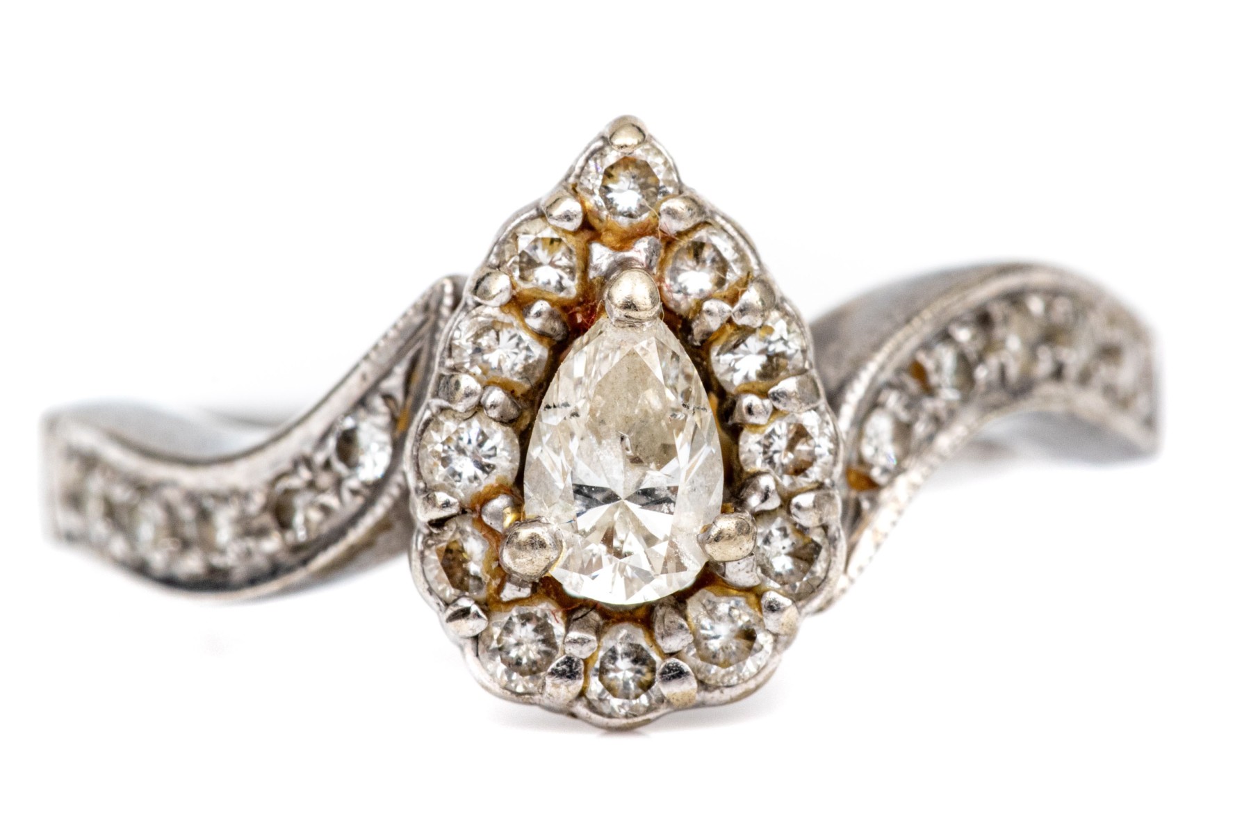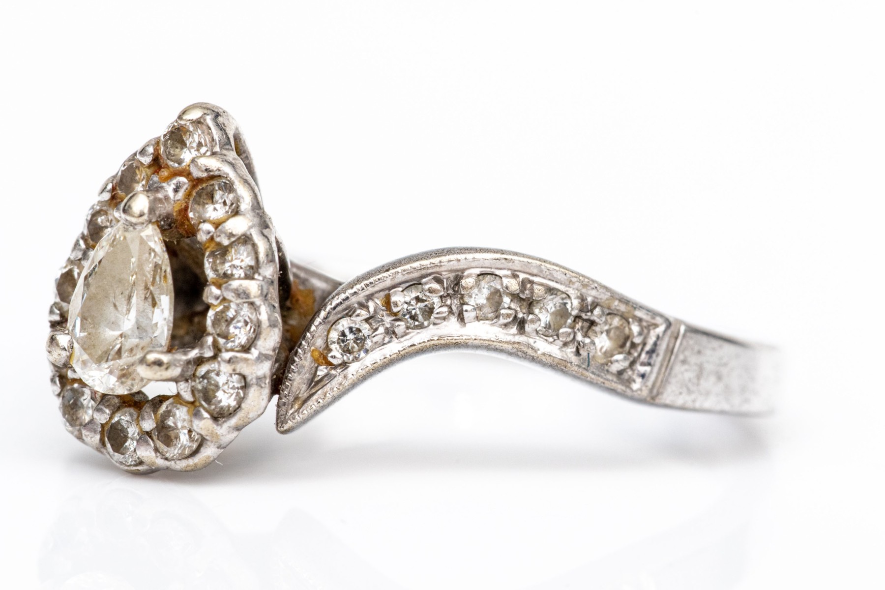 14k white gold pear diamond, app. 0.16 CTS, and white sapphire set ring, size 6
