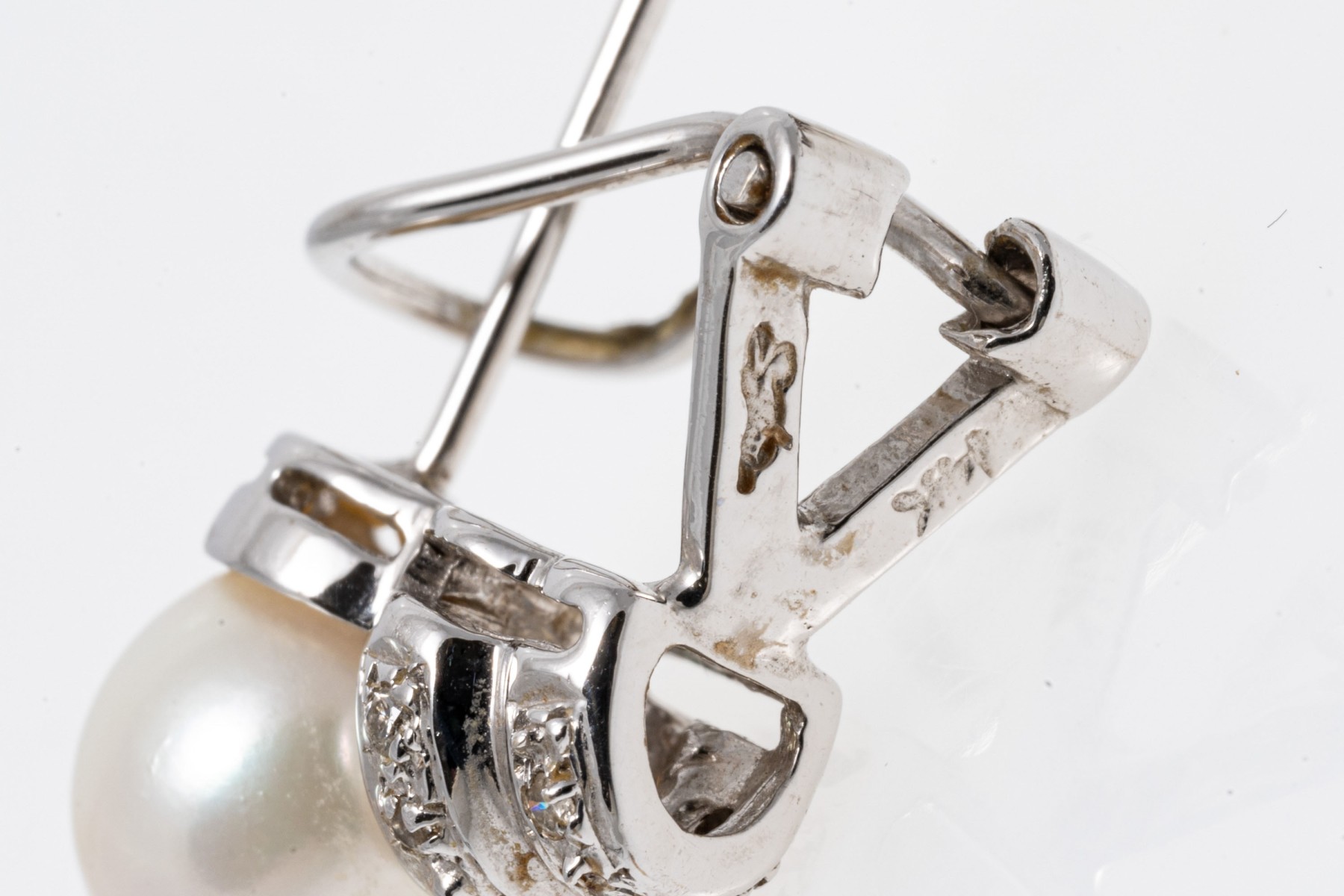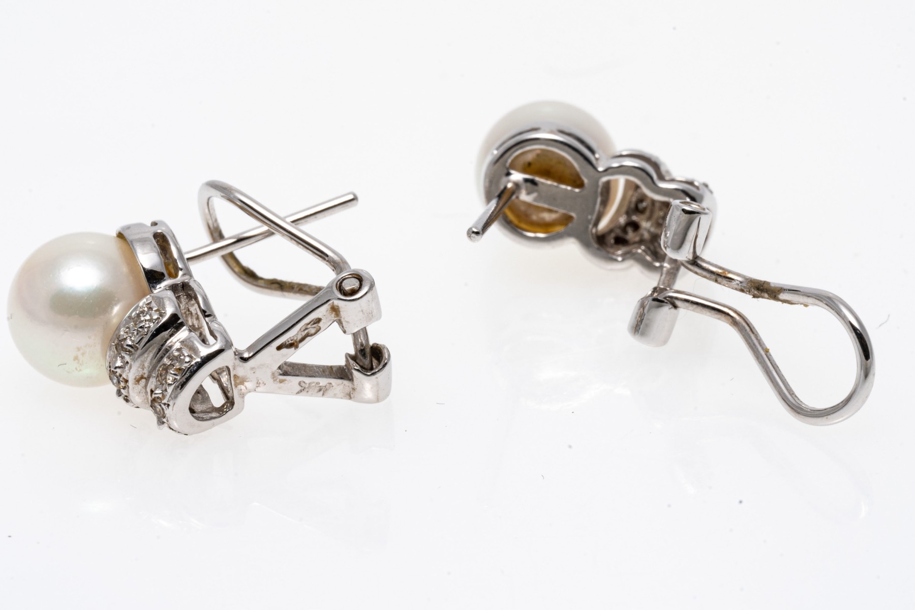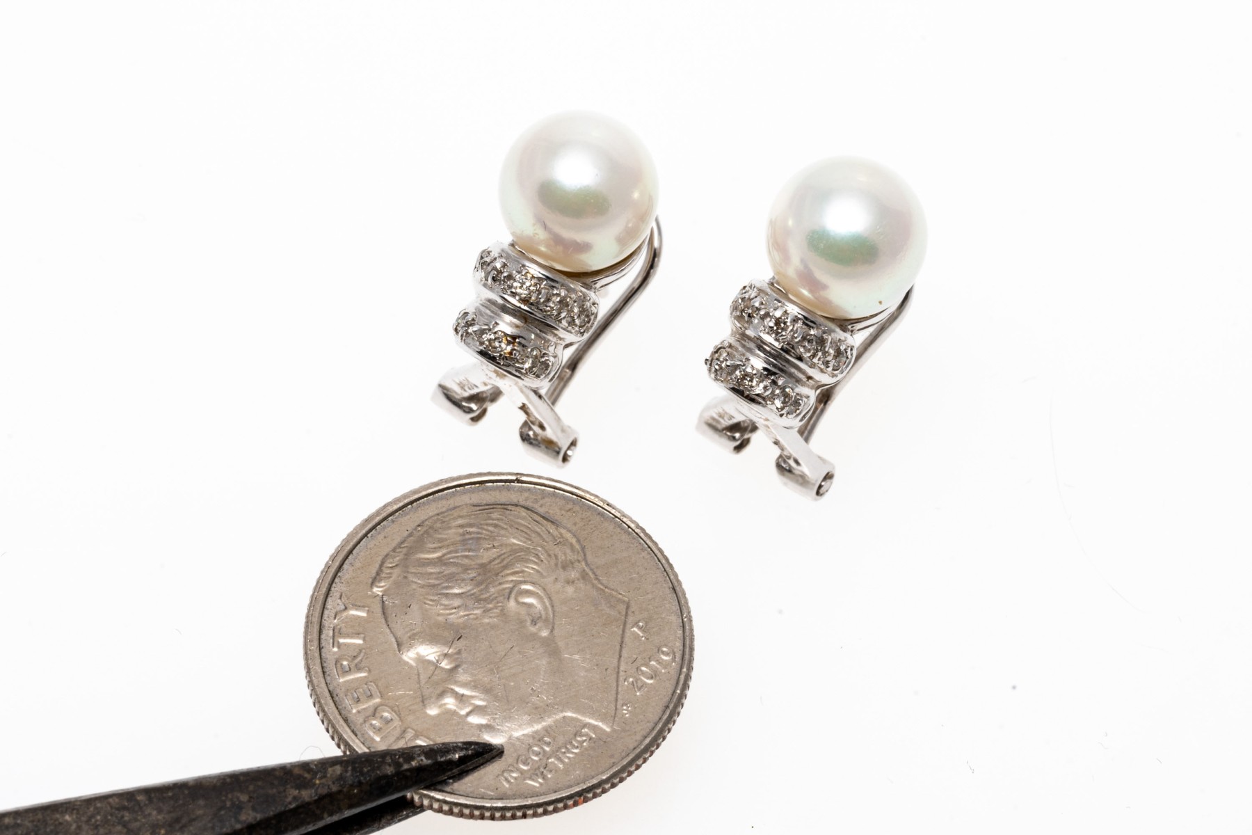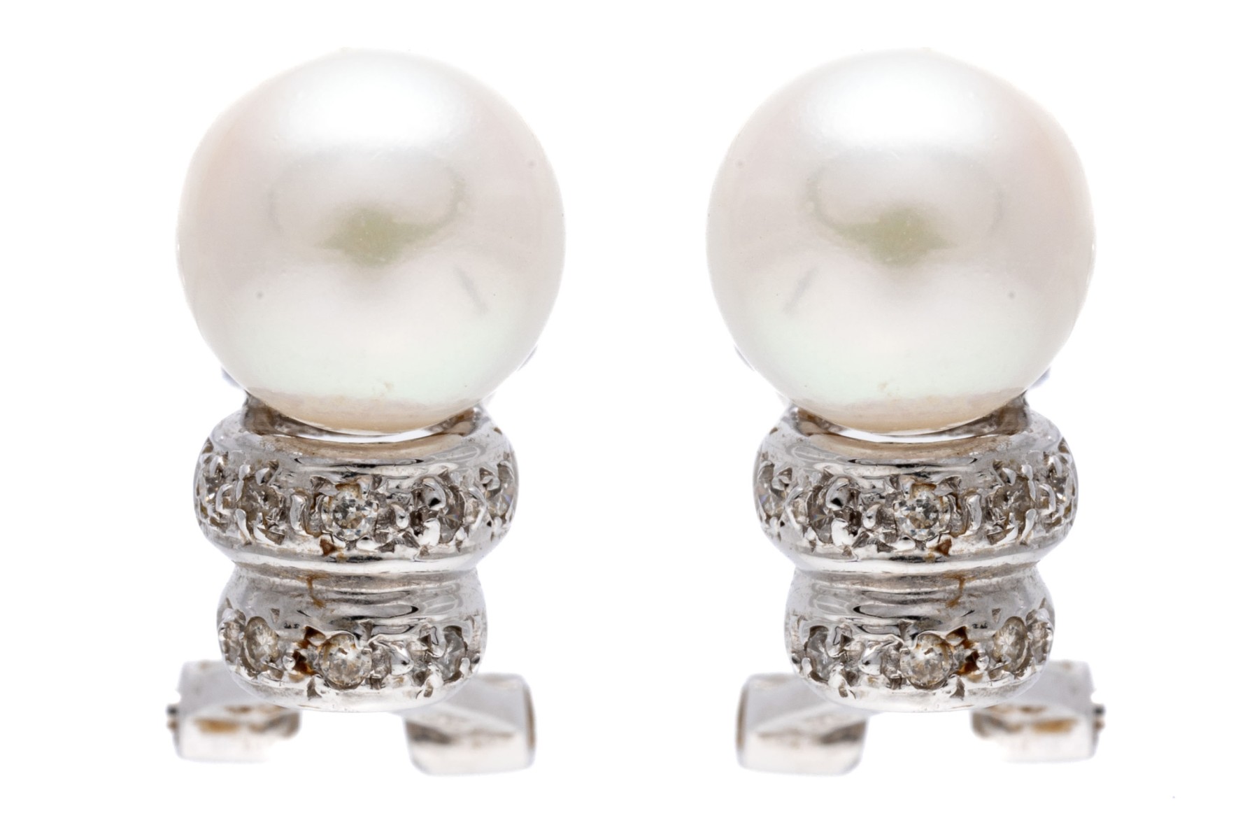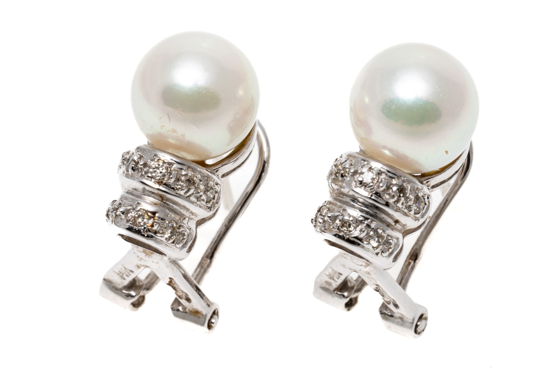 14k white gold pretty 7.5 mm cultured pearl and ribbed diamond set earrings, approximately 0.08 TCW. The earrings are finished with posts and omega style backs