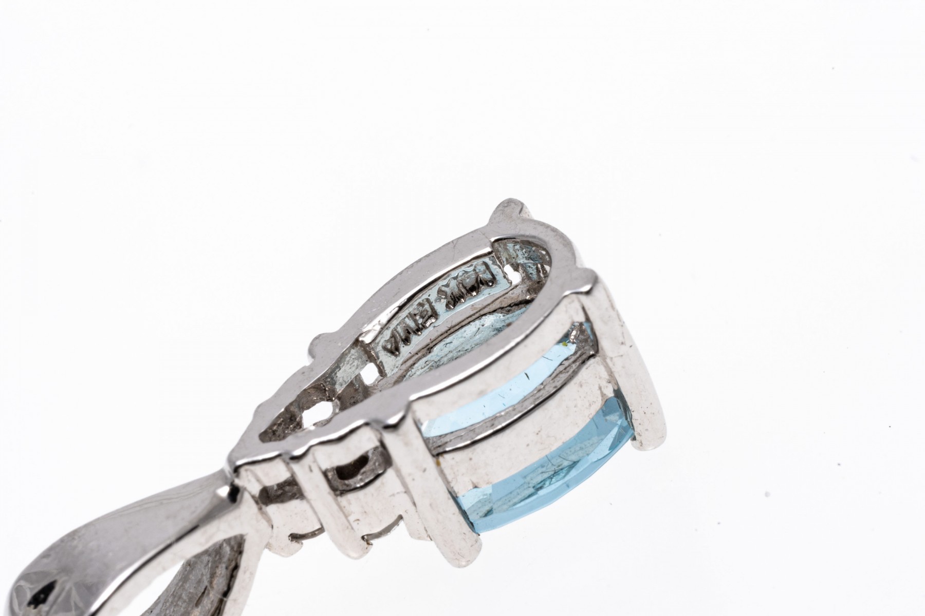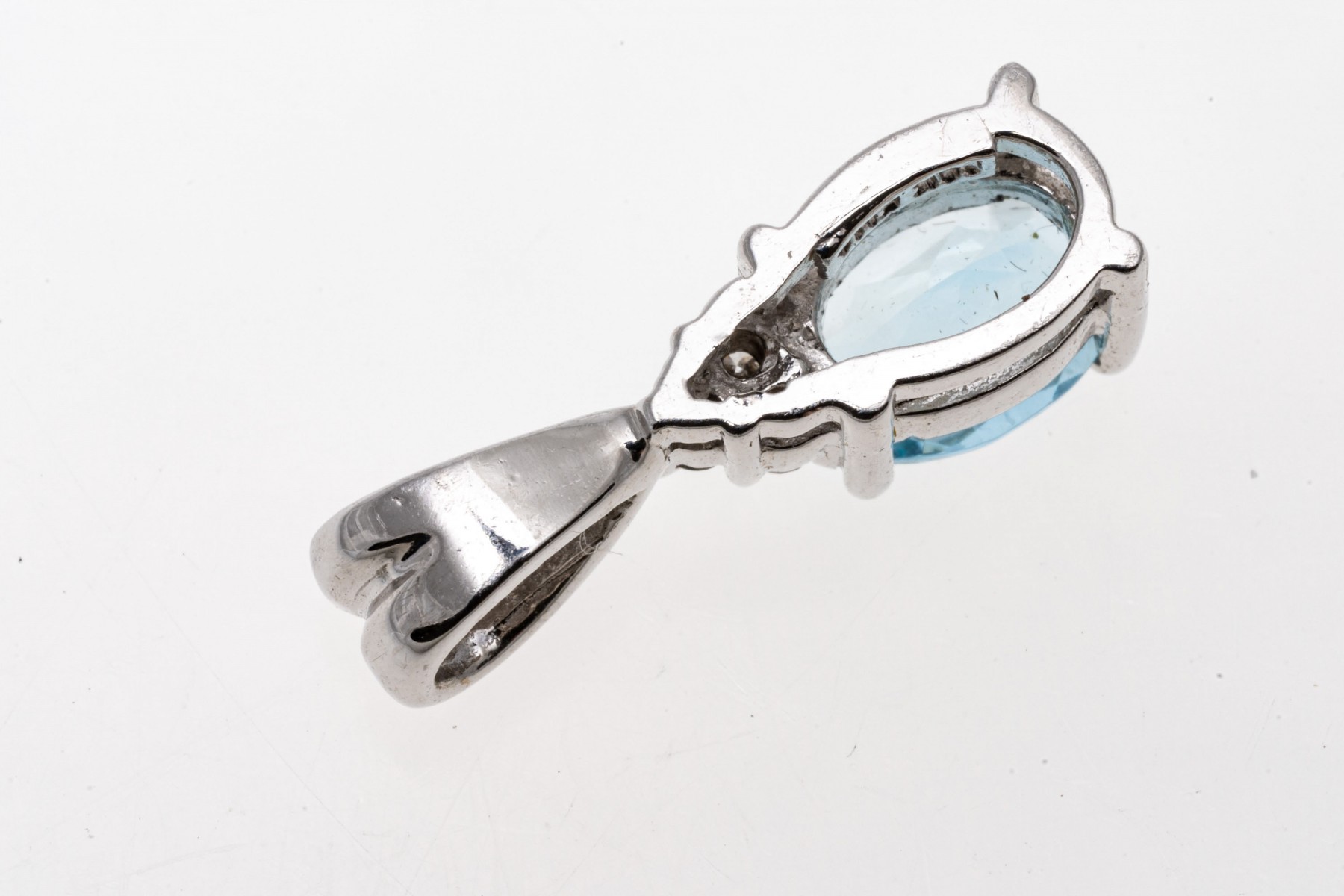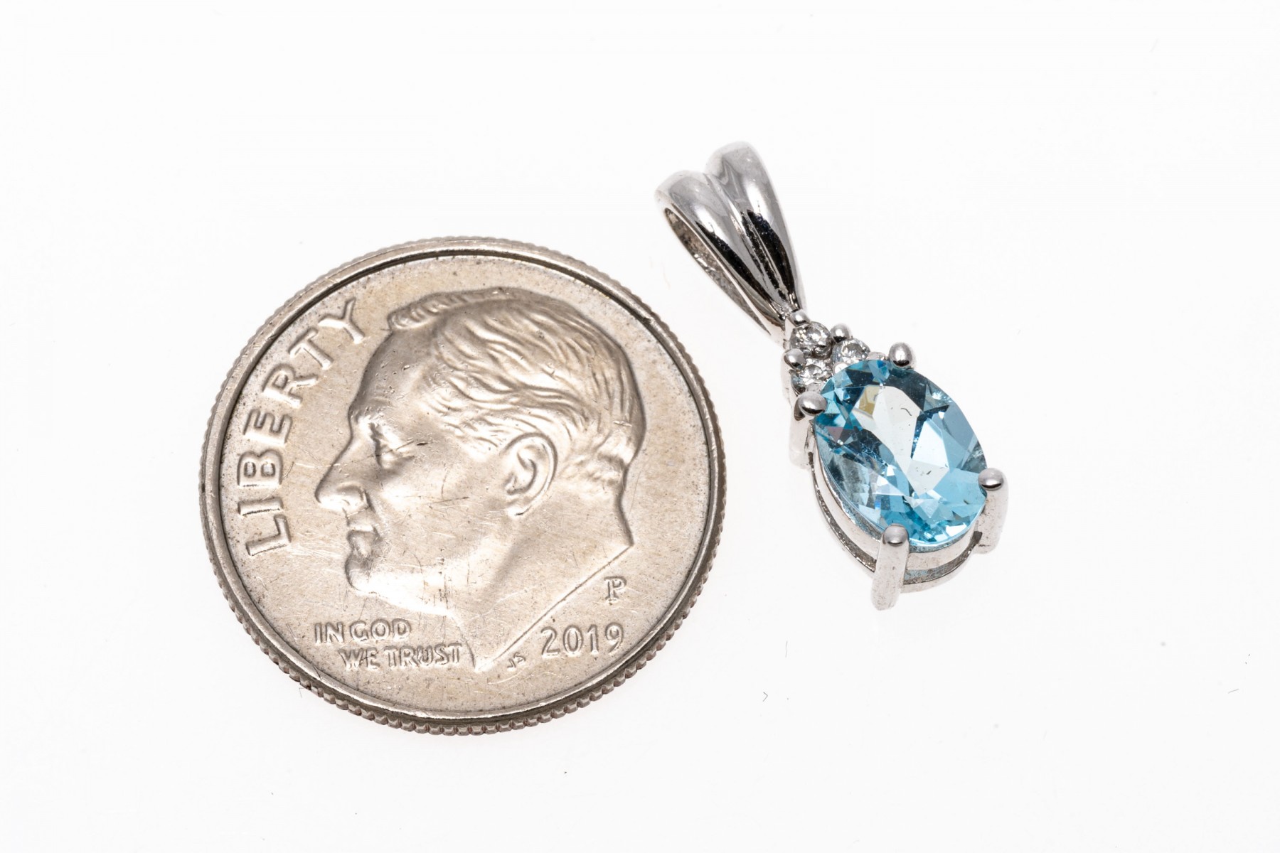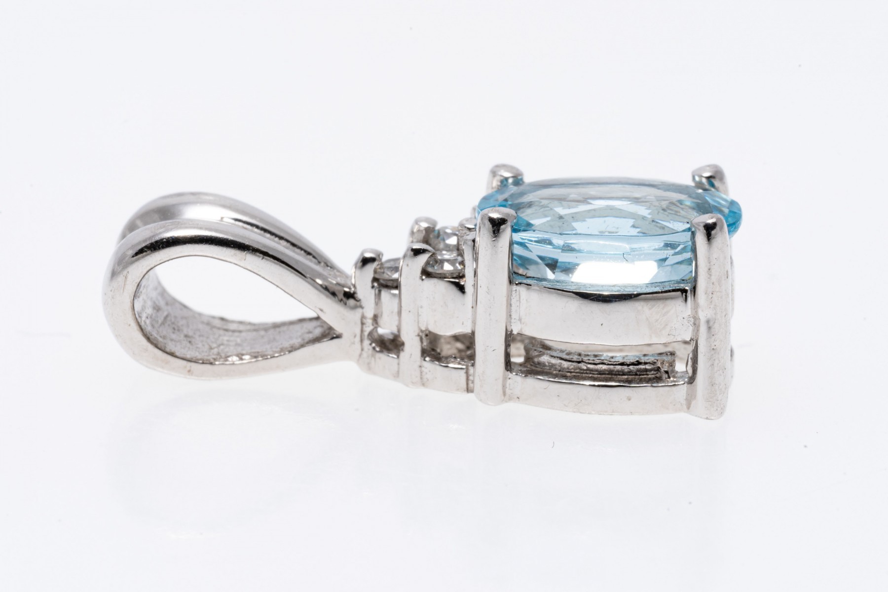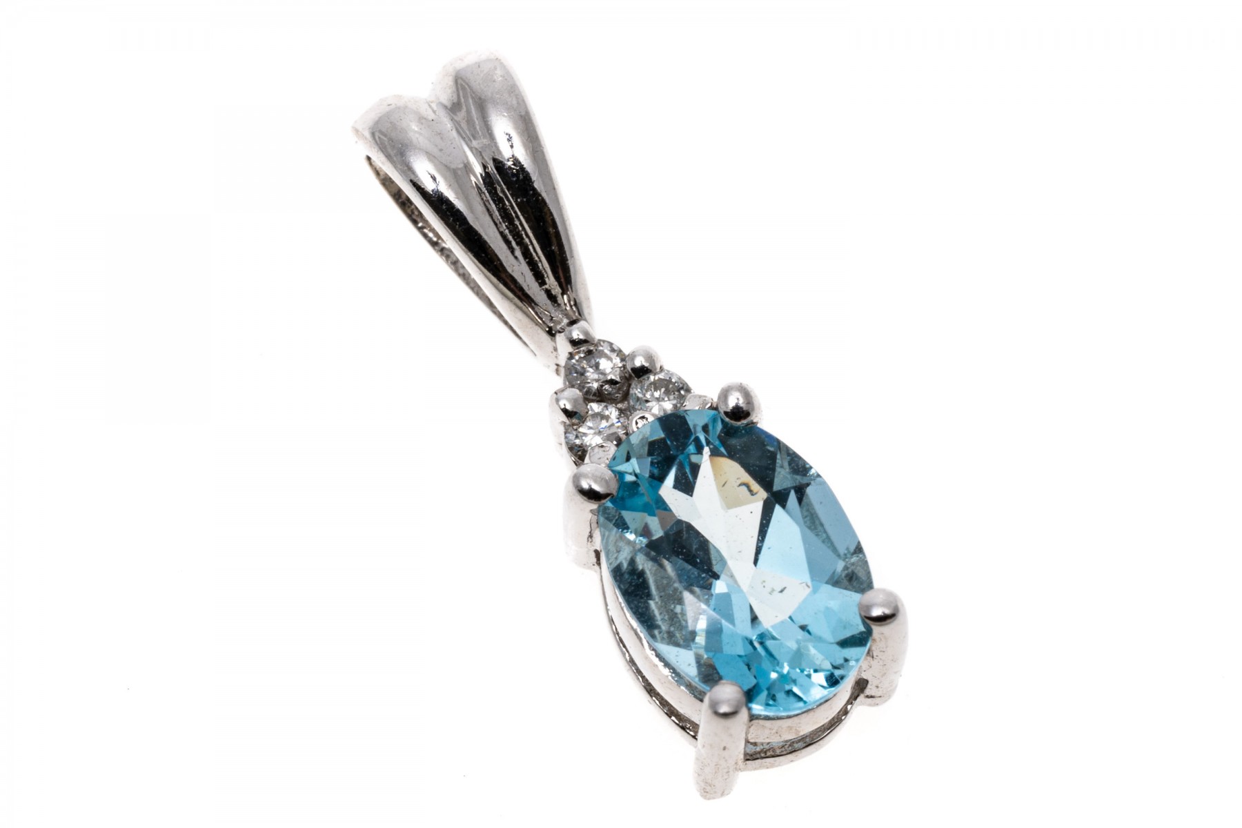 14k white gold pendant. This pretty and simple white gold pendant is set with a center, oval faceted, light blue color aquamarine, approximately 0.61 CTS, prong set and accented at the top with a cluster of round faceted diamonds, approximately 0.015 TCW, and also prong set. The pendant is finished by a ribbed style bale