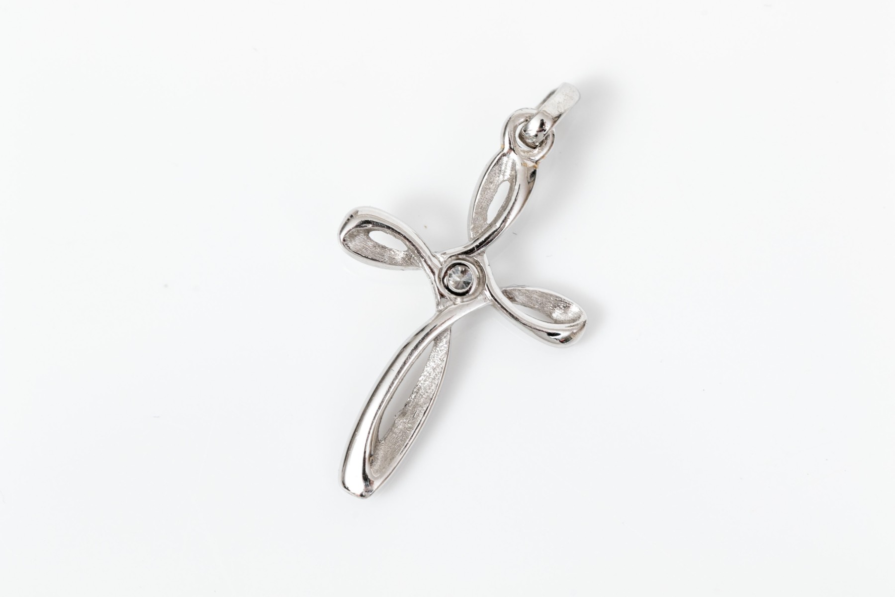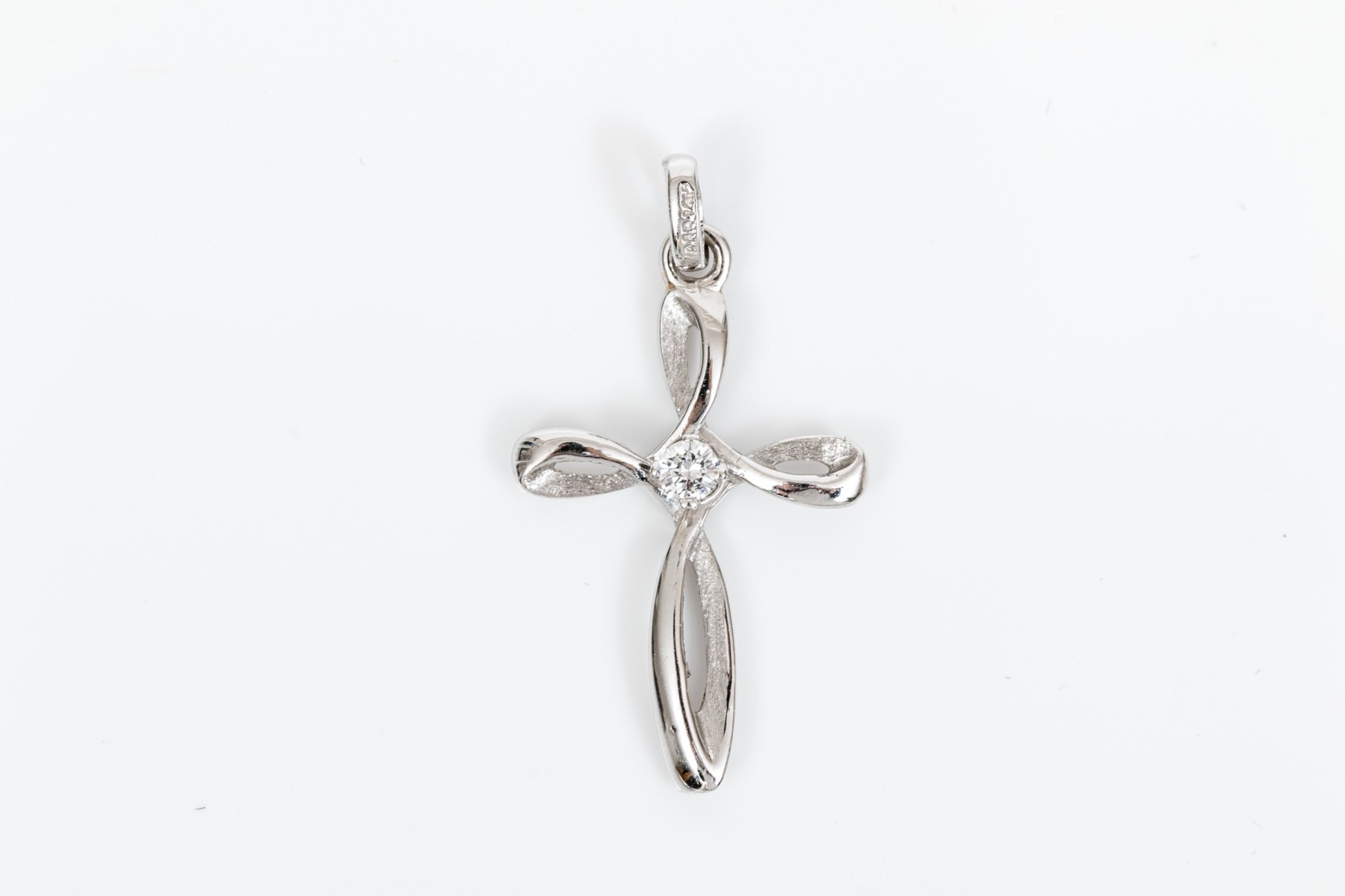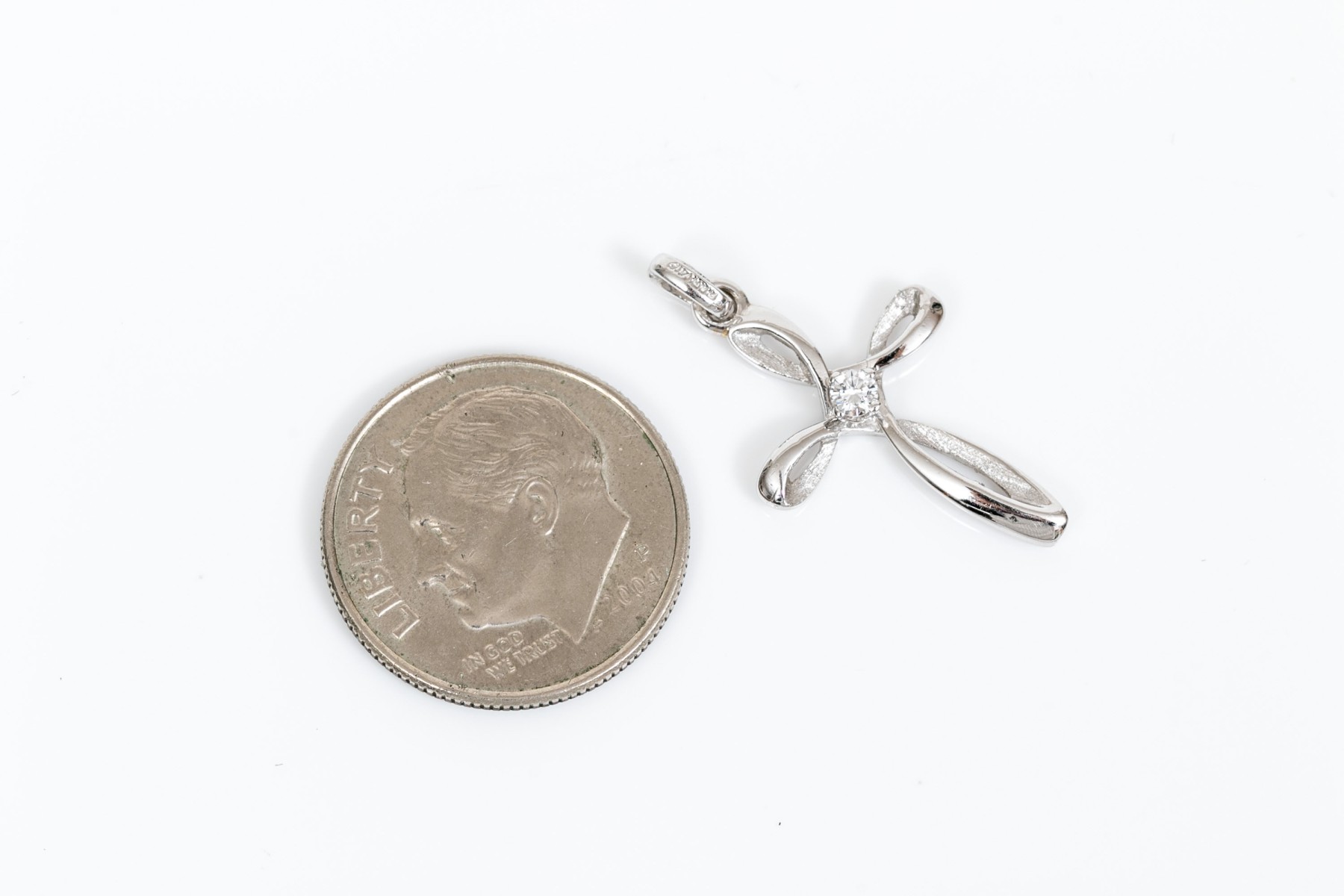 14k white gold pretty contemporary swirled cross, white sapphire center, finished with a solid bale