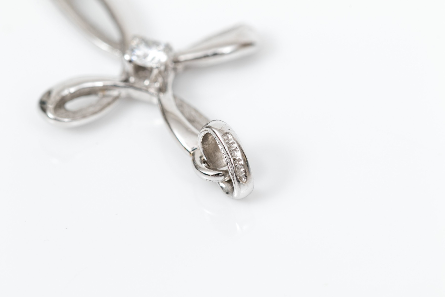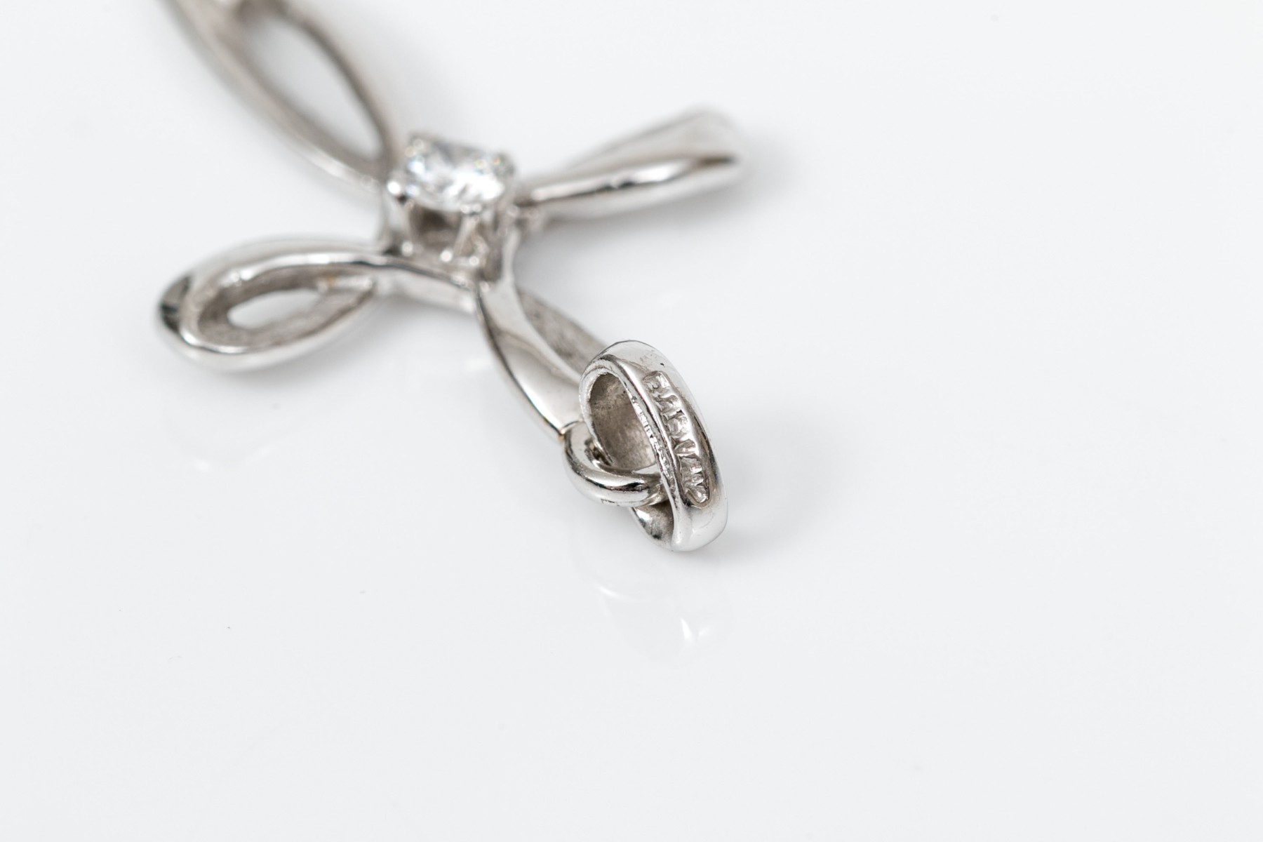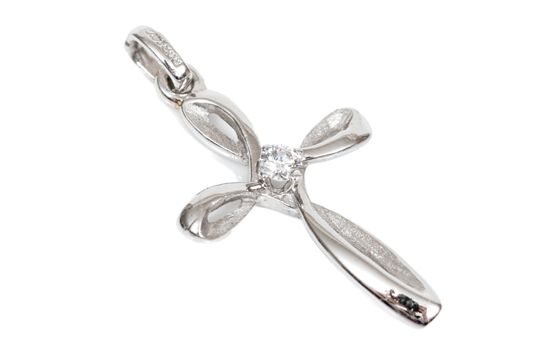 14k white gold pretty contemporary swirled cross, white sapphire center, finished with a solid bale
